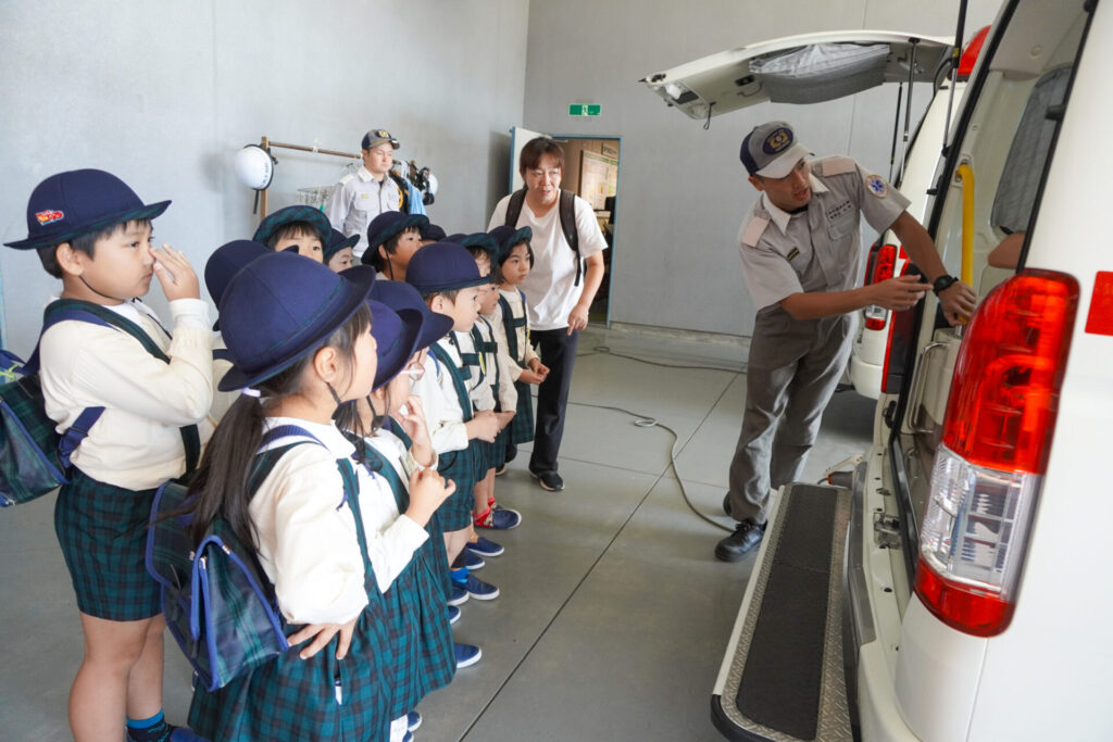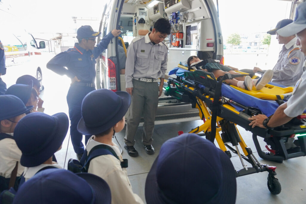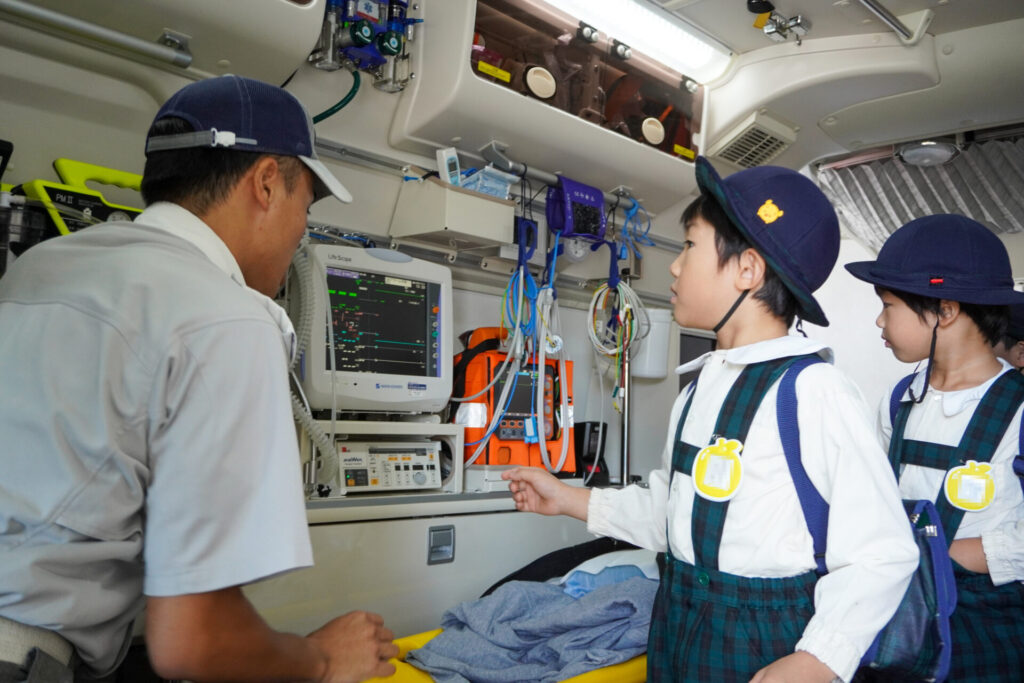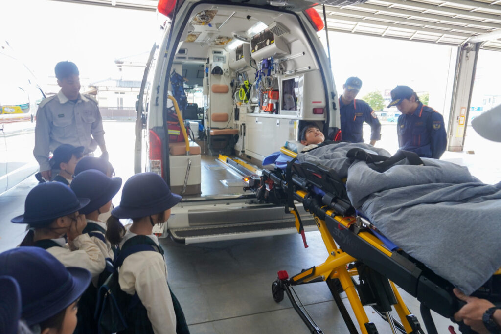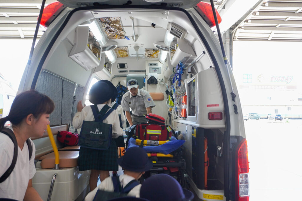 続いて、車両見学です。「救急車」の中に実際に乗せていただき、車内に積載されているたくさんの医療器具・道具を見せていただきました。上にも左右にも、医療器具でいっぱいです。実際にストレッチャーの出し入れも見せていただきました。