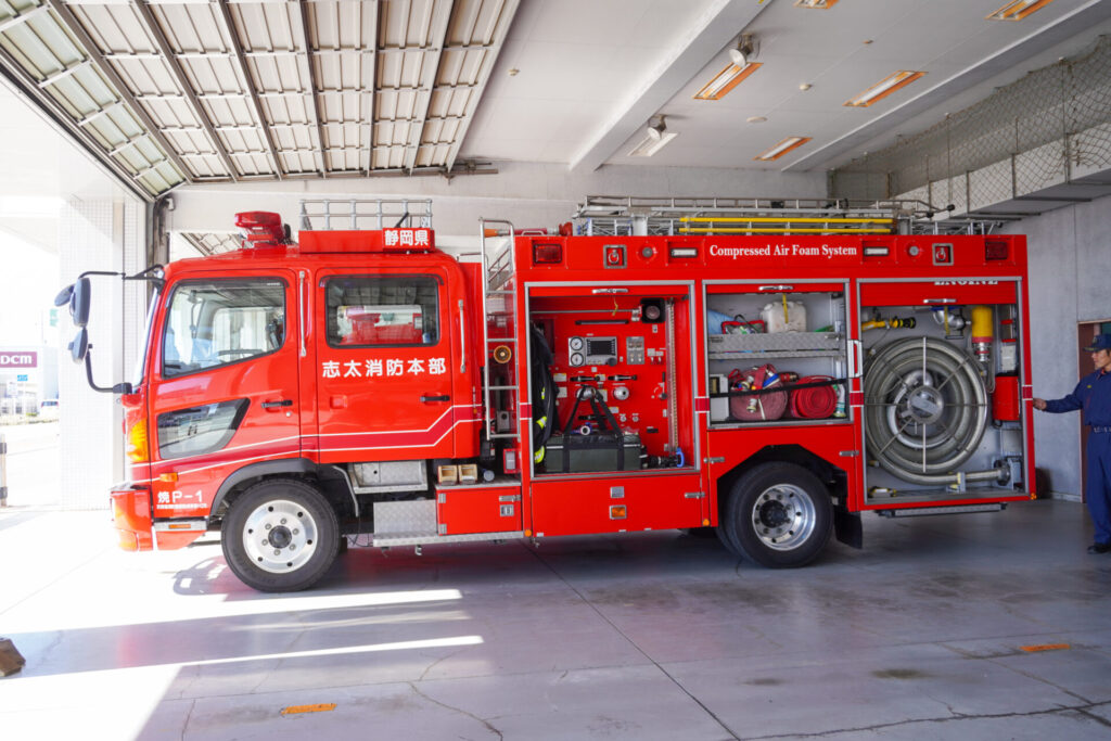 次は「消防車」です。火事発生時、高い建物や消防車が入りにくい場所でも対応できるように、水は約4,500リットルを積載、またホースは約20メートル伸びるそうです。