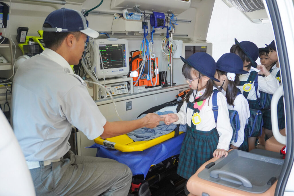 今日は特別に挙手した園児の中から代表でストレッチャーに乗せていただきました。臨場感溢れる体験ができました。