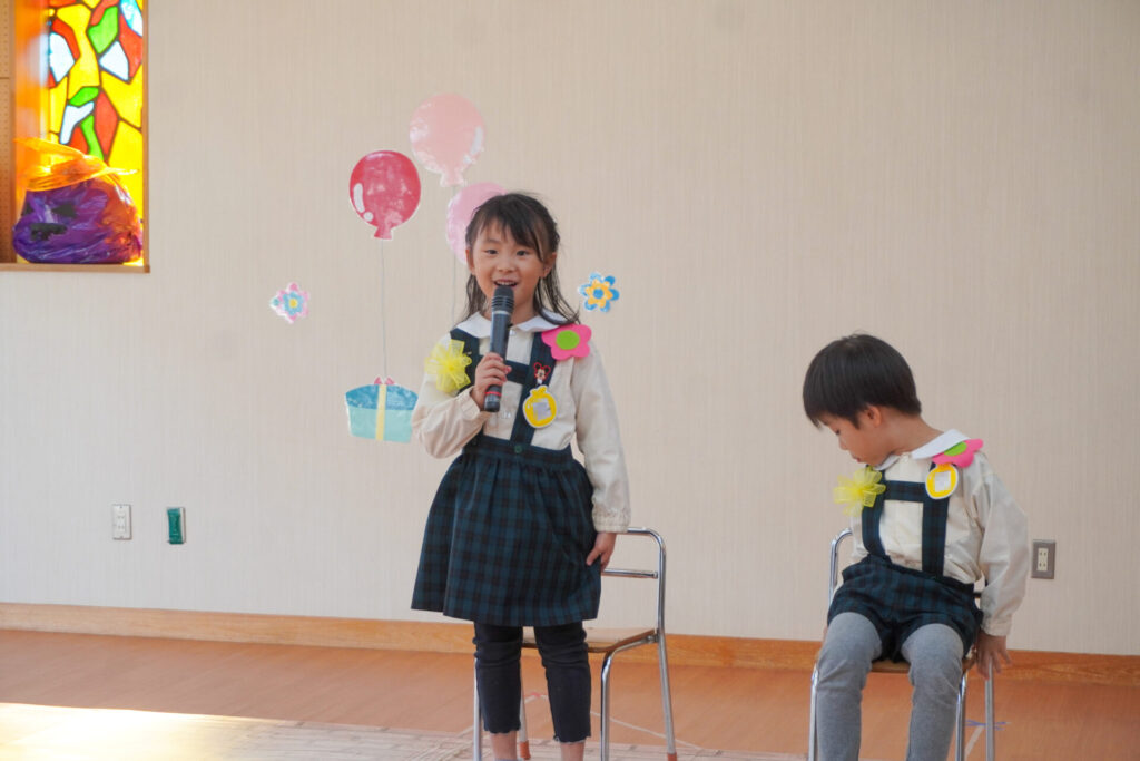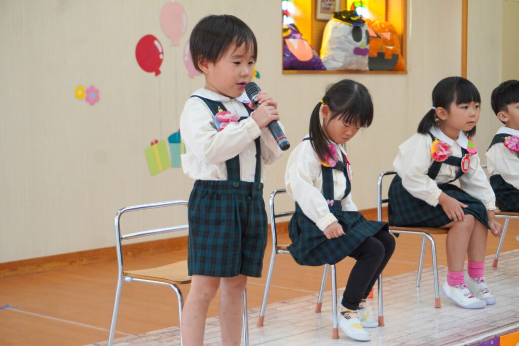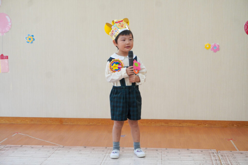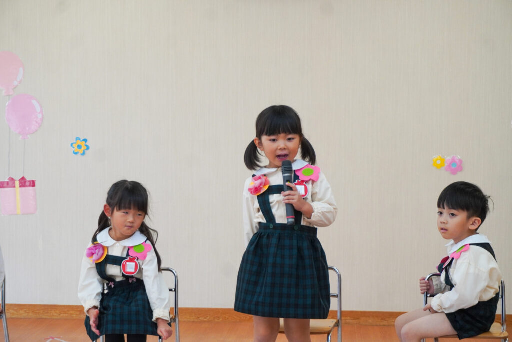 午前中はまどかっこ全員に、午後は保護者の方にお祝いしていただきました。自己紹介ではマイクを持って堂々と、自分の名前や年齢が言えました。拍手をたくさんもらい、「おめでとう!」と言ってもらえて、嬉しそうでした。