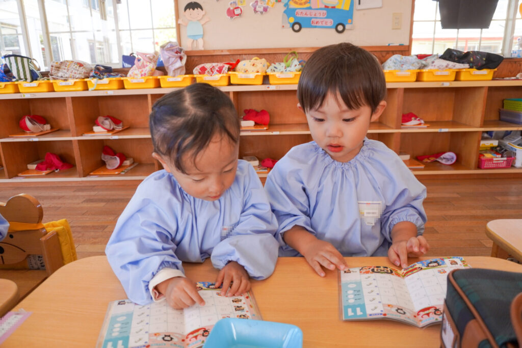 登園初日から、元気いっぱいです。「行ってきます!」と元気に挨拶ができ、バンビ組保育室へ入室ができました。朝は不安で泣いてしまった子もバンビ組保育室のおもちゃを見ると、手に取って遊び始めました。シール貼りも上手にできましたね。