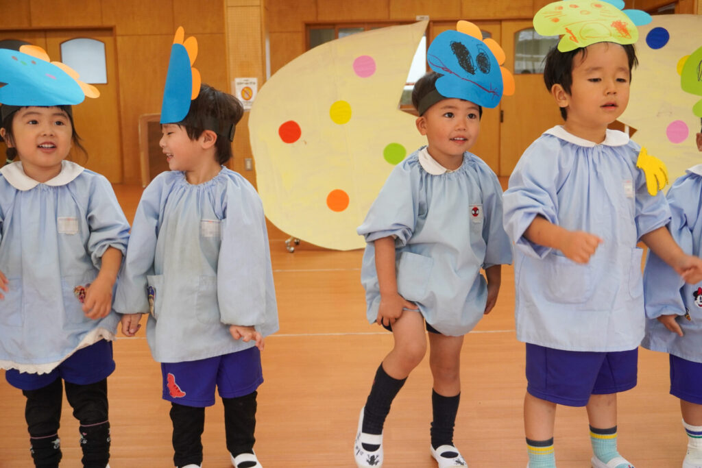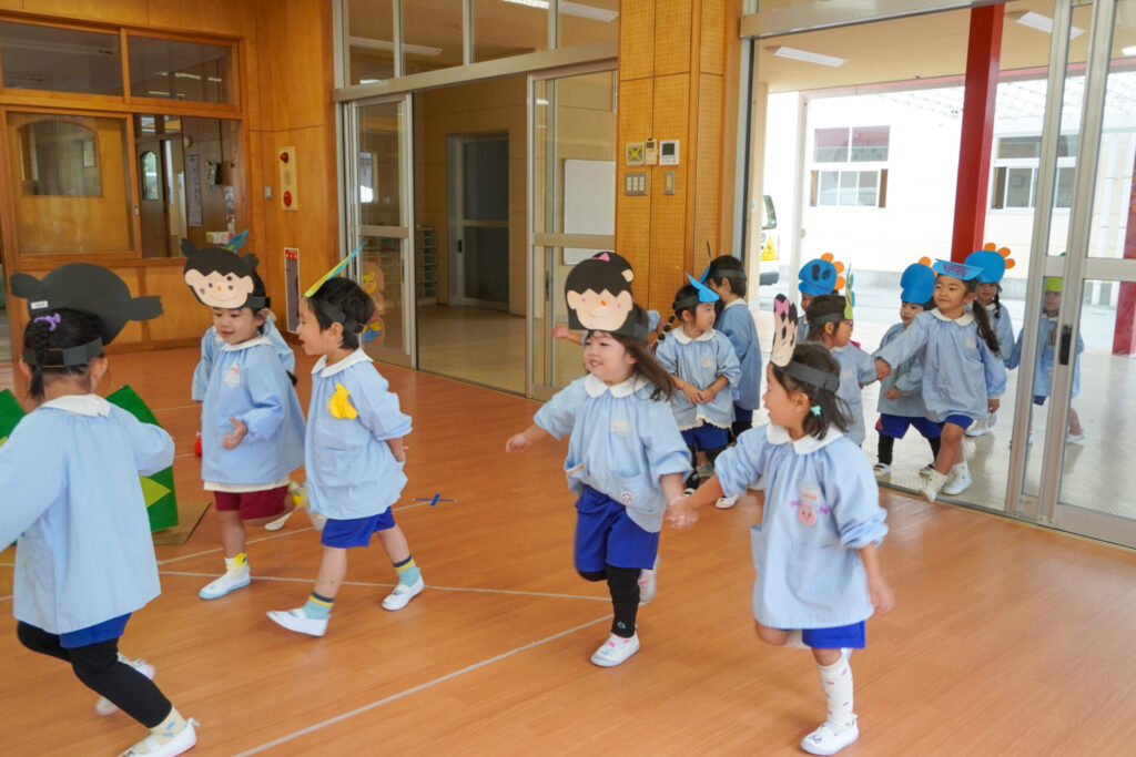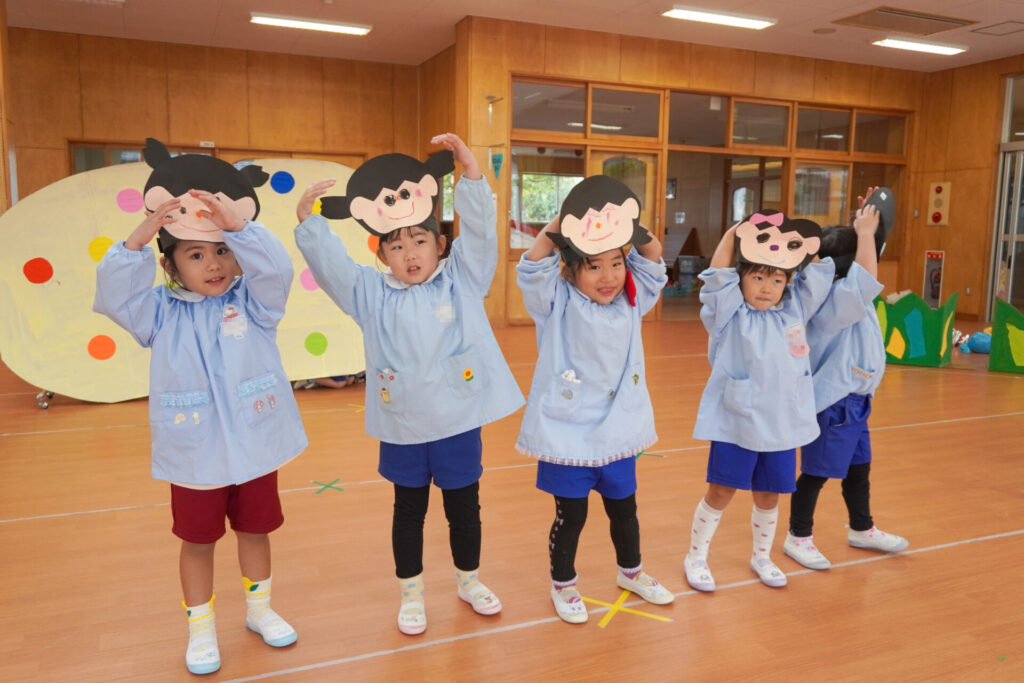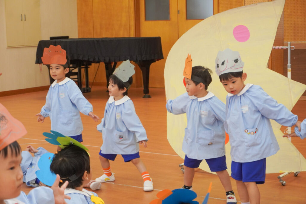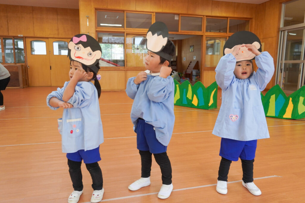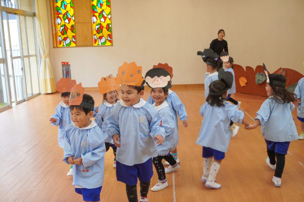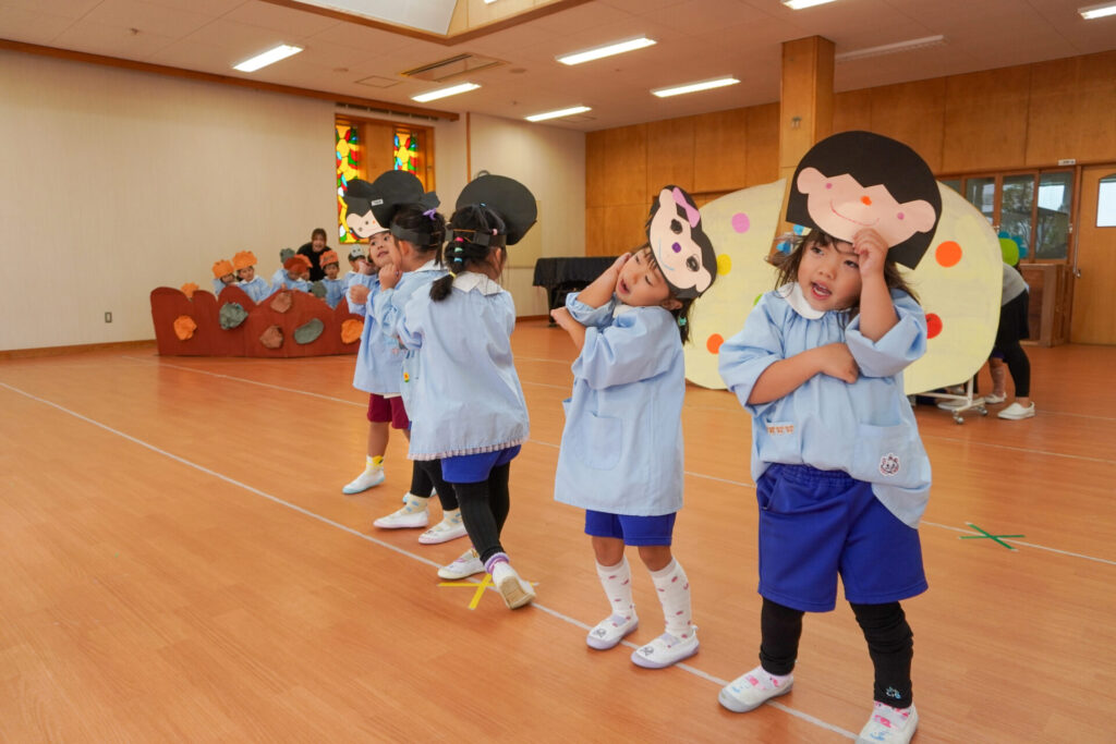 園での様子 劇遊び(年少) madokahp 2025年11月5日 年少ゆり組・ばら組がホールで劇遊びをしました。好きな役のお面をかぶって、元気いっぱい踊りました。役の特徴を表情や全身で表現しながら、広いホールを走り回りました。にこにこ元気いっぱいです! 今年も「焼津文化会館 大ホール」のステージで音楽発表会を予定しています。自信をもって発表できるようにたくさん励ましてあげたいです。明日も幼稚園で元気いっぱい遊びましょうね。