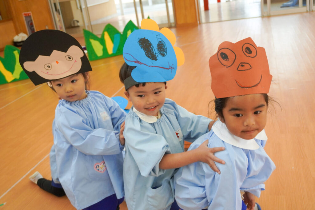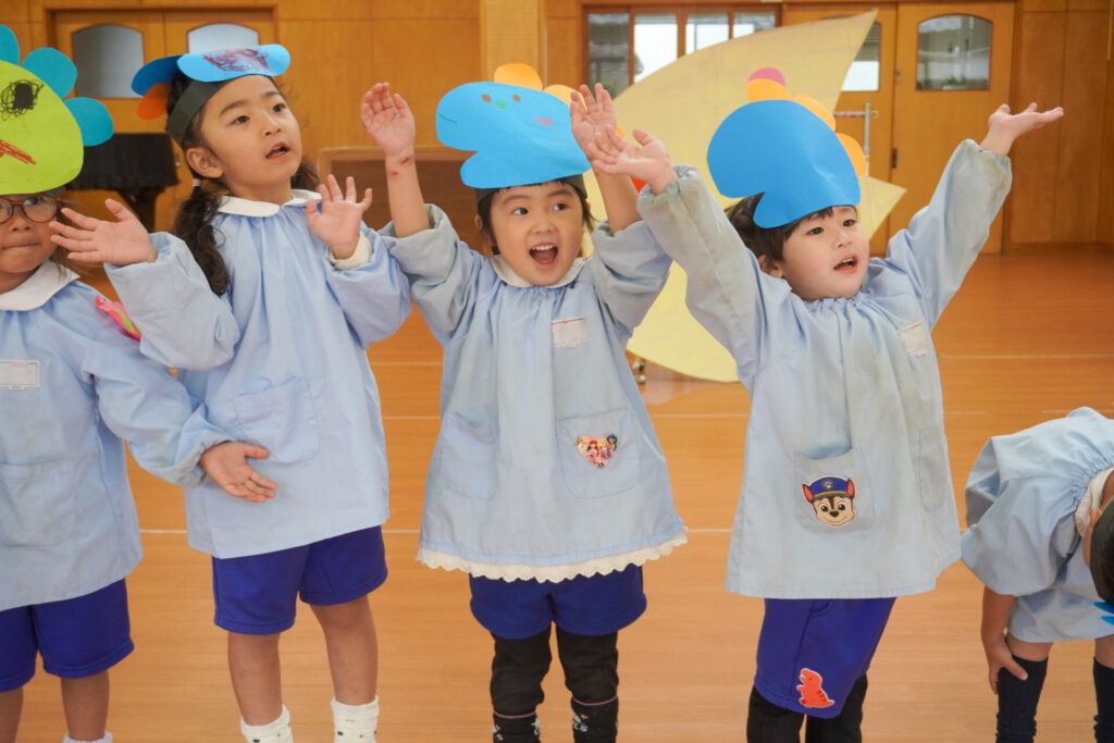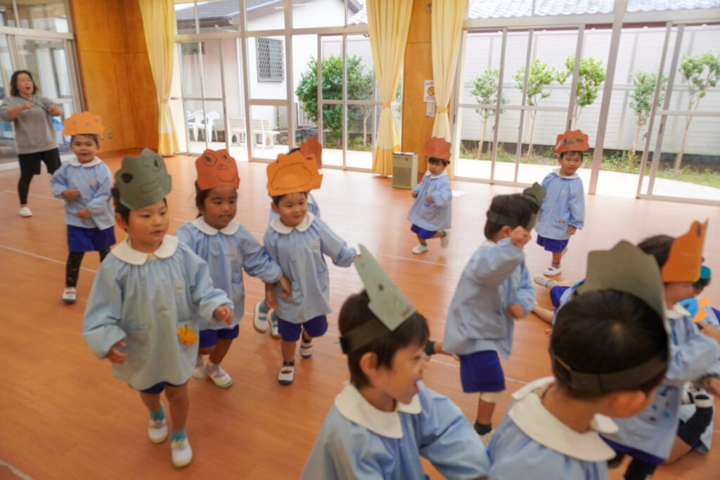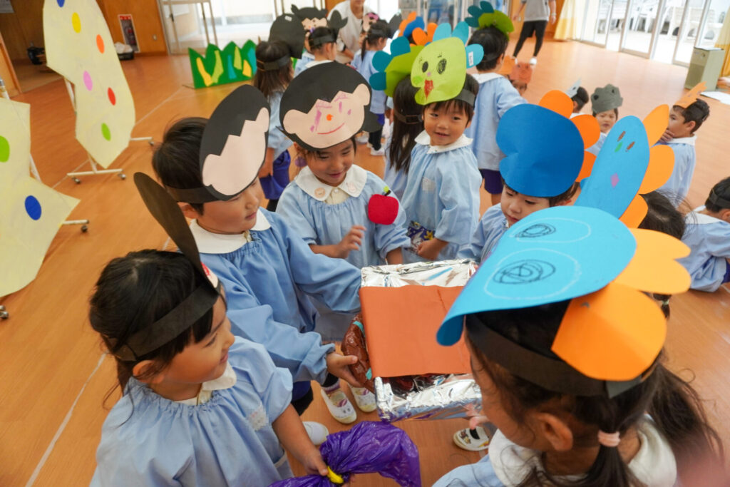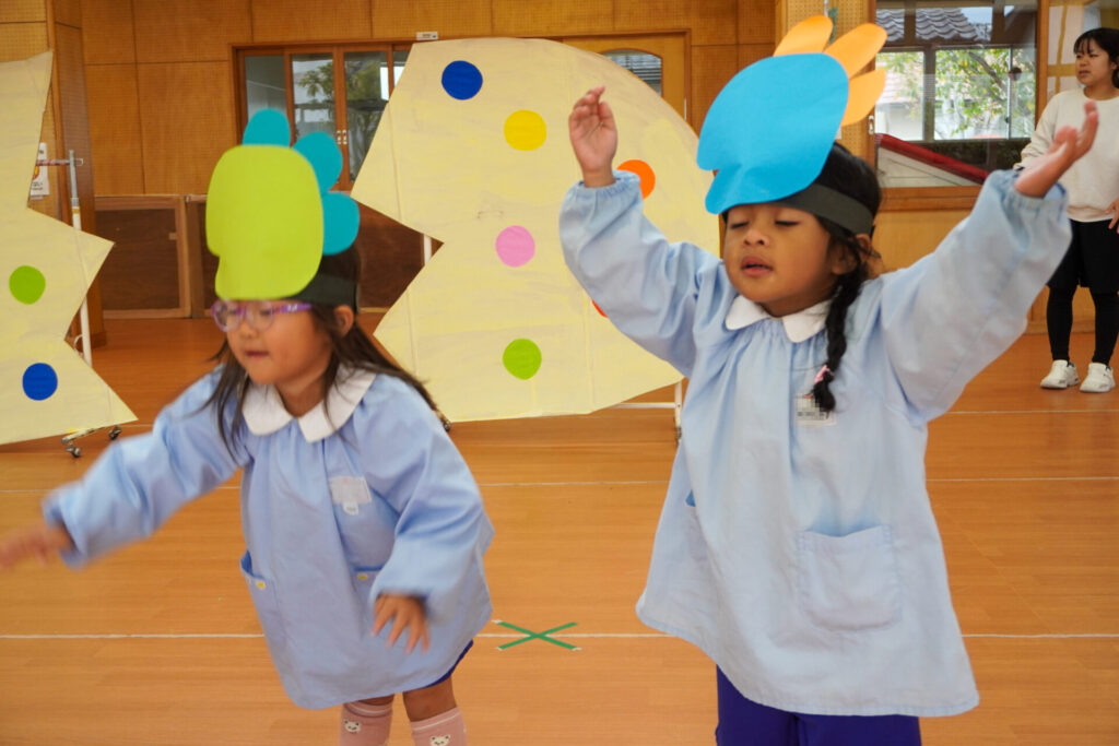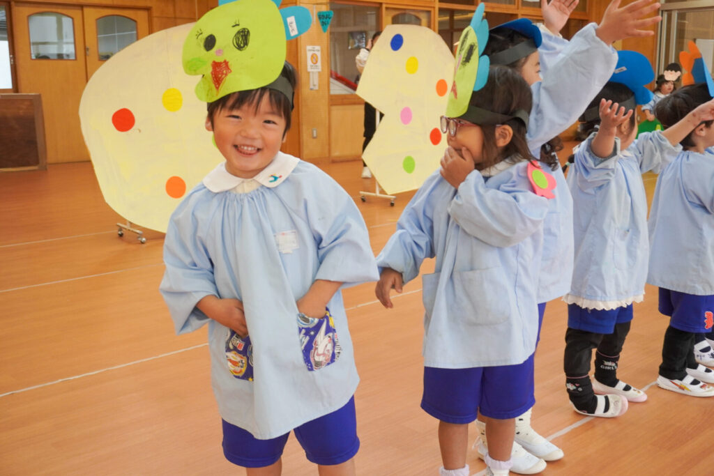園での様子 劇遊び(年少) madokahp 2025年11月5日 年少ゆり組・ばら組がホールで劇遊びをしました。好きな役のお面をかぶって、元気いっぱい踊りました。役の特徴を表情や全身で表現しながら、広いホールを走り回りました。にこにこ元気いっぱいです! 今年も「焼津文化会館 大ホール」のステージで音楽発表会を予定しています。自信をもって発表できるようにたくさん励ましてあげたいです。明日も幼稚園で元気いっぱい遊びましょうね。