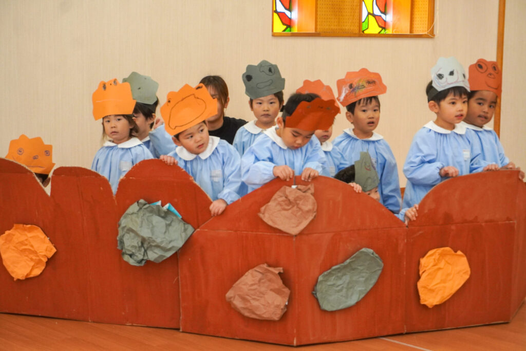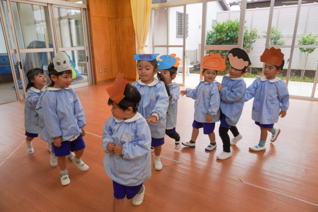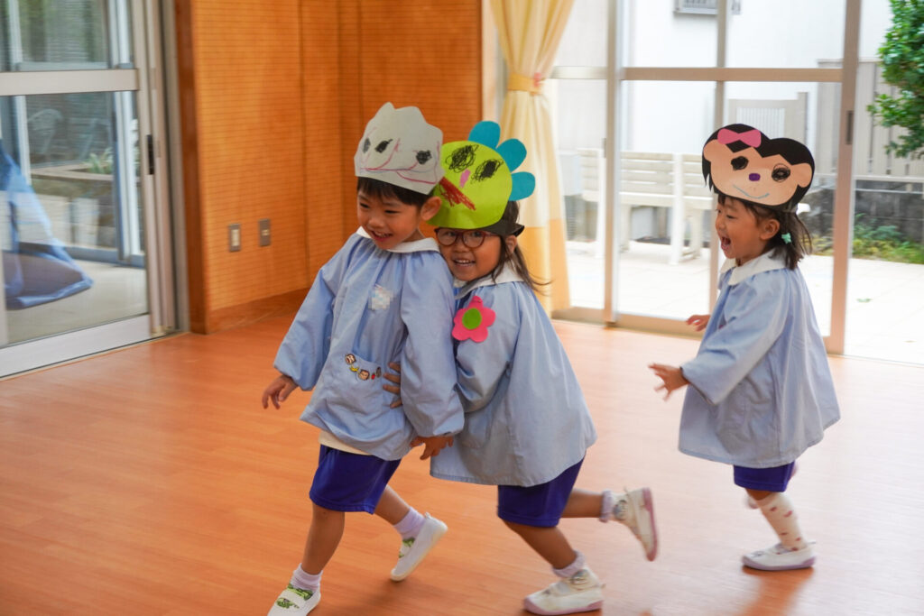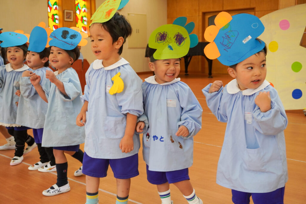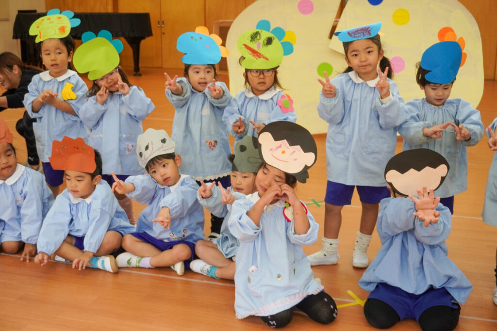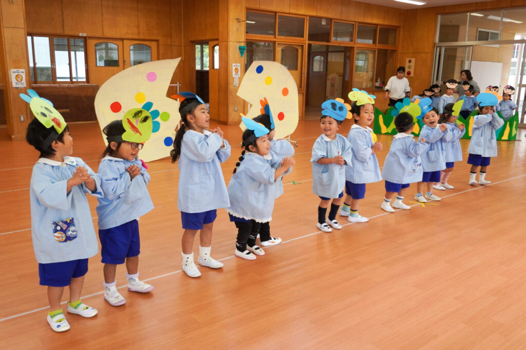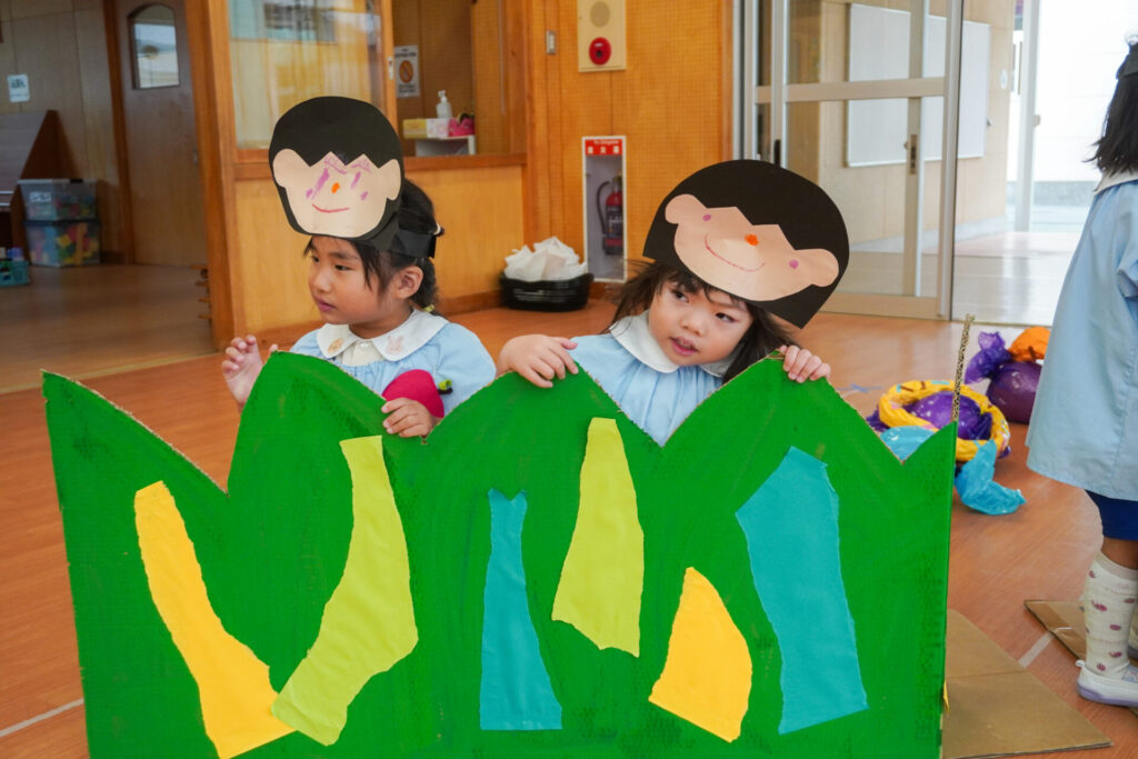 園での様子 劇遊び(年少) madokahp 2025年11月5日 年少ゆり組・ばら組がホールで劇遊びをしました。好きな役のお面をかぶって、元気いっぱい踊りました。役の特徴を表情や全身で表現しながら、広いホールを走り回りました。にこにこ元気いっぱいです! 今年も「焼津文化会館 大ホール」のステージで音楽発表会を予定しています。自信をもって発表できるようにたくさん励ましてあげたいです。明日も幼稚園で元気いっぱい遊びましょうね。