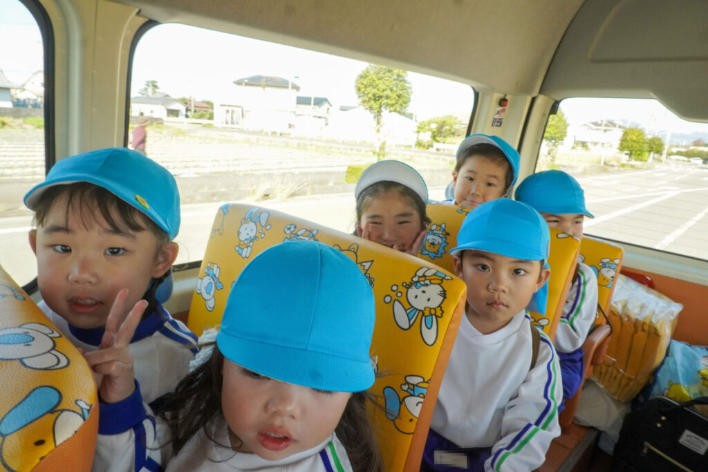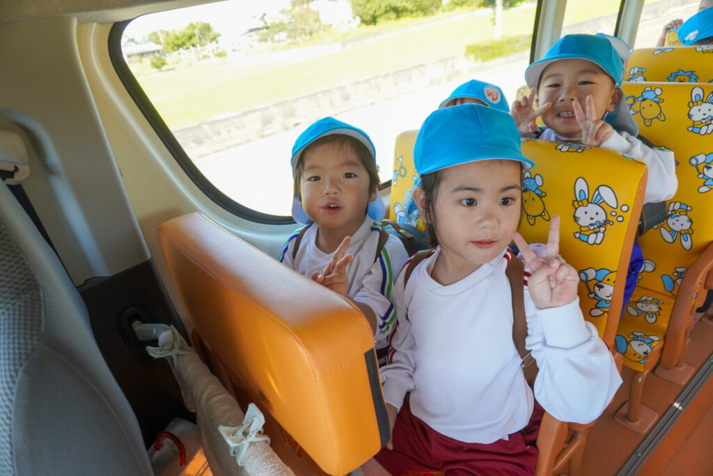 年少ゆり組がスクールバスに乗って、バス遠足に出かけました。行き先は「吉田公園」です。「早く行きたい!」と、とても楽しみにしていました。スクールバスに乗って、元気に出発です!