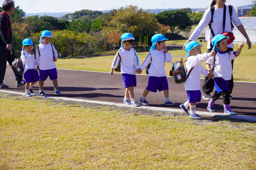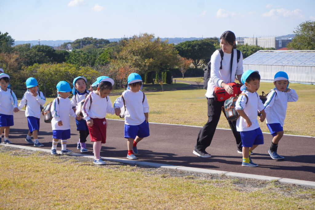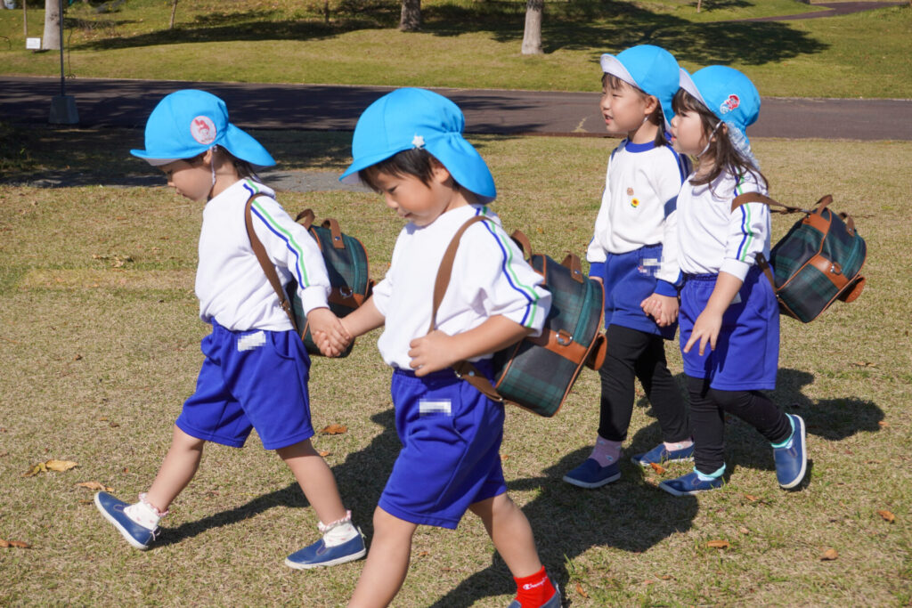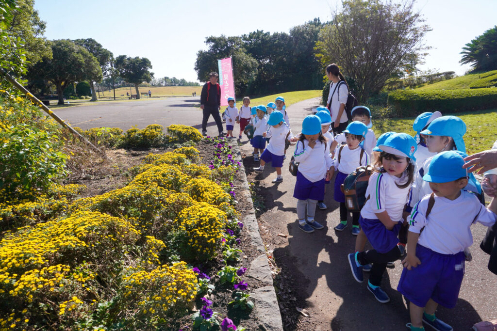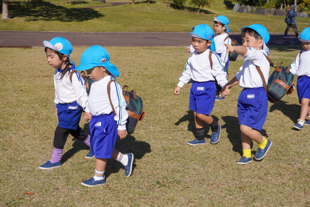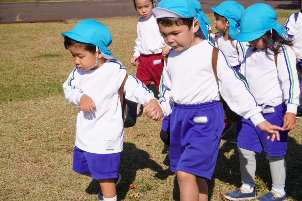 「吉田公園」は緑がいっぱいの公園です。2列に並んで芝生広場に向けて歩きました。今日はペアの友だちと手をつないで歩きます。2人1組で並んで歩くことが上手になりました。