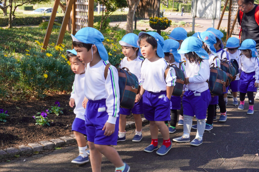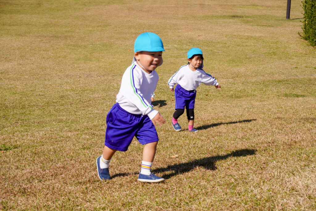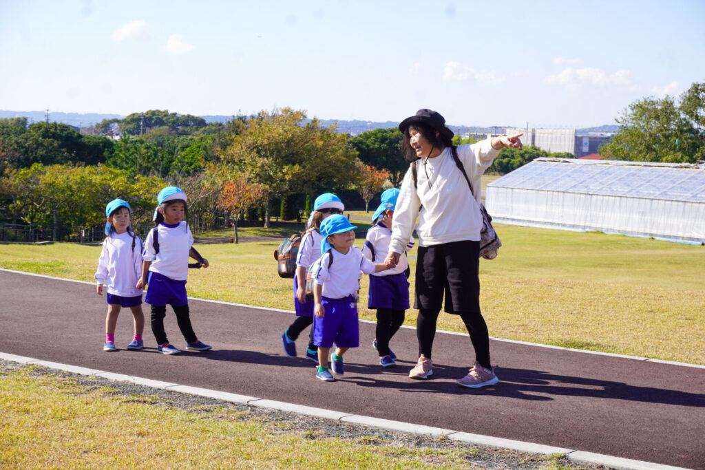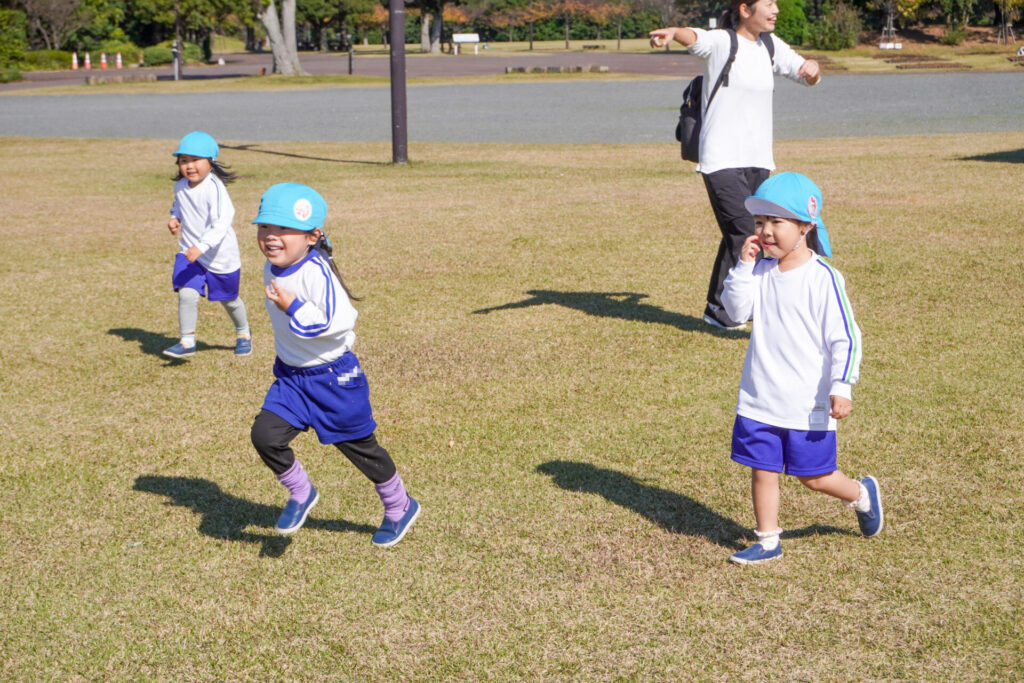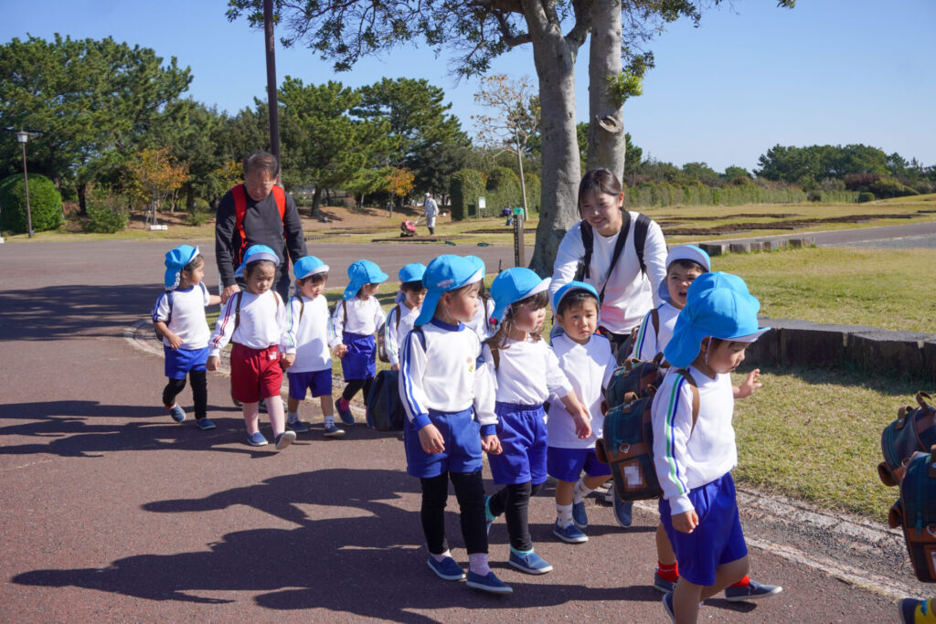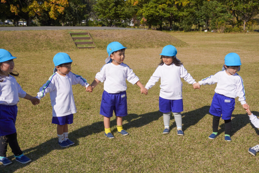 「吉田公園」は緑がいっぱいの公園です。2列に並んで芝生広場に向けて歩きました。今日はペアの友だちと手をつないで歩きます。2人1組で並んで歩くことが上手になりました。