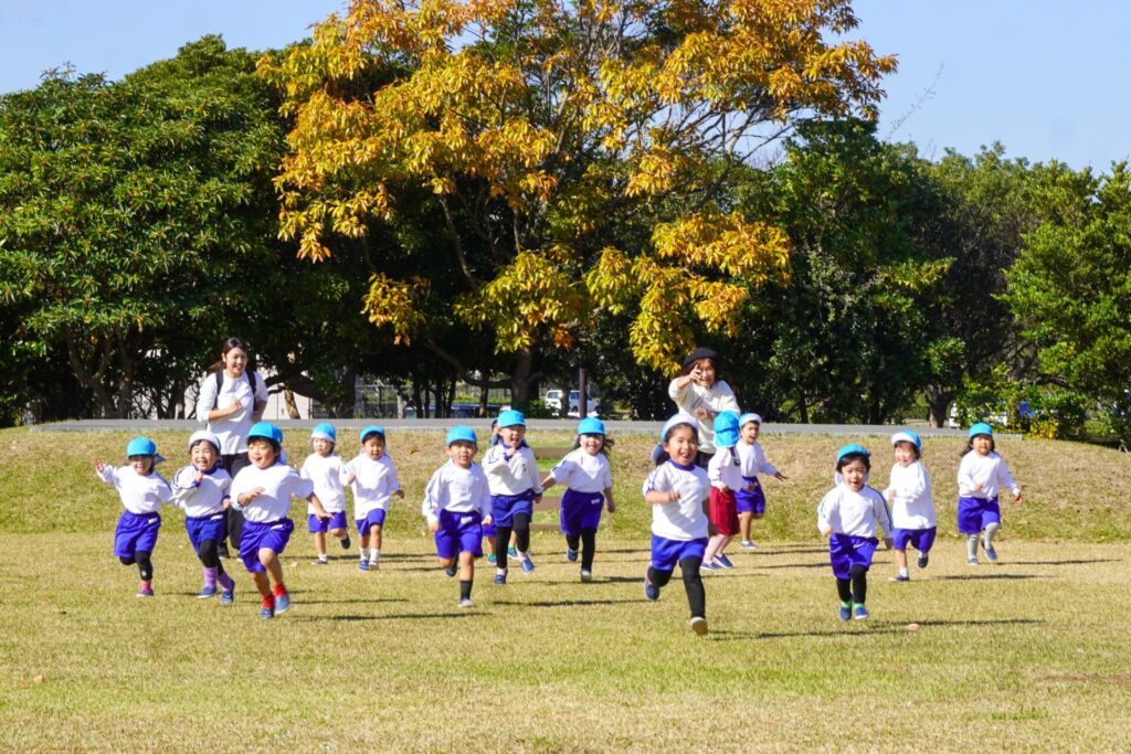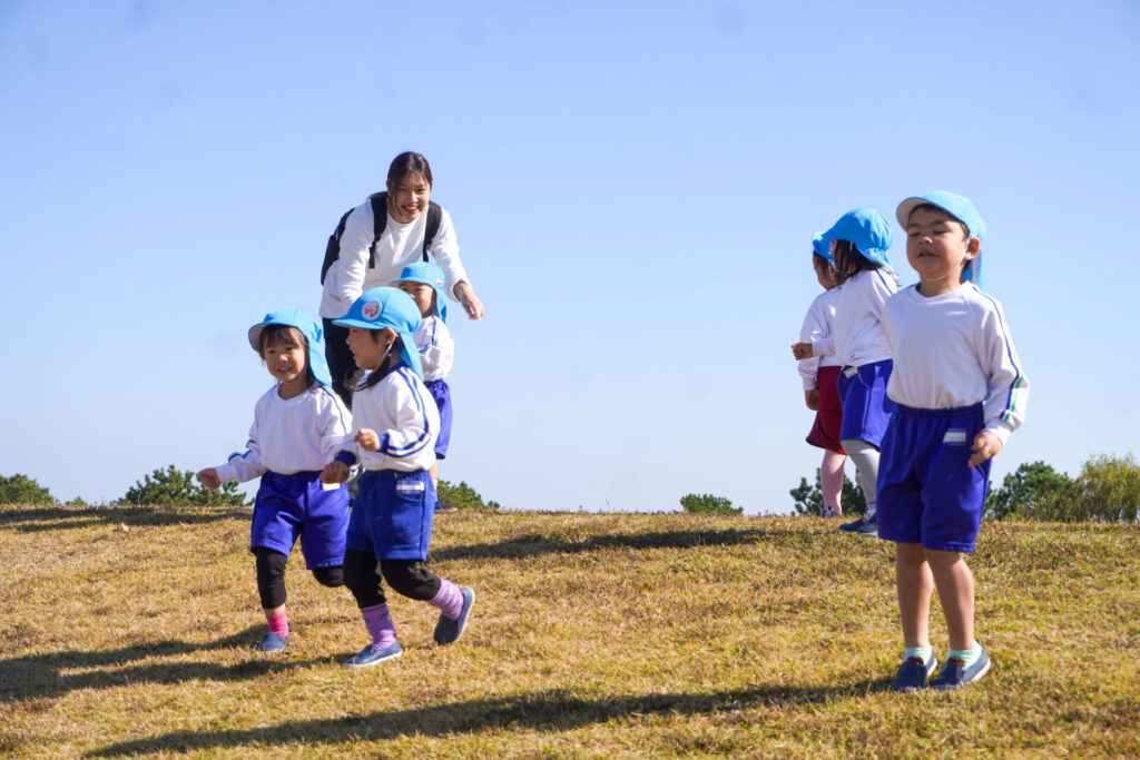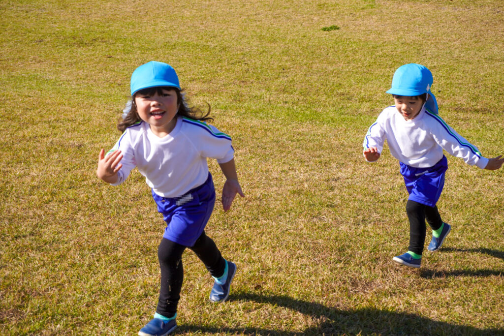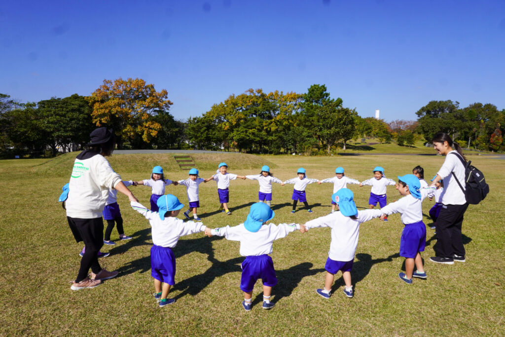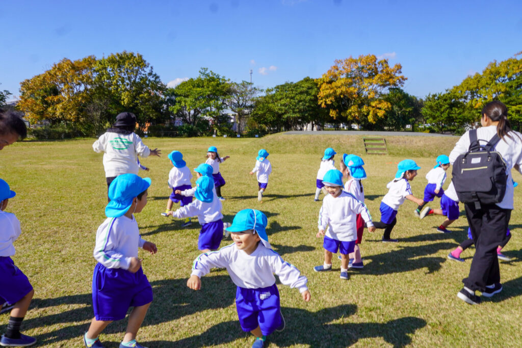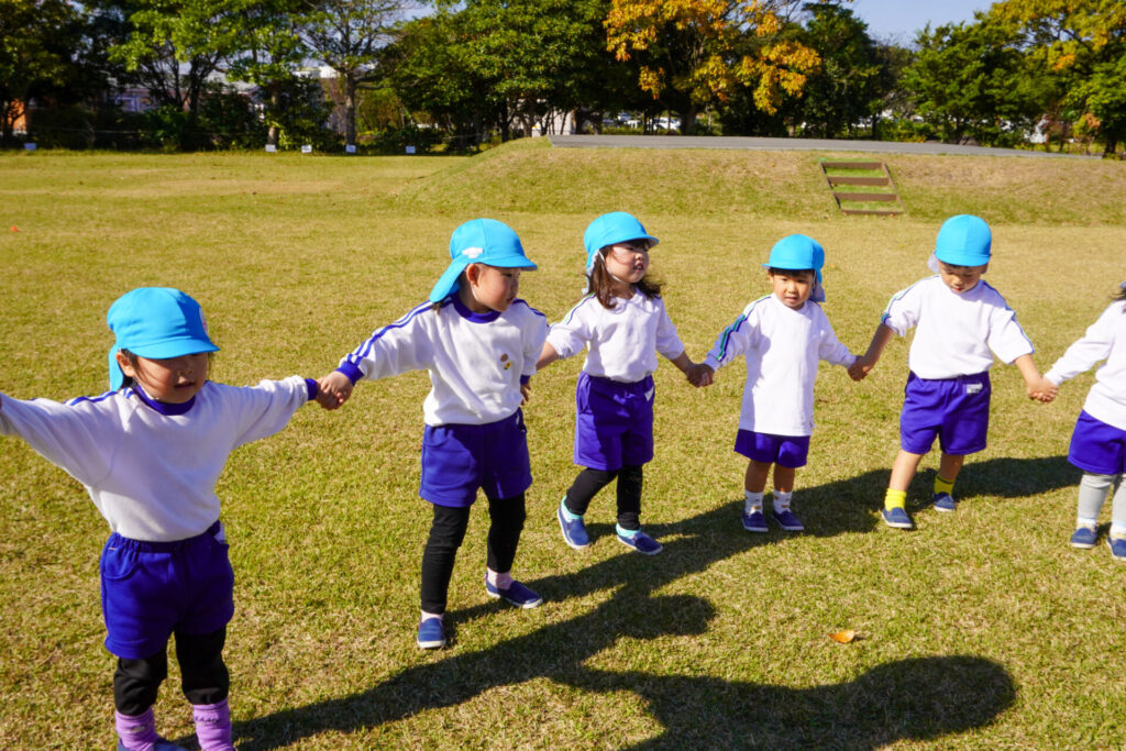 「吉田公園」は緑がいっぱいの公園です。2列に並んで芝生広場に向けて歩きました。今日はペアの友だちと手をつないで歩きます。2人1組で並んで歩くことが上手になりました。