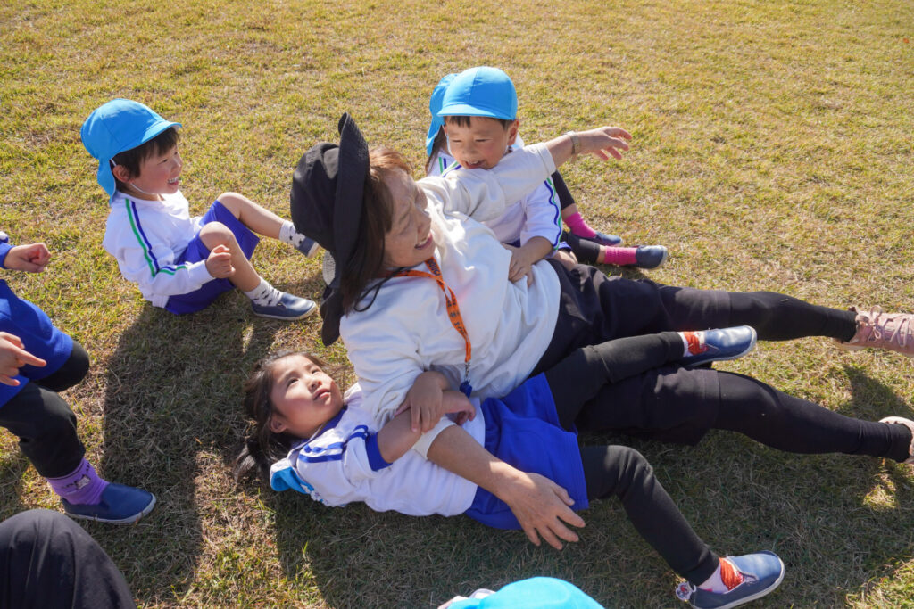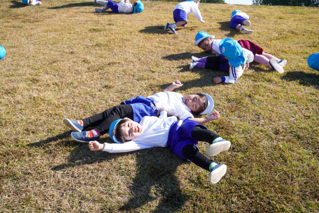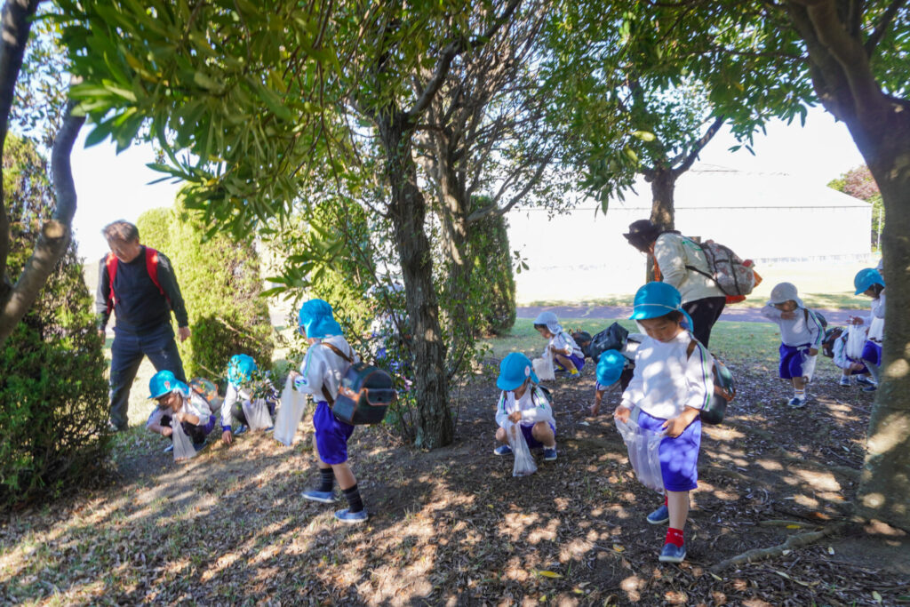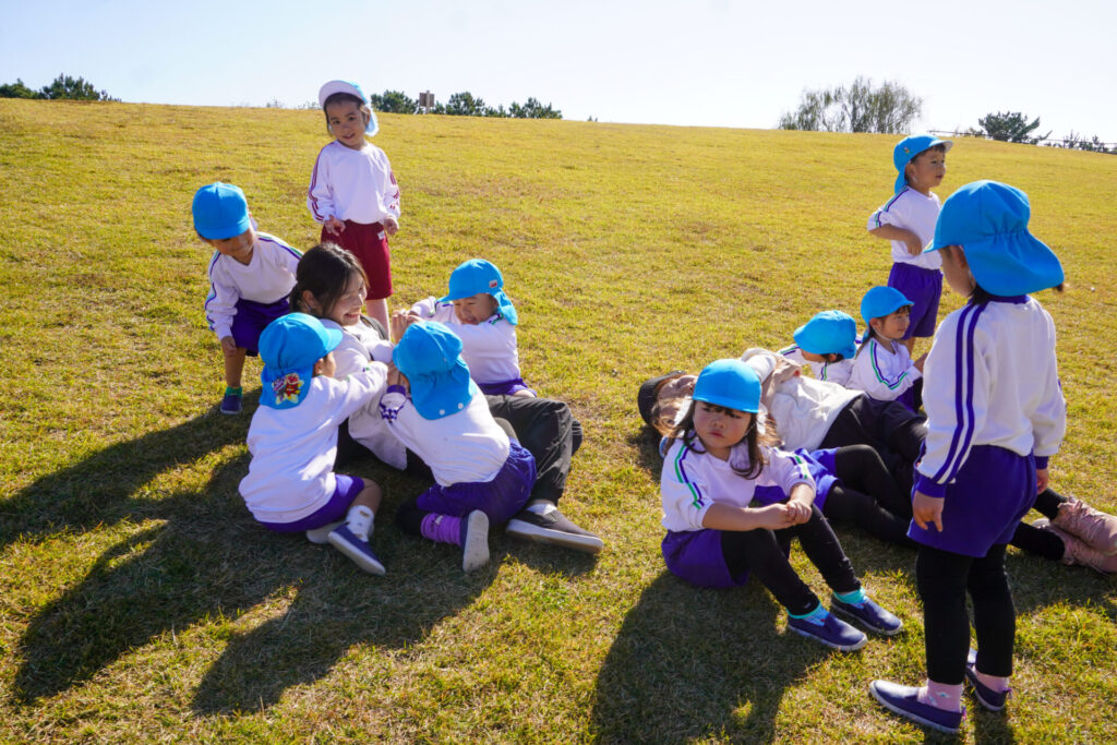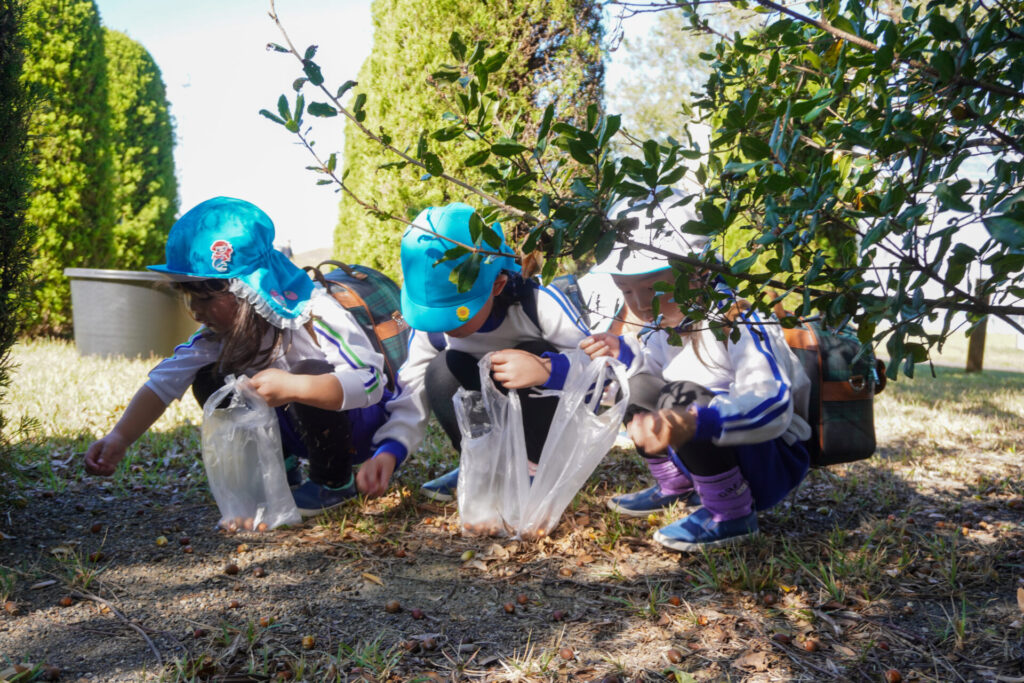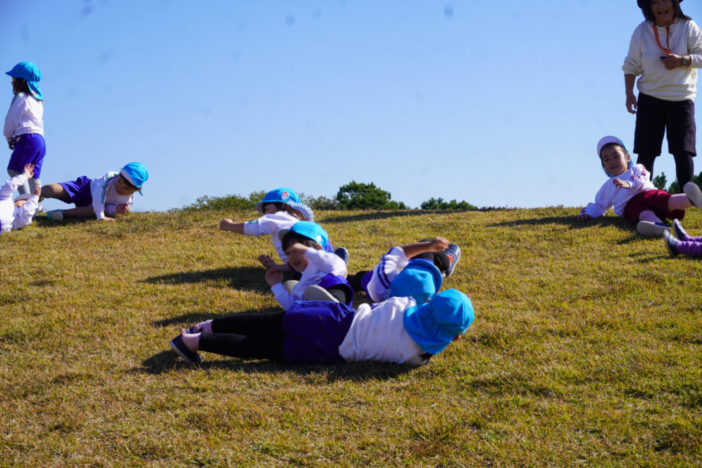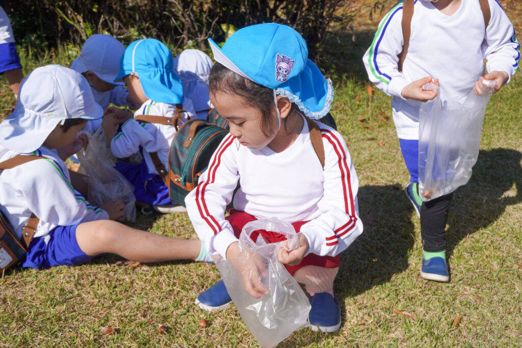 芝生広場では坂を上ったり、下りたり、ゴロゴロ転がったり、みんなでかけっこをしたり…めいっぱい走り回りました。「むっくりくまさんごっこ」も楽しかったですね。公園内には「木の実」もいっぱいでした。たくさん拾って、お土産袋もすぐに満杯になりました。