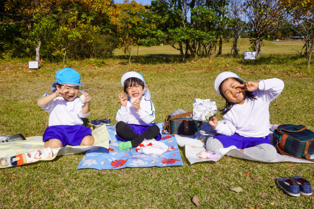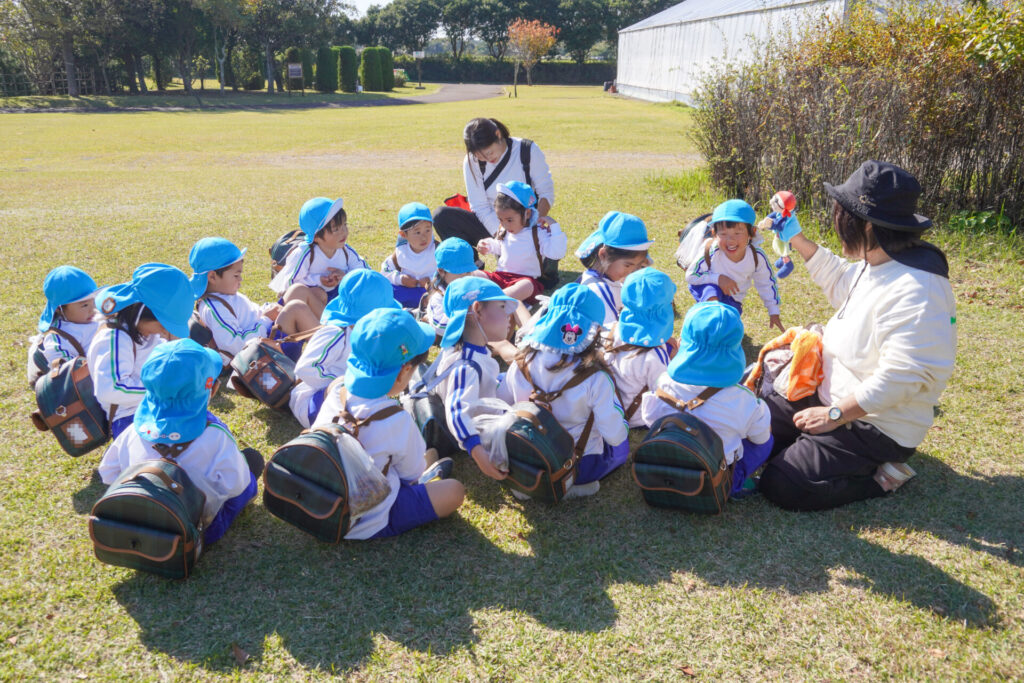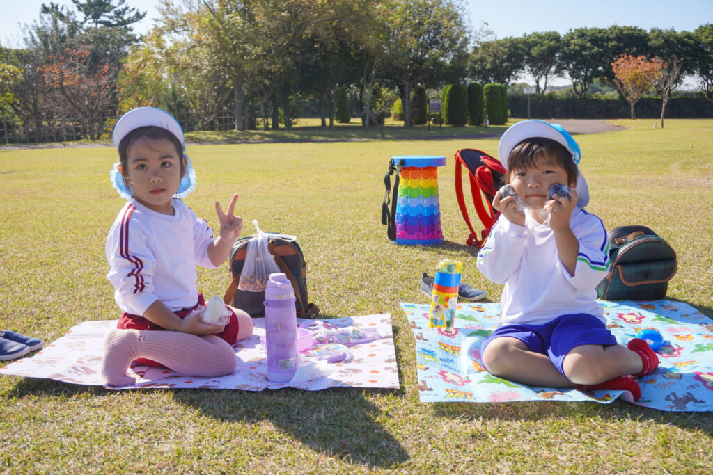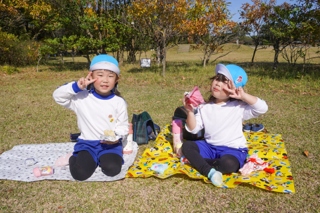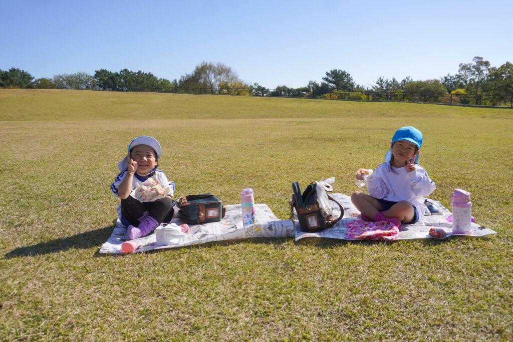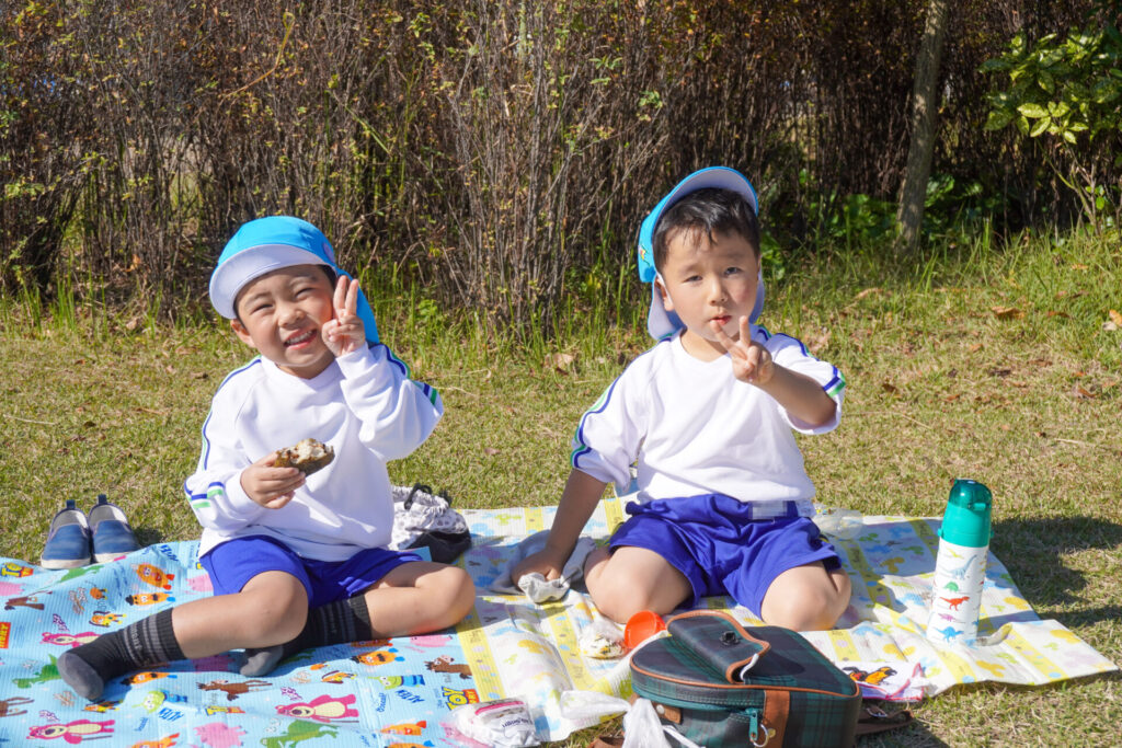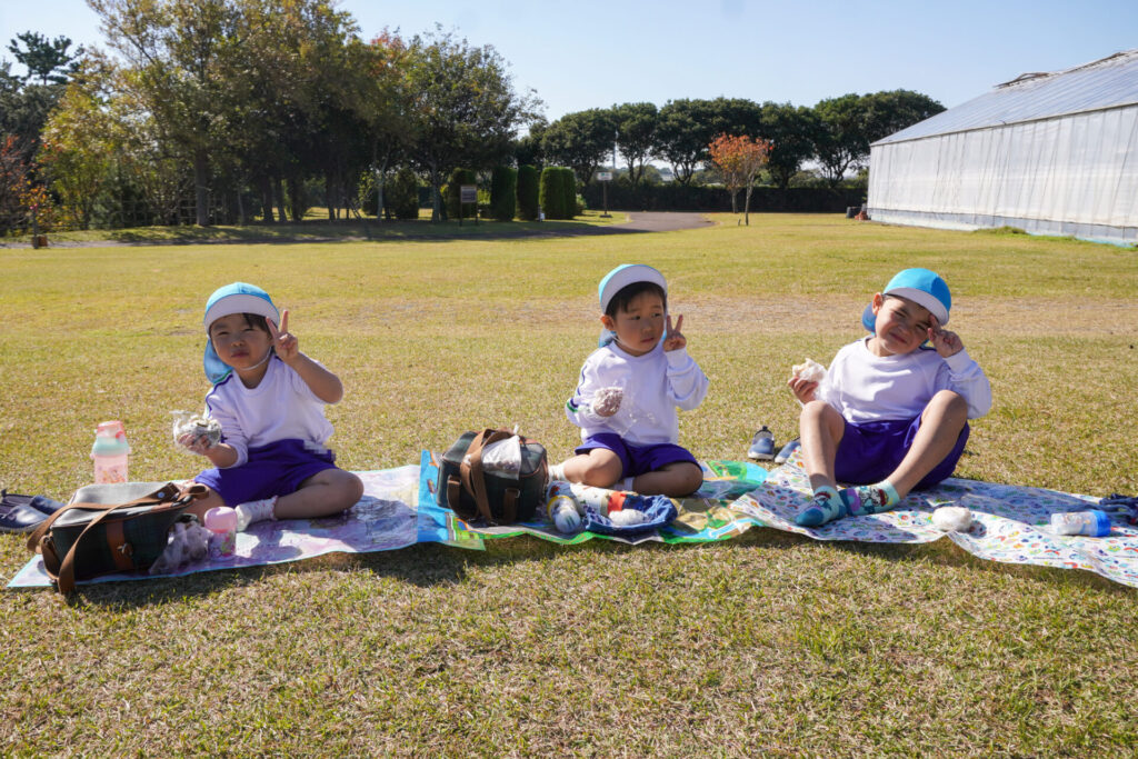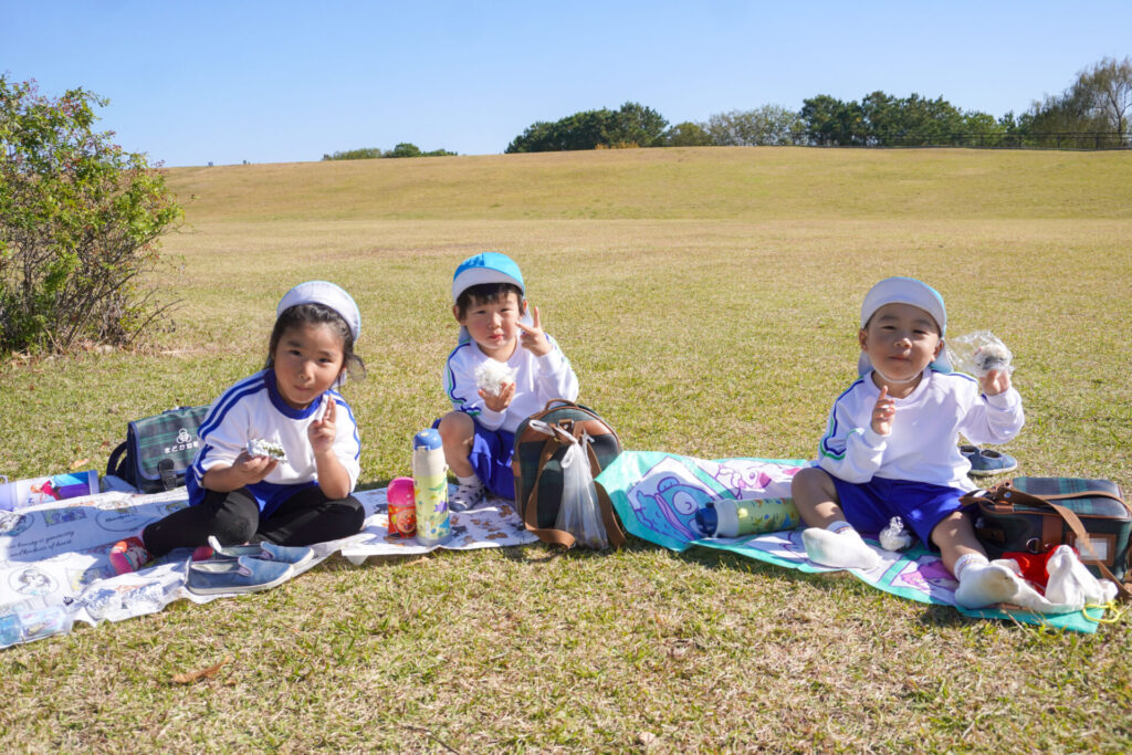 昼食は芝生広場でとりました。通園かばんから「おにぎり」と「シート」を取り出しました。自分のシートで食べられることが嬉しく、支度も進みました。お昼はおうちの方が作ってくれた「おにぎり」です。ゆり組全員で円になって食べるととてもおいしいですね。あっという間にお腹の中です。