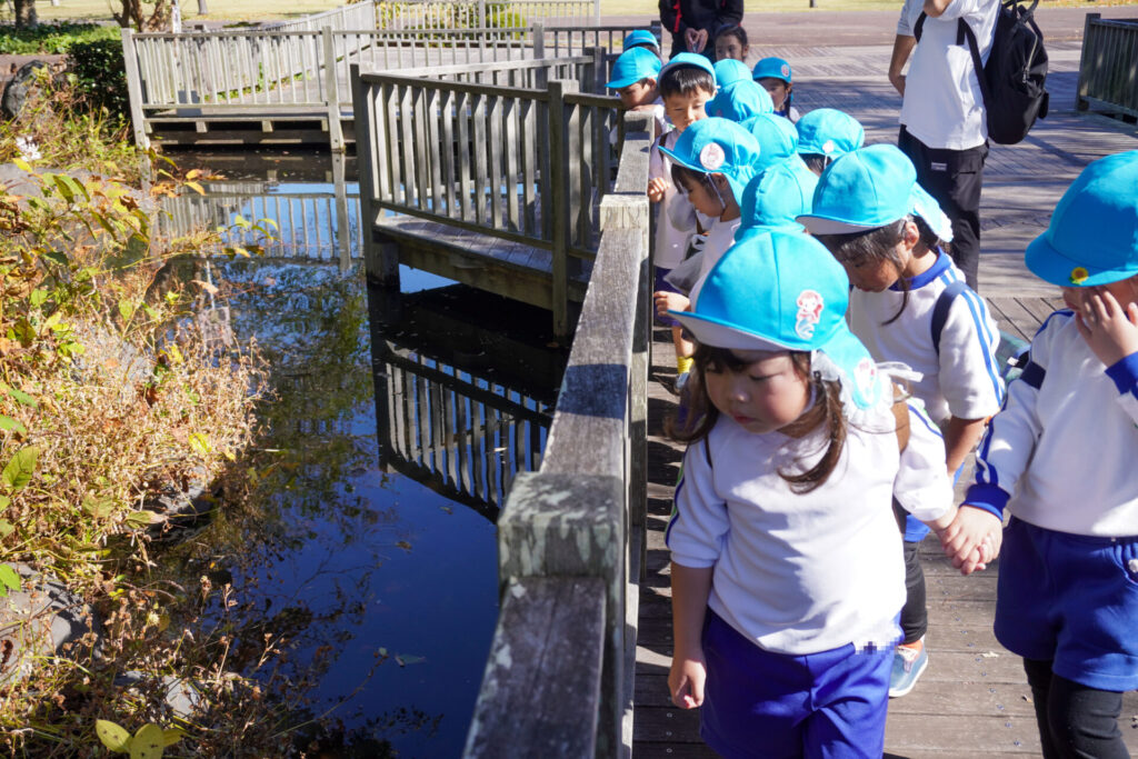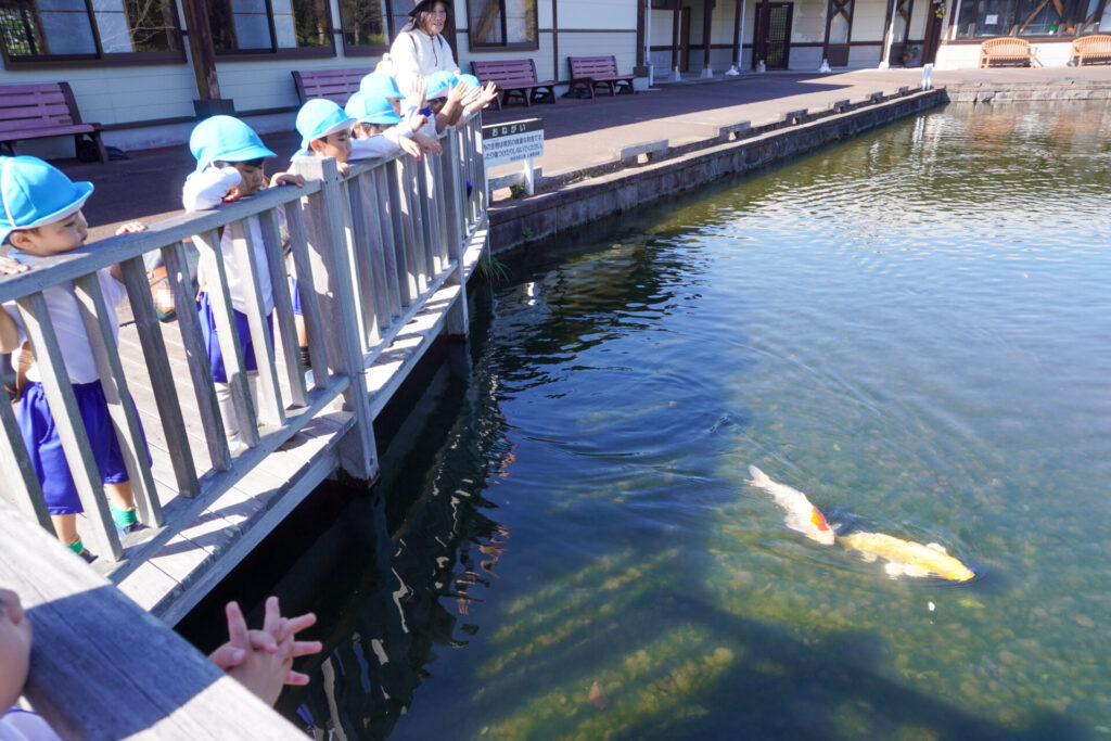 駐車場に向かう池には「カメ」と「コイ」がいました。「コイさん、こっちに来てー!」と手を叩いて歓迎すると向こう岸からスイスイ泳いで会いにきてくれました。「ゆり組も幼稚園に帰るね!バイバイ!」と挨拶をして帰ってきました。