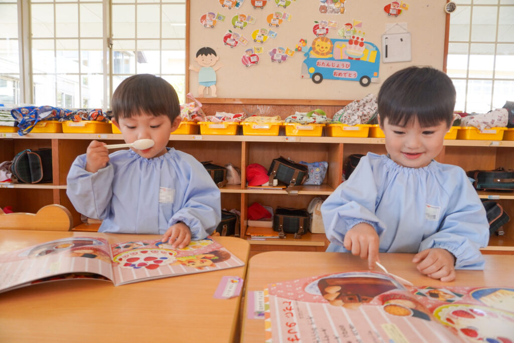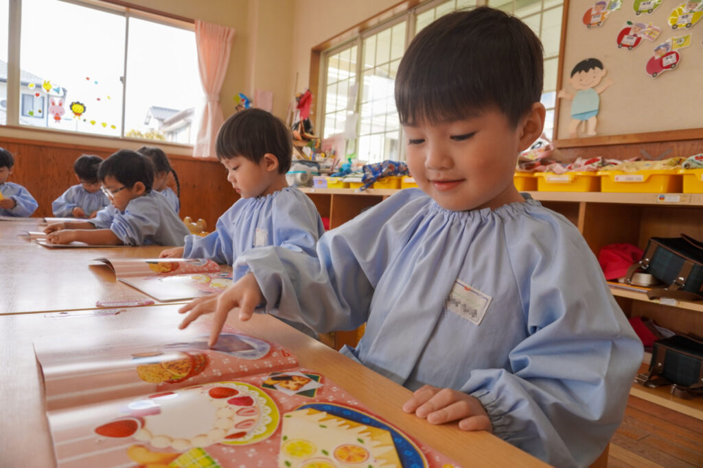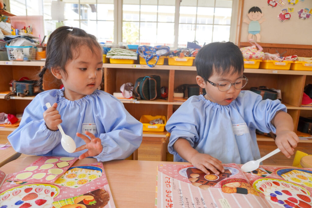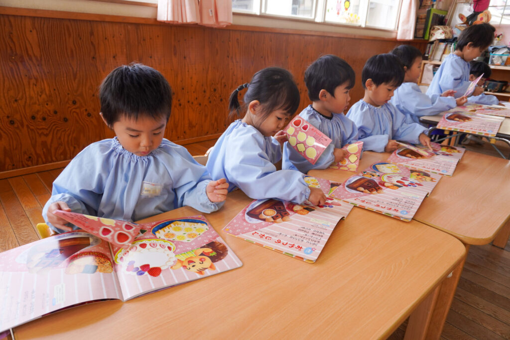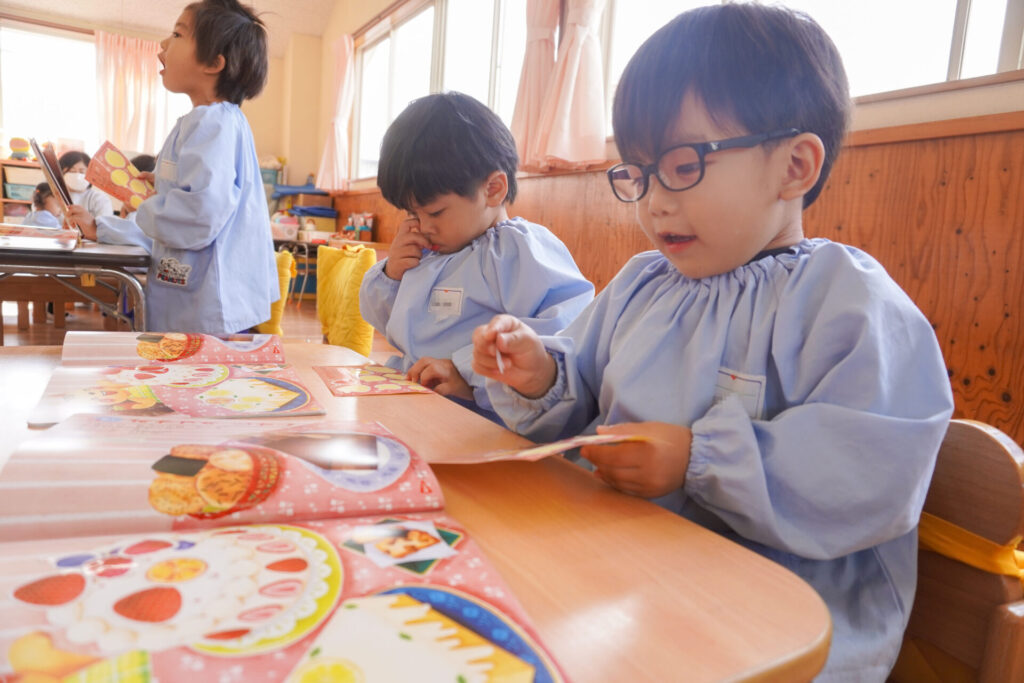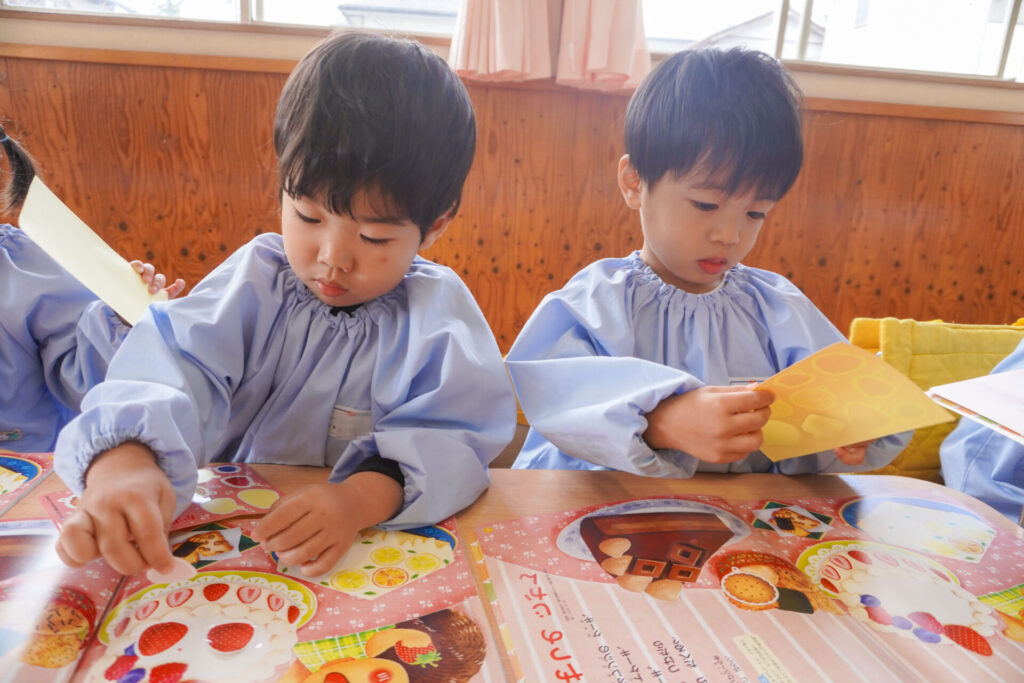 幼稚園で一番小さい満3歳児バンビ組さん。今日は教材絵本で遊びました。ケーキやお菓子、おいしそうなおやつがいっぱいです。早速、ケーキにデコレーションをします。