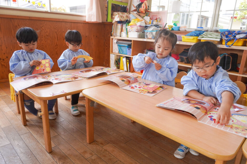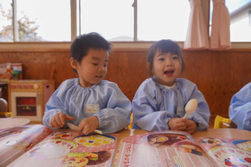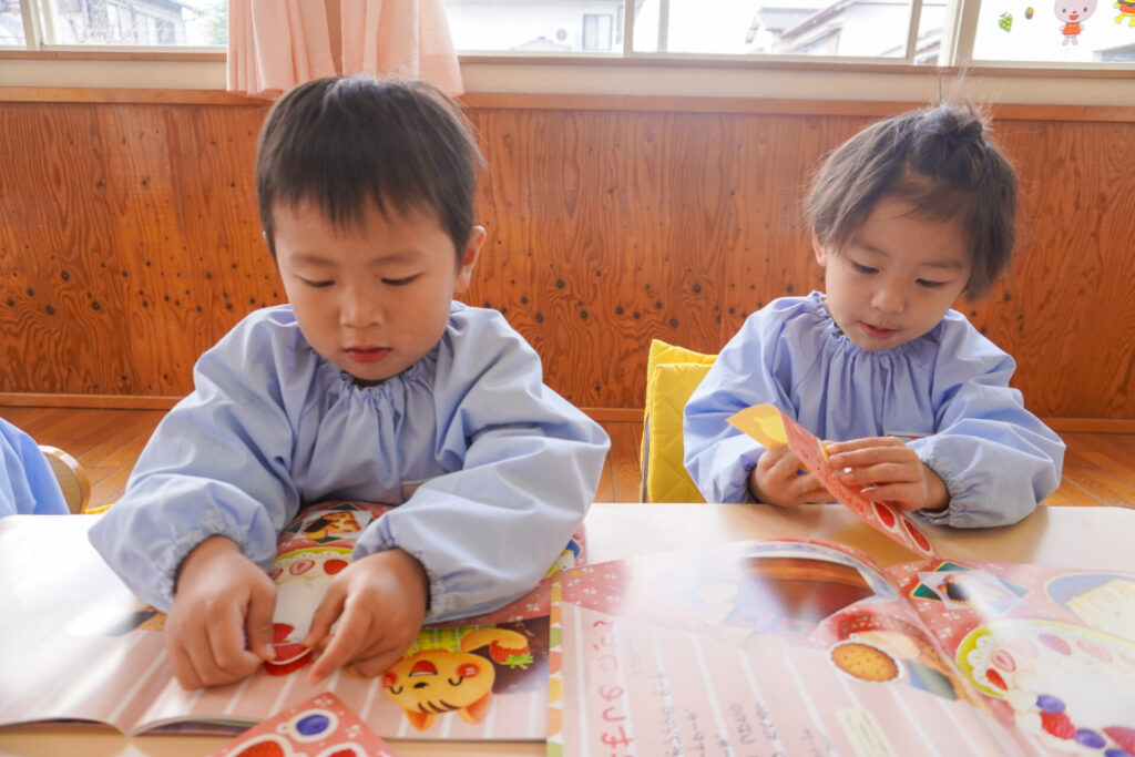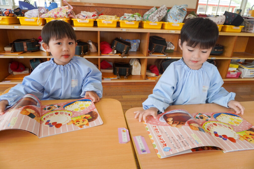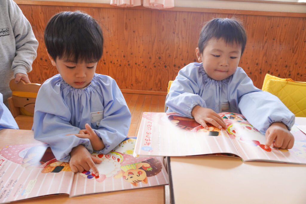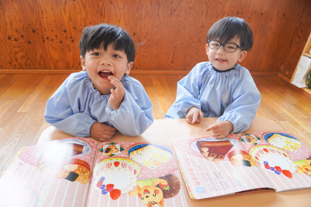幼稚園で一番小さい満3歳児バンビ組さん。今日は教材絵本で遊びました。ケーキやお菓子、おいしそうなおやつがいっぱいです。早速、ケーキにデコレーションをします。