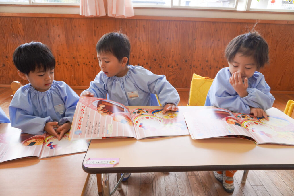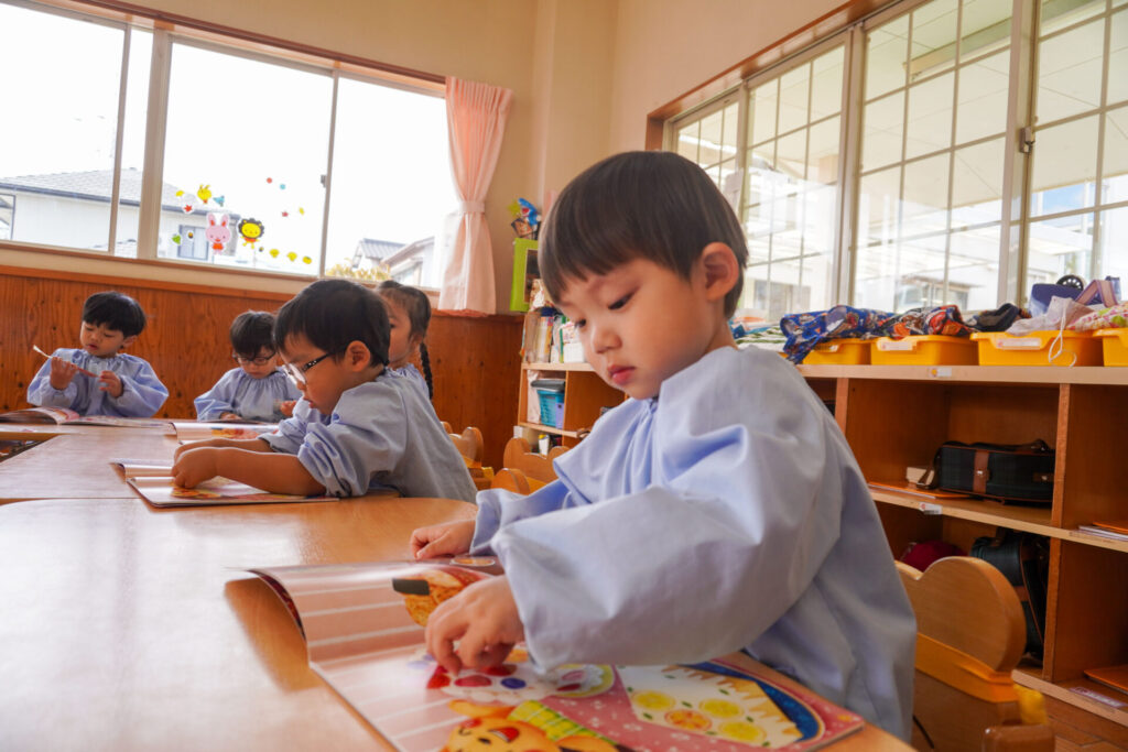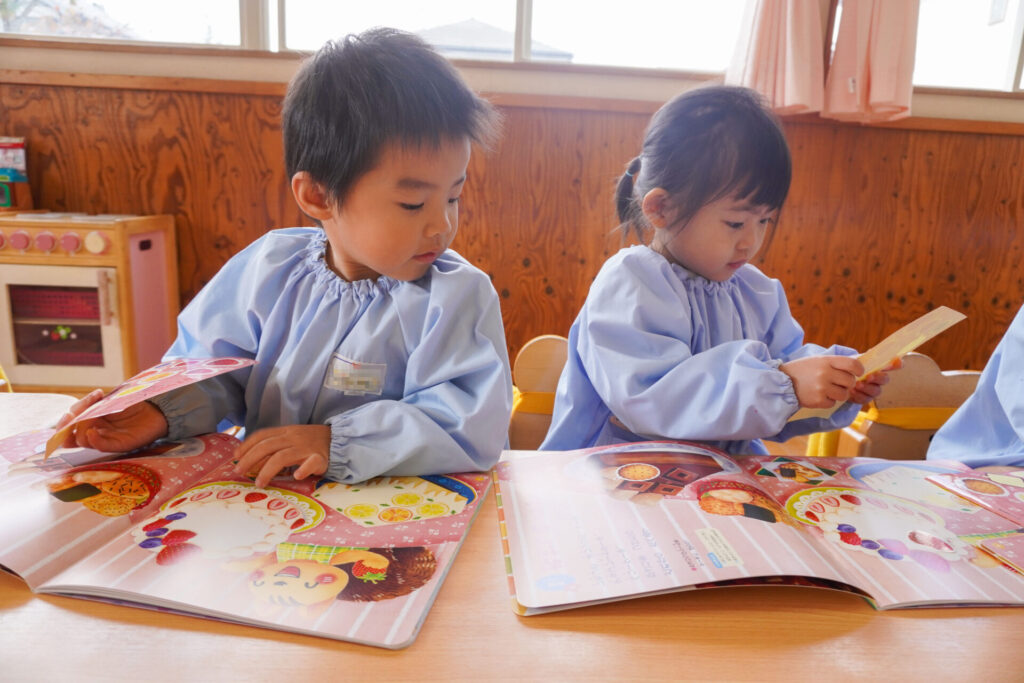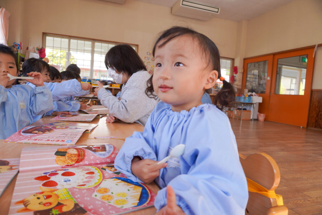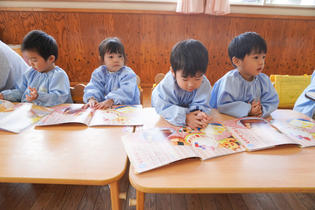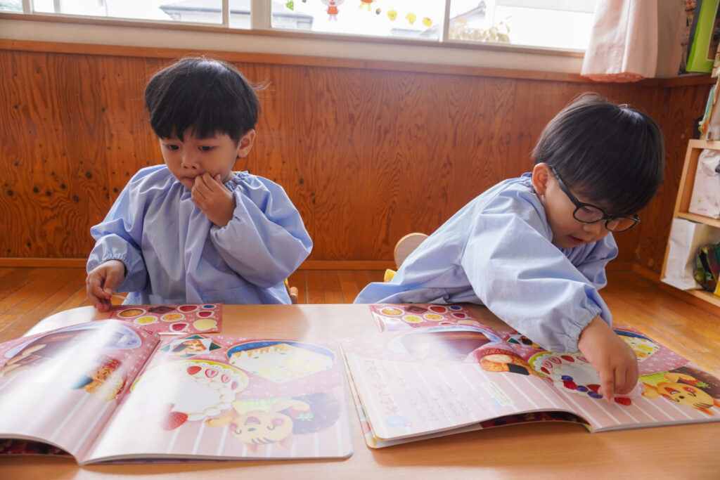 幼稚園で一番小さい満3歳児バンビ組さん。今日は教材絵本で遊びました。ケーキやお菓子、おいしそうなおやつがいっぱいです。早速、ケーキにデコレーションをします。