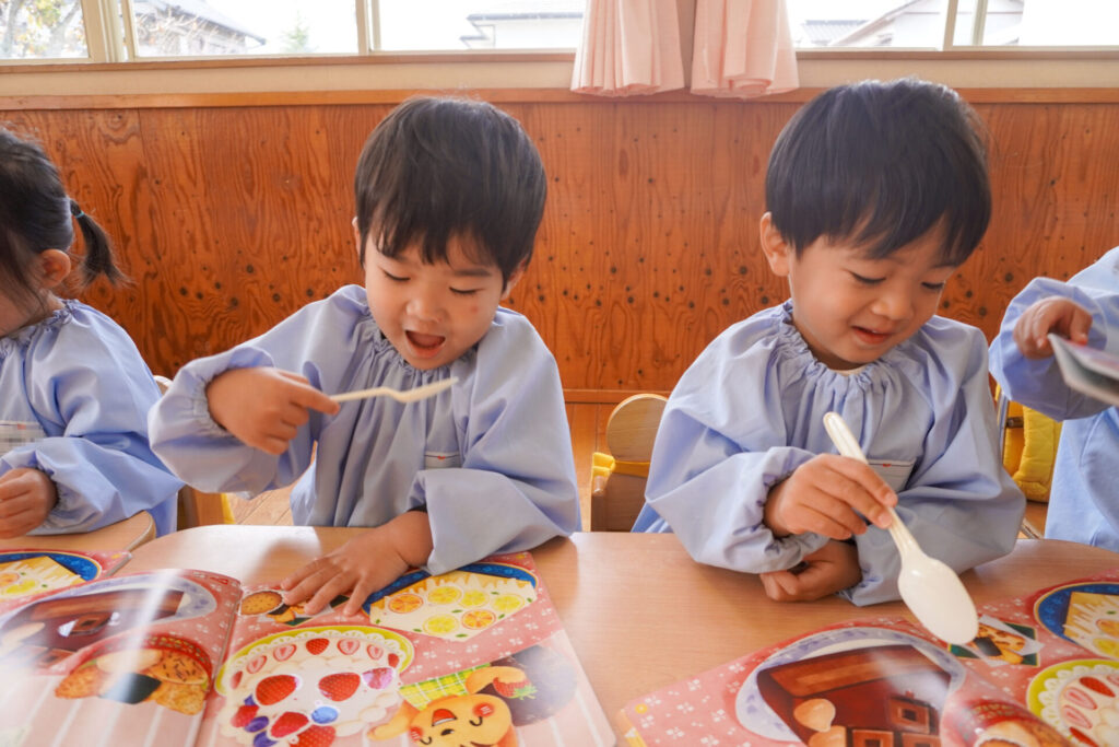 最後はスプーンを持って、ケーキバイキングごっこをしました。スプーンですくって口に運ぶ真似をして「おいしいね」「もっと食べたいね」「お弁当もたくさん食べるよ」と、会話もはずみます。