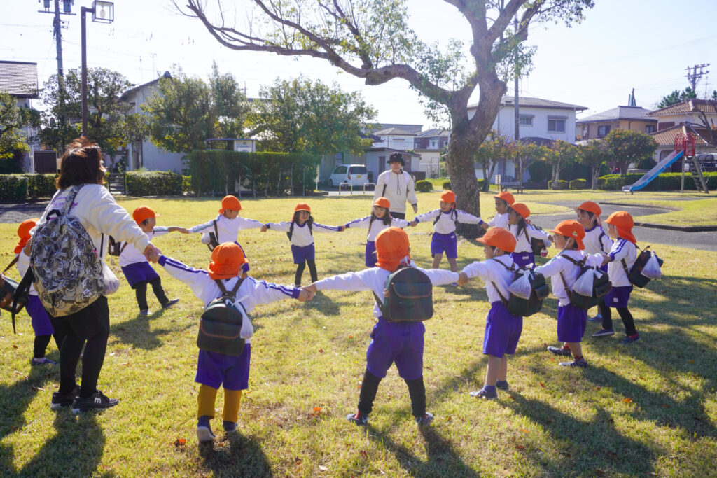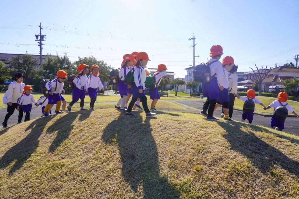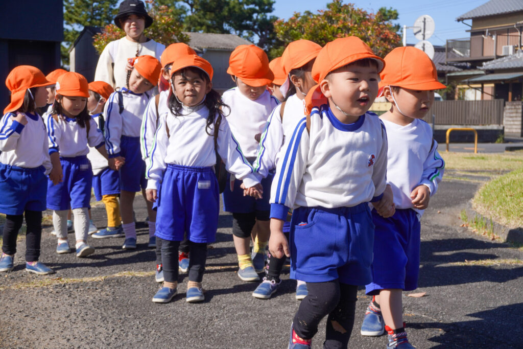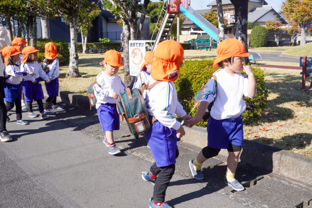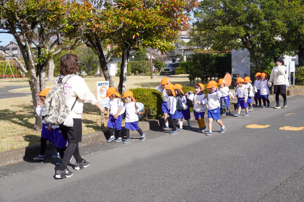 天気もよく、オレンジ色のクラス帽子が青空に映えてとてもきれいでした。行きも帰りも、ペア同士で手をつないで歩きました。前の友だちについて並んで歩けるようになり、成長を感じました。楽しいピクニックになりましたね。