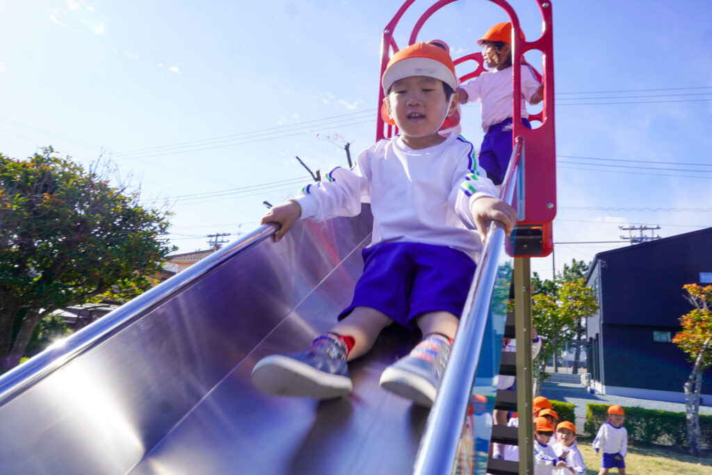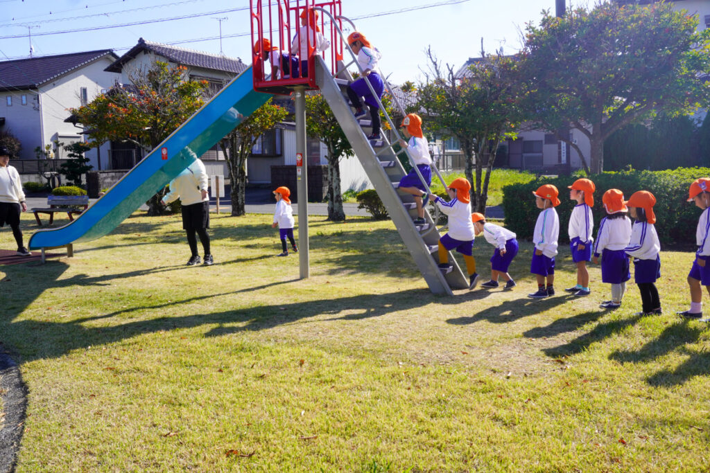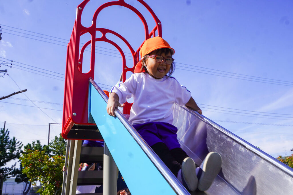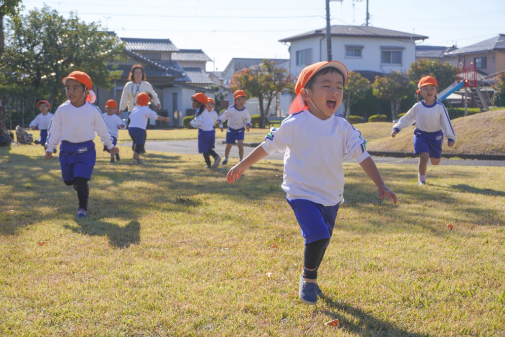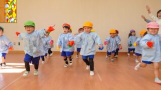 天気もよく、オレンジ色のクラス帽子が青空に映えてとてもきれいでした。行きも帰りも、ペア同士で手をつないで歩きました。前の友だちについて並んで歩けるようになり、成長を感じました。楽しいピクニックになりましたね。