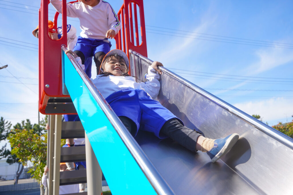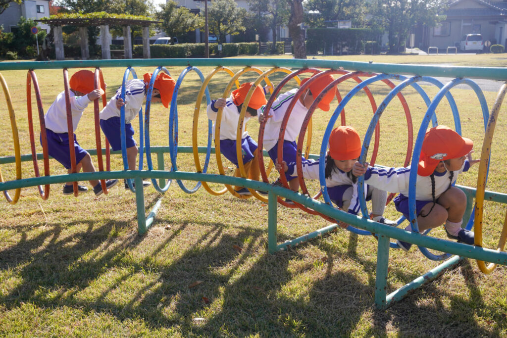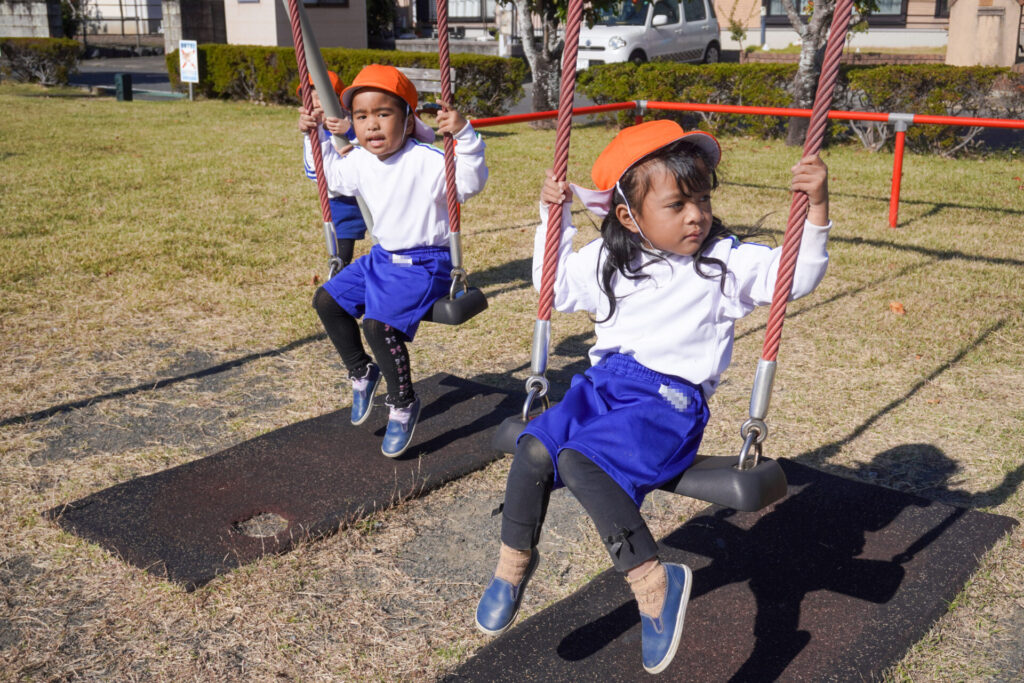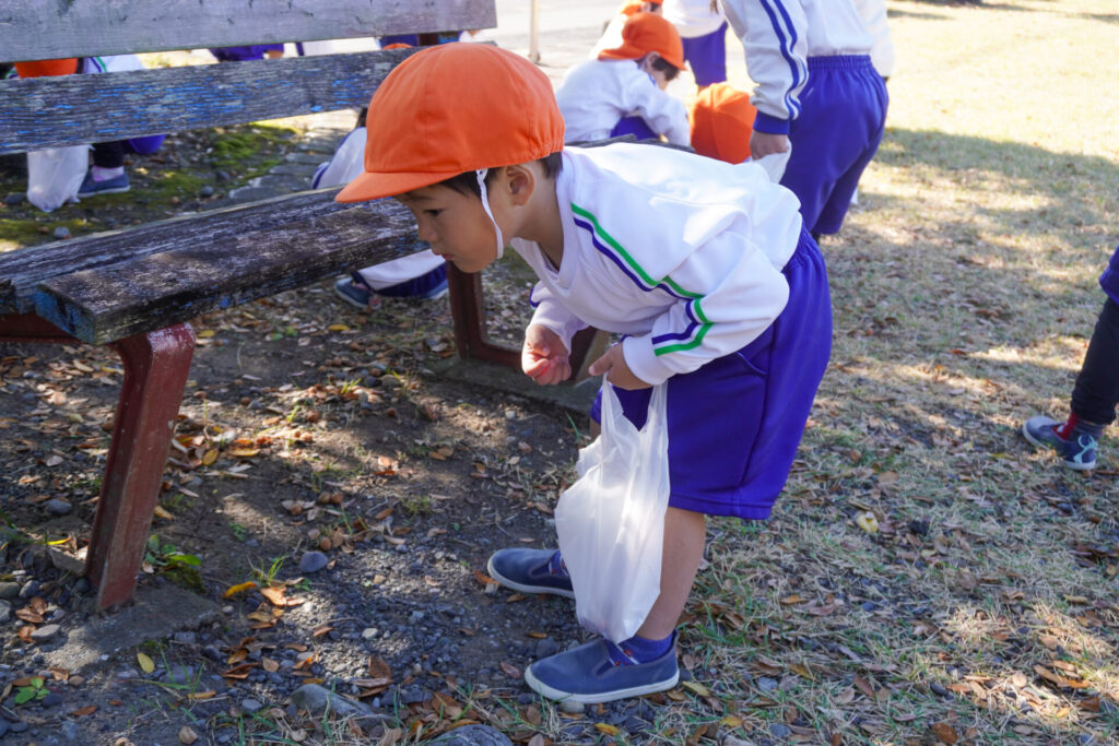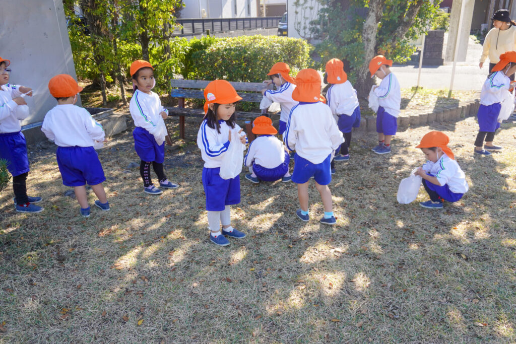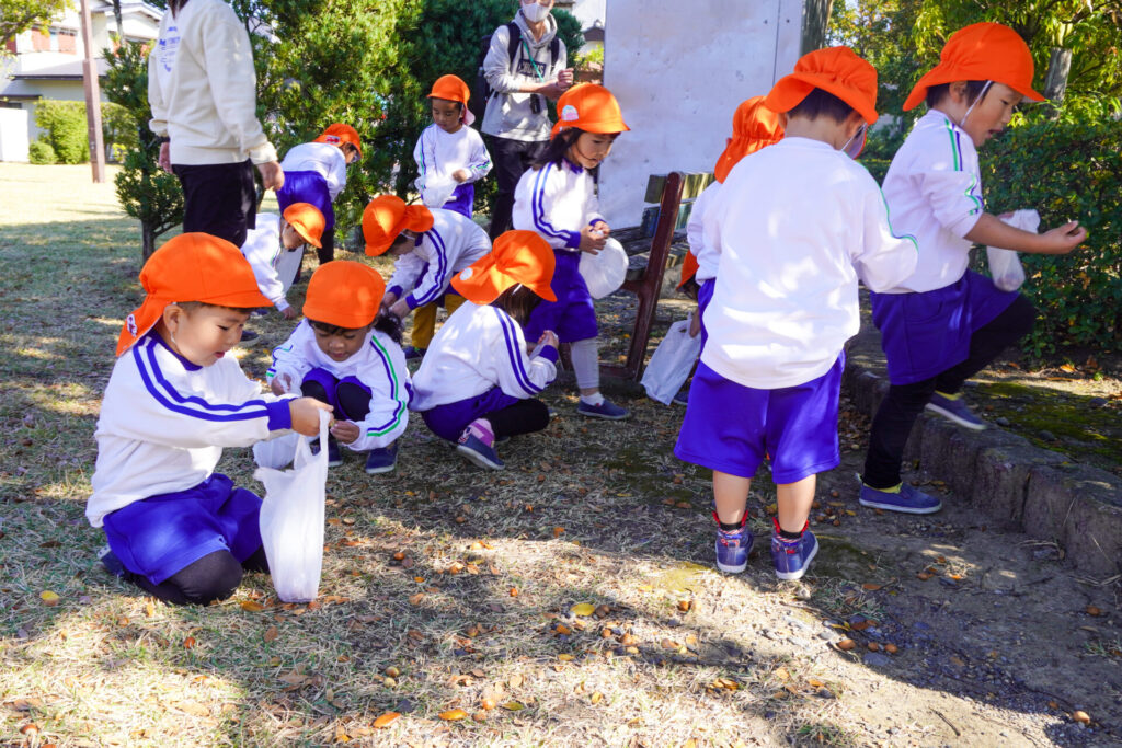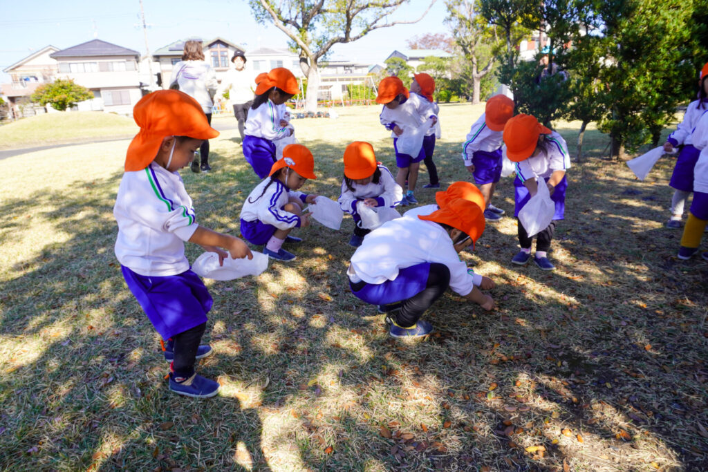 公園内には「木の実」がいっぱい!お土産袋にいっぱい集めました。ブランコを1人で漕げるようになったり、順番に遊べるようになったり、集団の約束を守って遊べるようになったことを実感しました。
