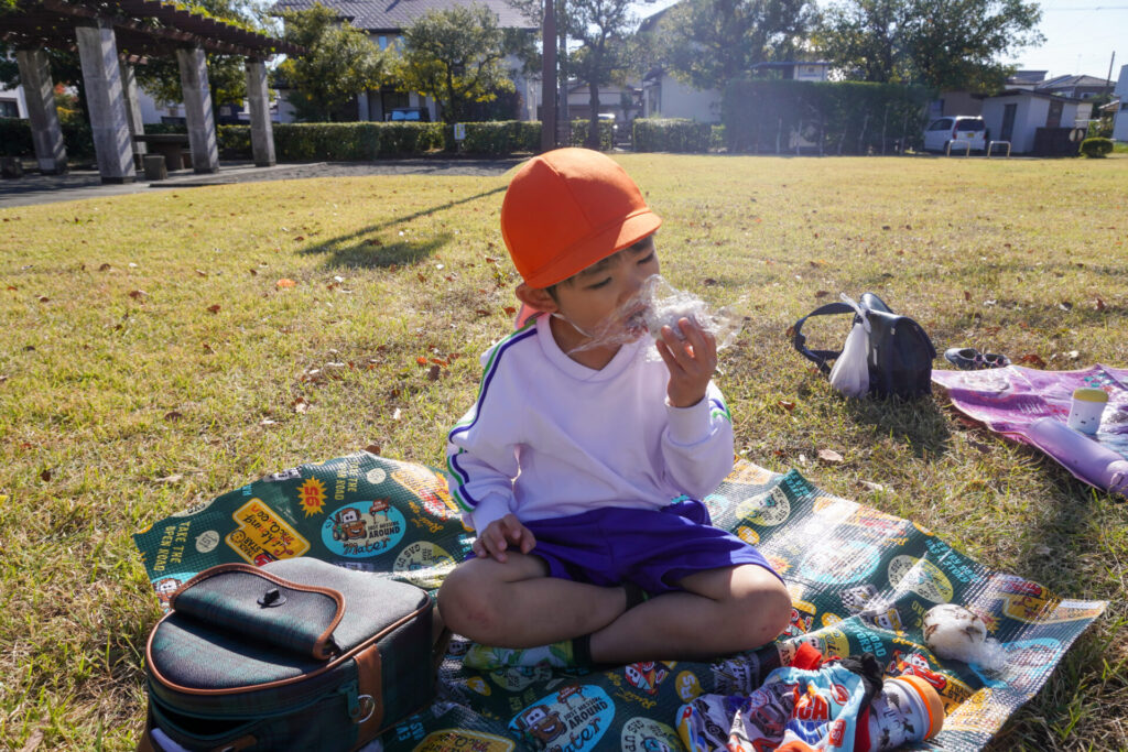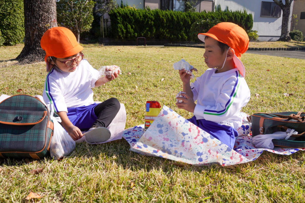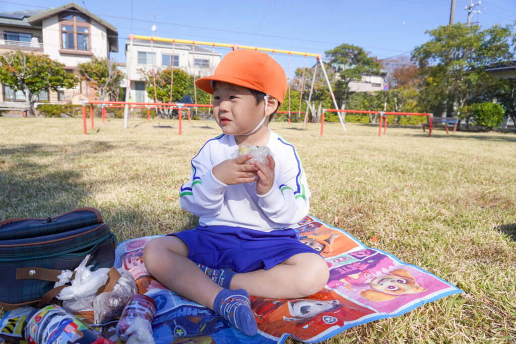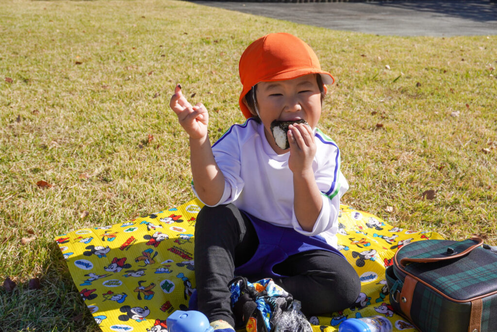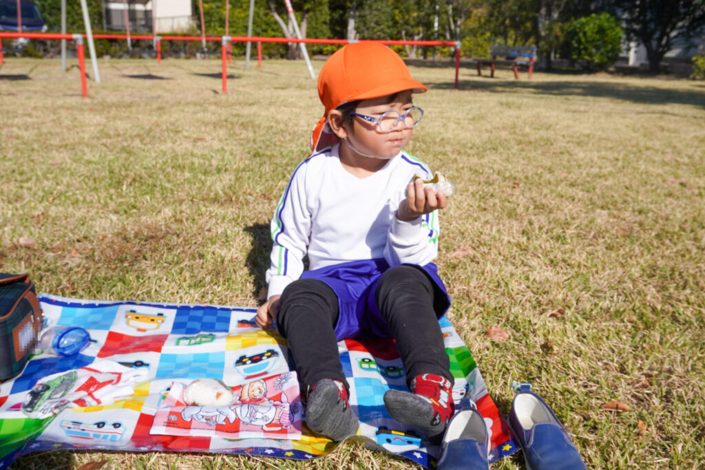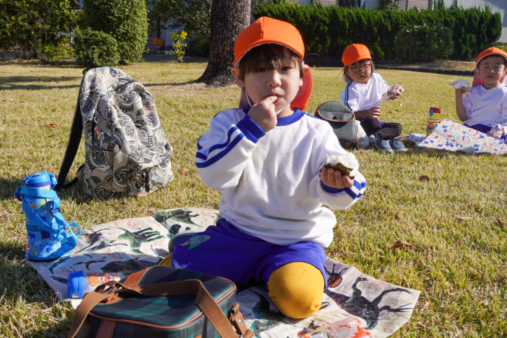 昼食はおうちの方が用意してくれた「おにぎり」を食べました。先週のバス遠足の経験を通して、あっという間に身支度ができて感心しました。ぽかぽか陽気の中、公園で食べる「おにぎり」は格別でしたね。
