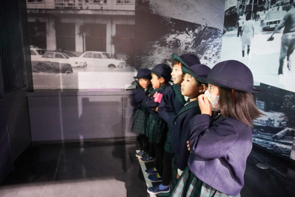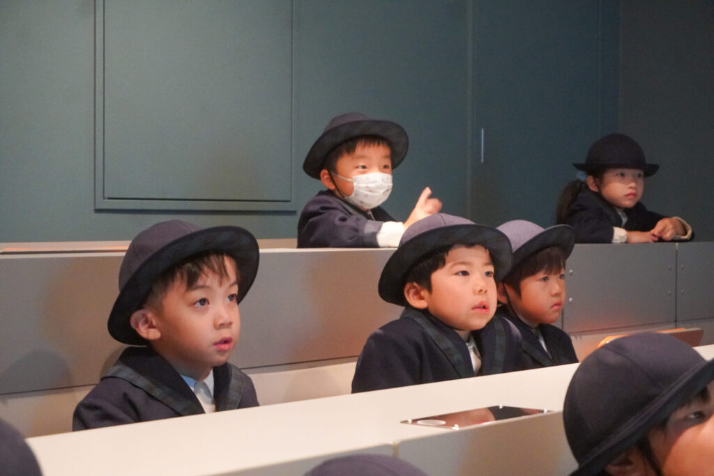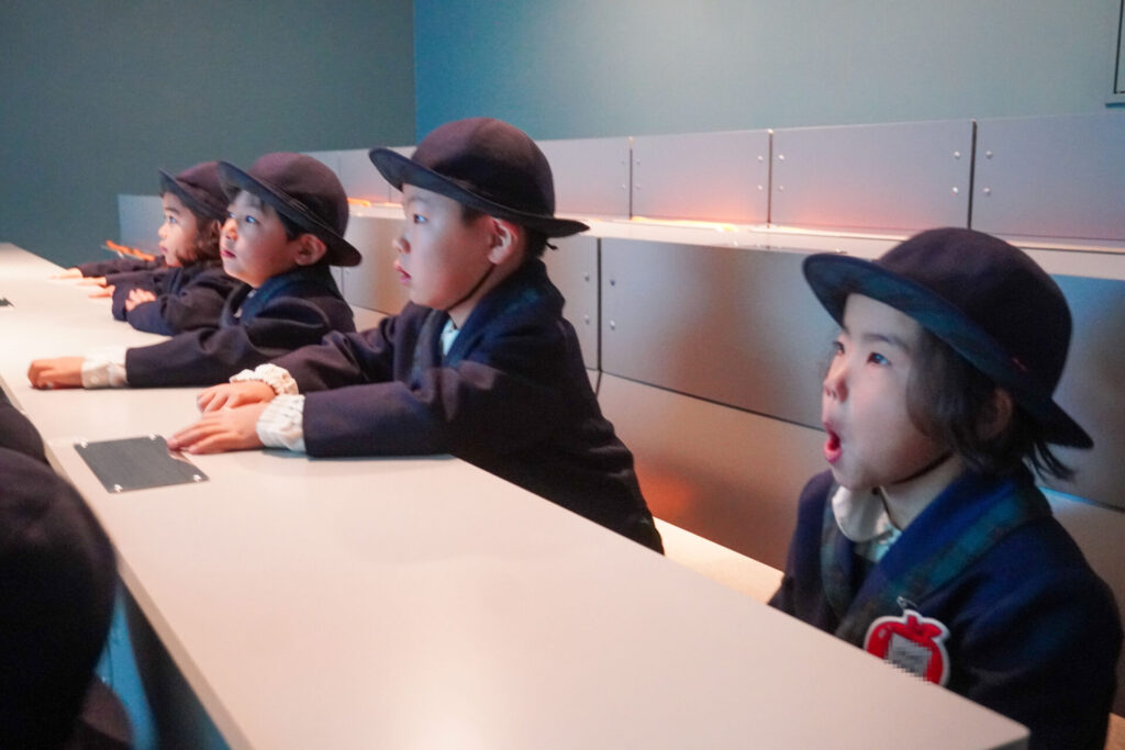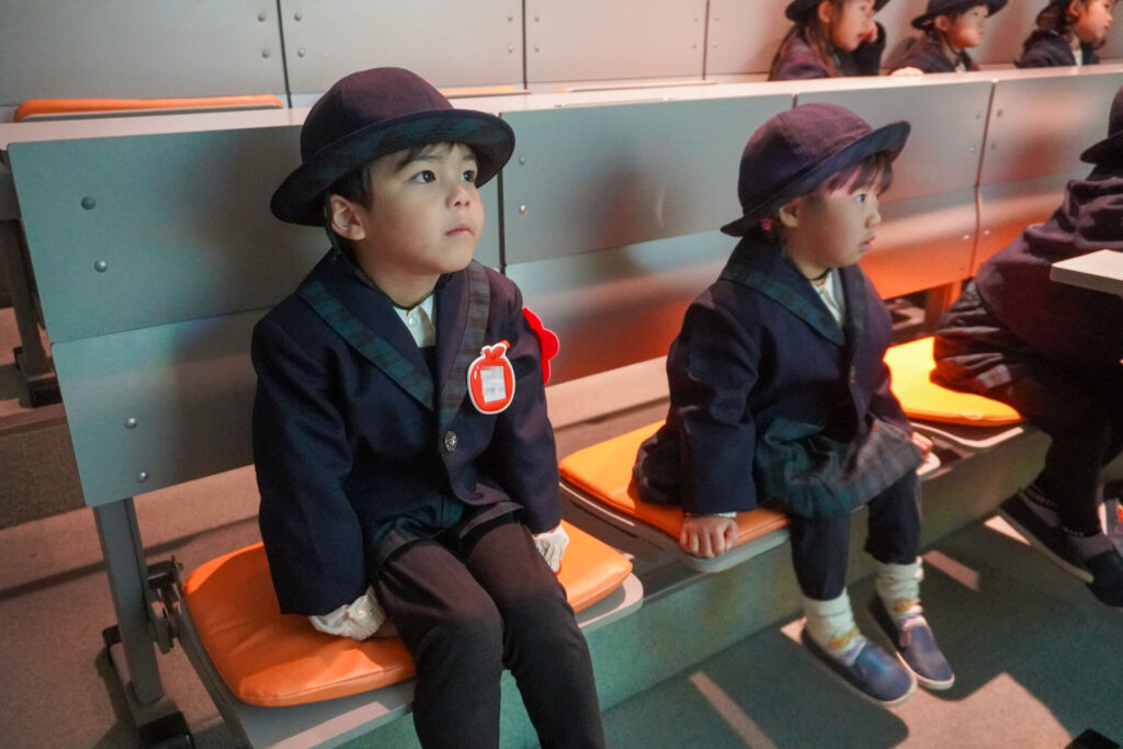 「防災シアター」では防災アニメ映像を鑑賞しました。昆虫が分かりやすく、避難訓練の安全な方法を教えてくれ、真剣に見ていました。見て、聞いて、考えて、またひとつ、大切な知識が増えました。