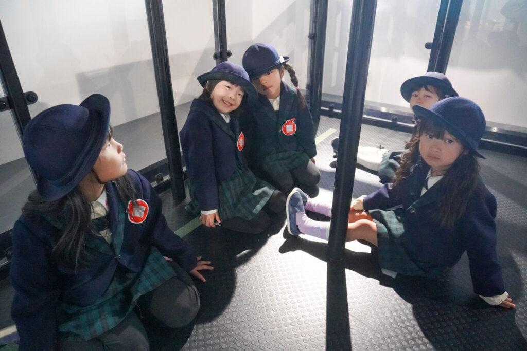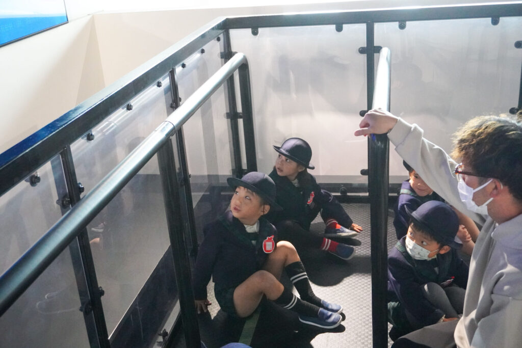 「地震体験」では、震度7の揺れ体験をしました。子どもたちの顔が真剣になり、約束を守って体験することができました。怖かったという子もいましたが、実体験を通して、地震の恐ろしさを体験できました。「余震」の意味も教えていただき、またひとつ防災意識も高まりました。