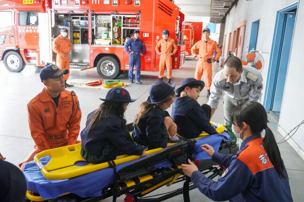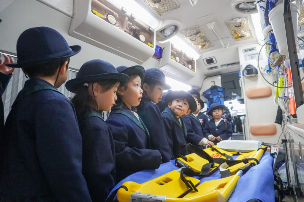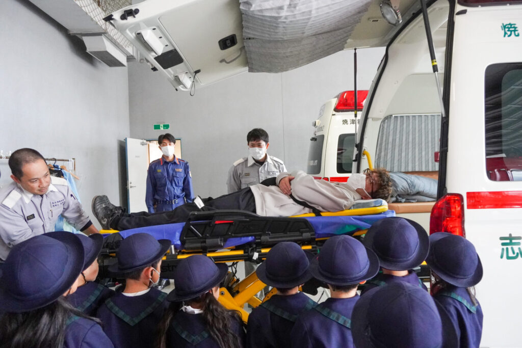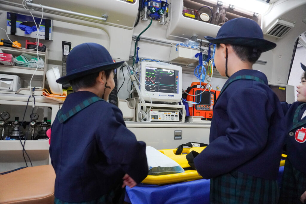 続いて、車両見学です。「救急車」の中に実際に乗せていただき、車内に積載されているたくさんの医療器具・道具を見せていただきました。上にも左右にも、医療器具でいっぱいです。実際にストレッチャーの出し入れも見せていただきました。