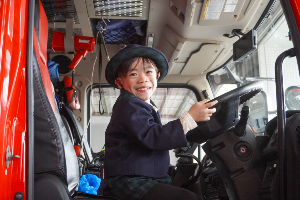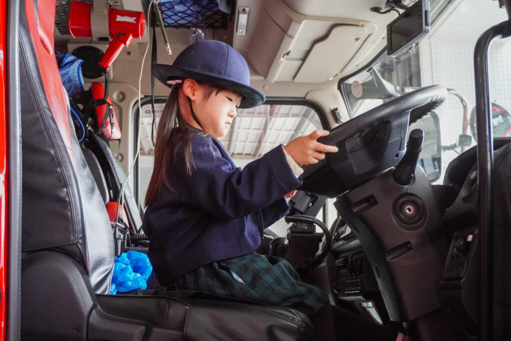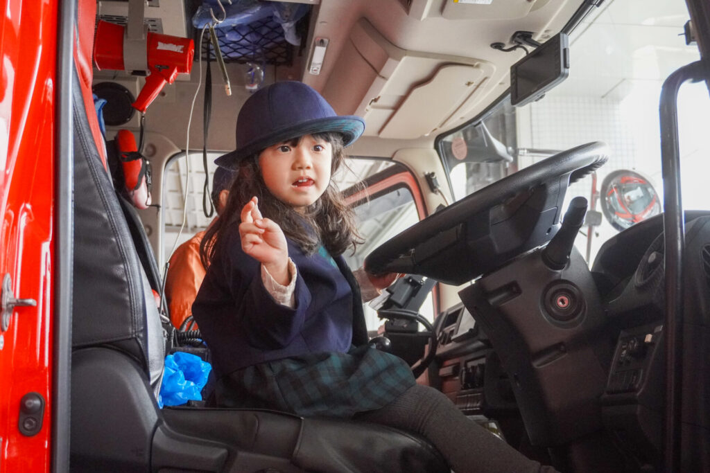次は「消防車」です。火事発生時、高い建物や消防車が入りにくい場所でも対応できるように、水は約4,500リットルを積載、またホースは約20メートル伸びるそうです。