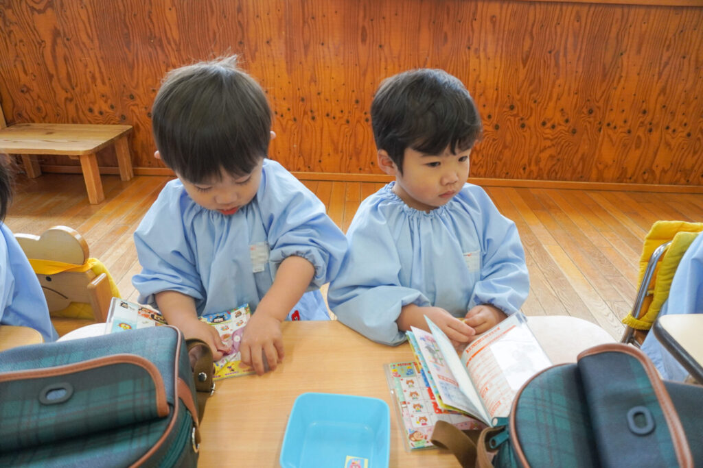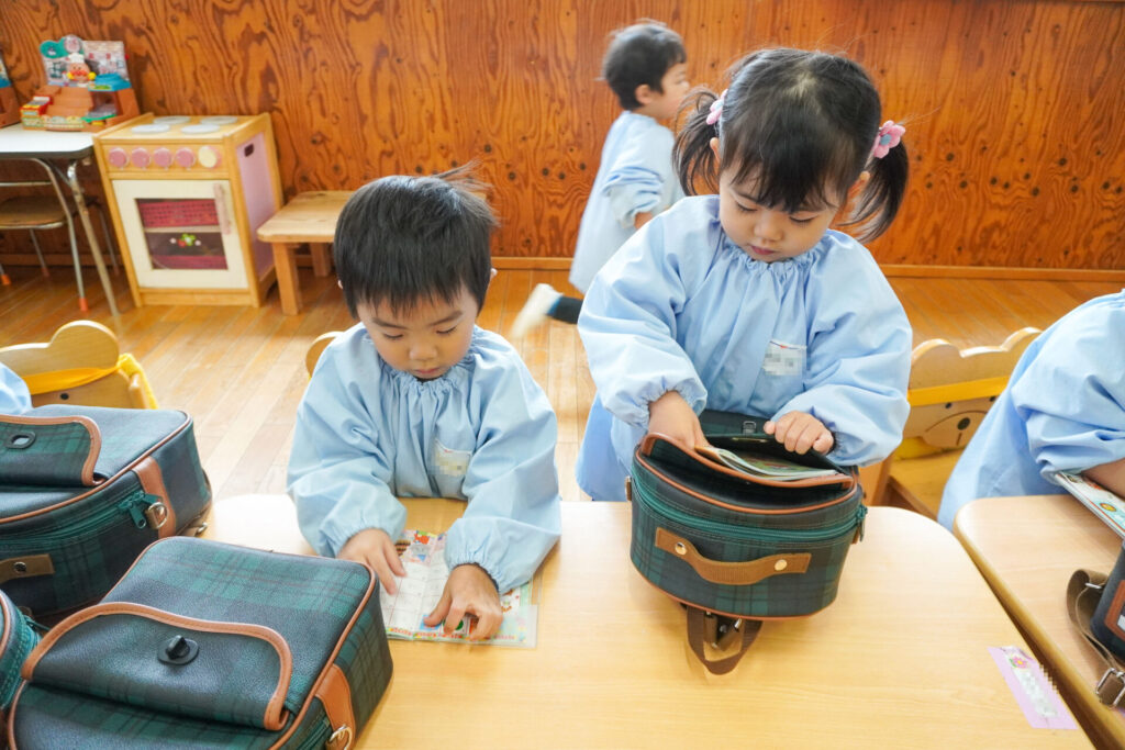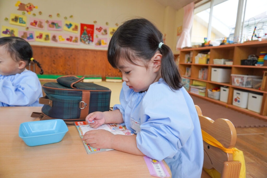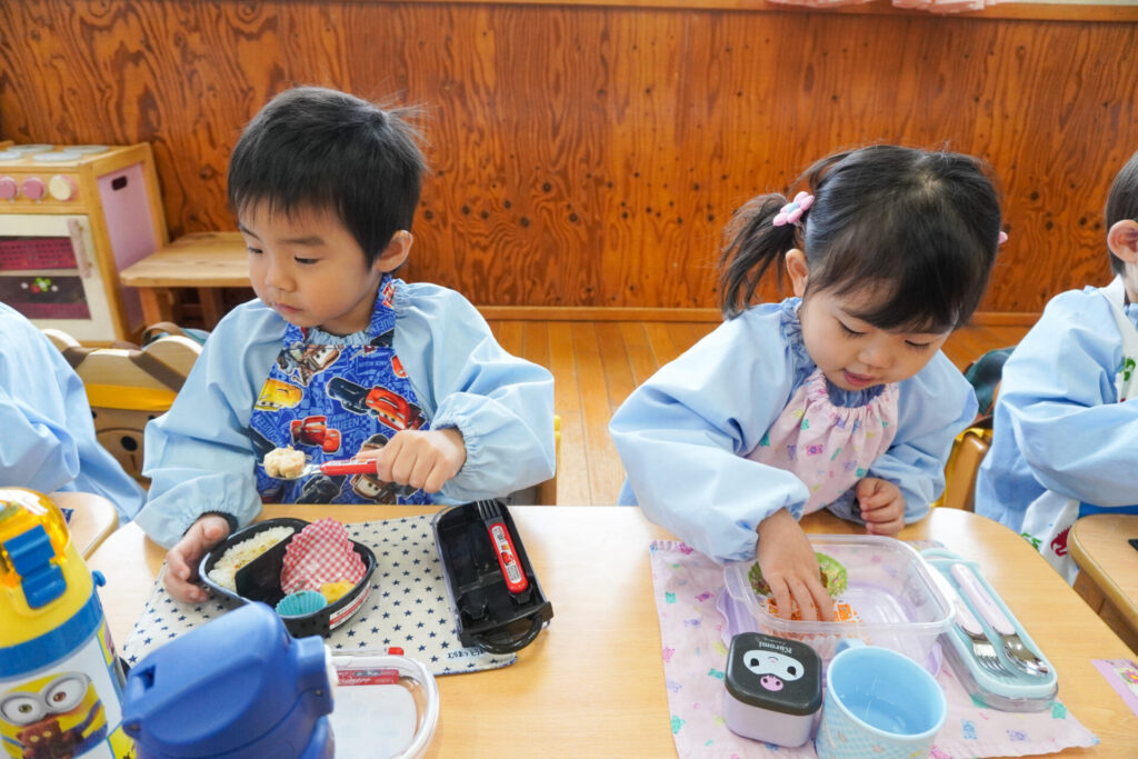 毎週水曜日はお弁当の日です。まどかっこは、おうちの方が作ってくれるお弁当が大好きです。今日は今月の新入園児も食べる初めてのお弁当でした。
