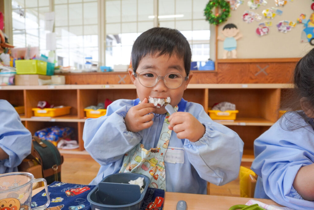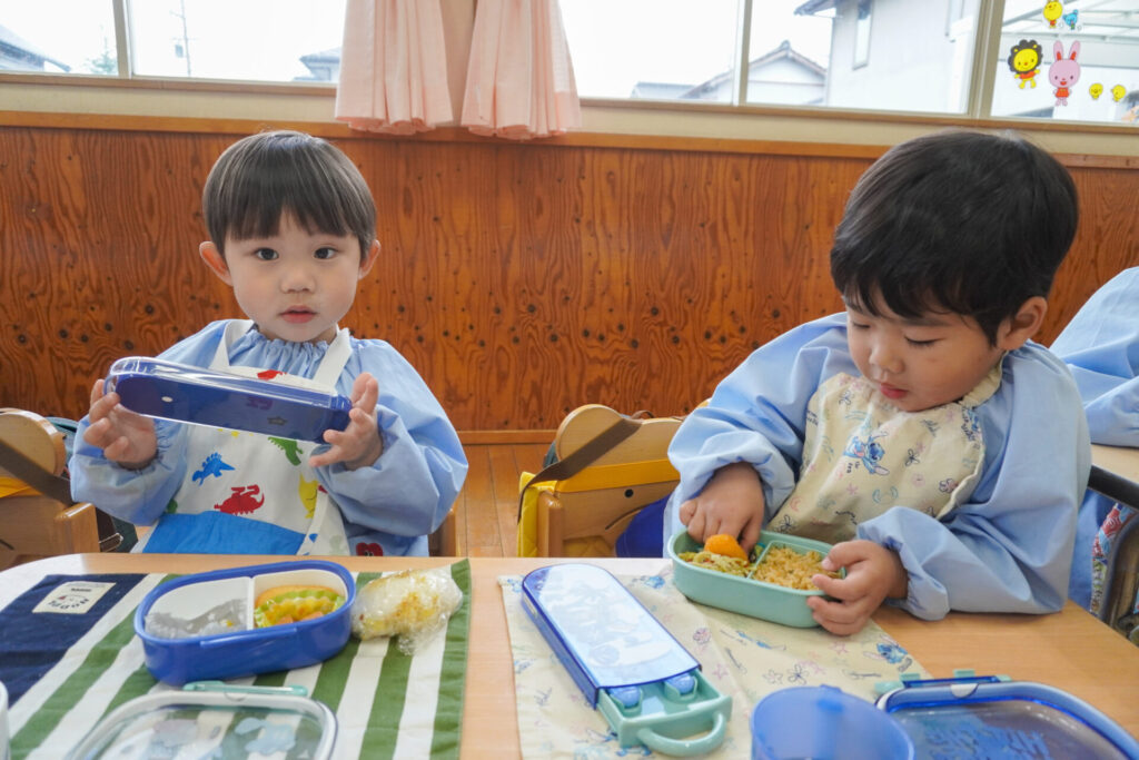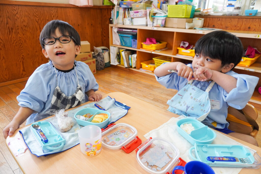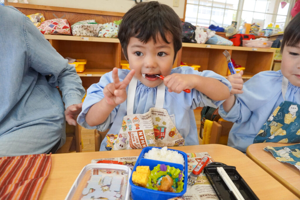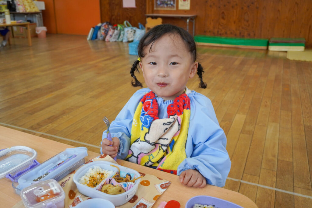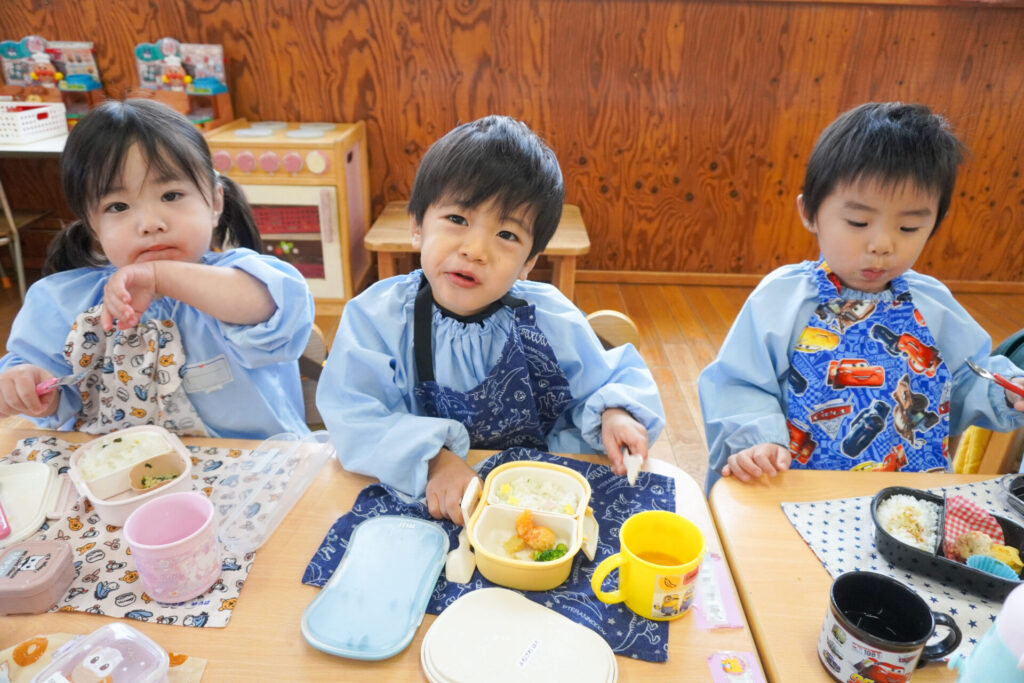 少しずつ園生活に慣れてきて、笑顔も見られるようになりました。みんなで食べるお弁当はおいしいですね。