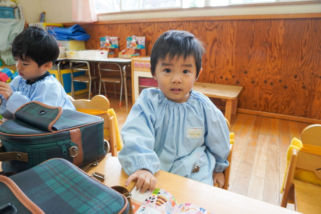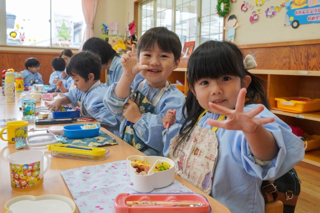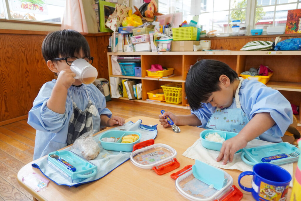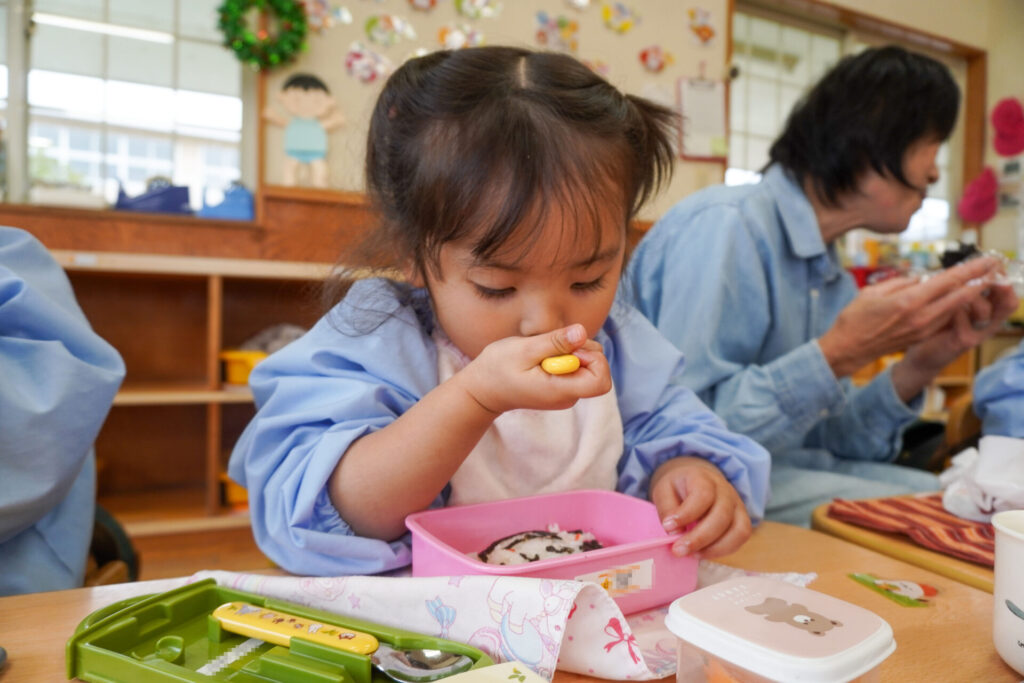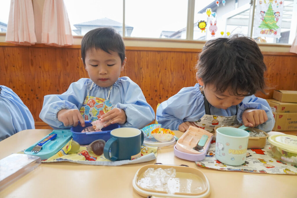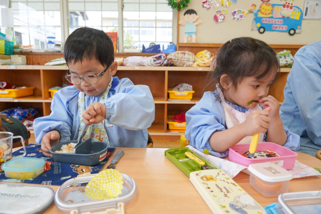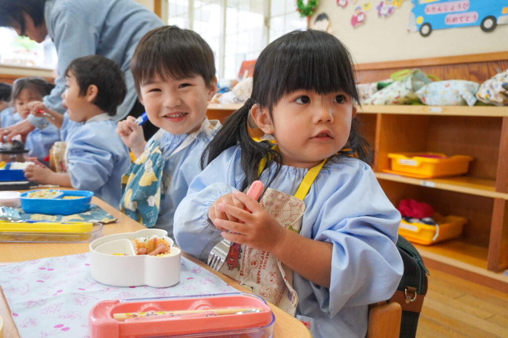 少しずつ園生活に慣れてきて、笑顔も見られるようになりました。みんなで食べるお弁当はおいしいですね。