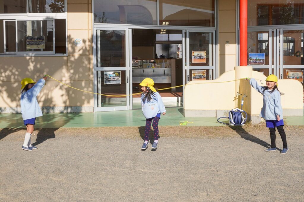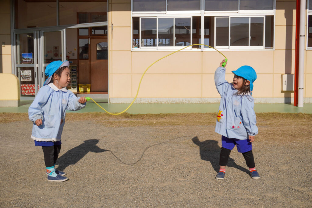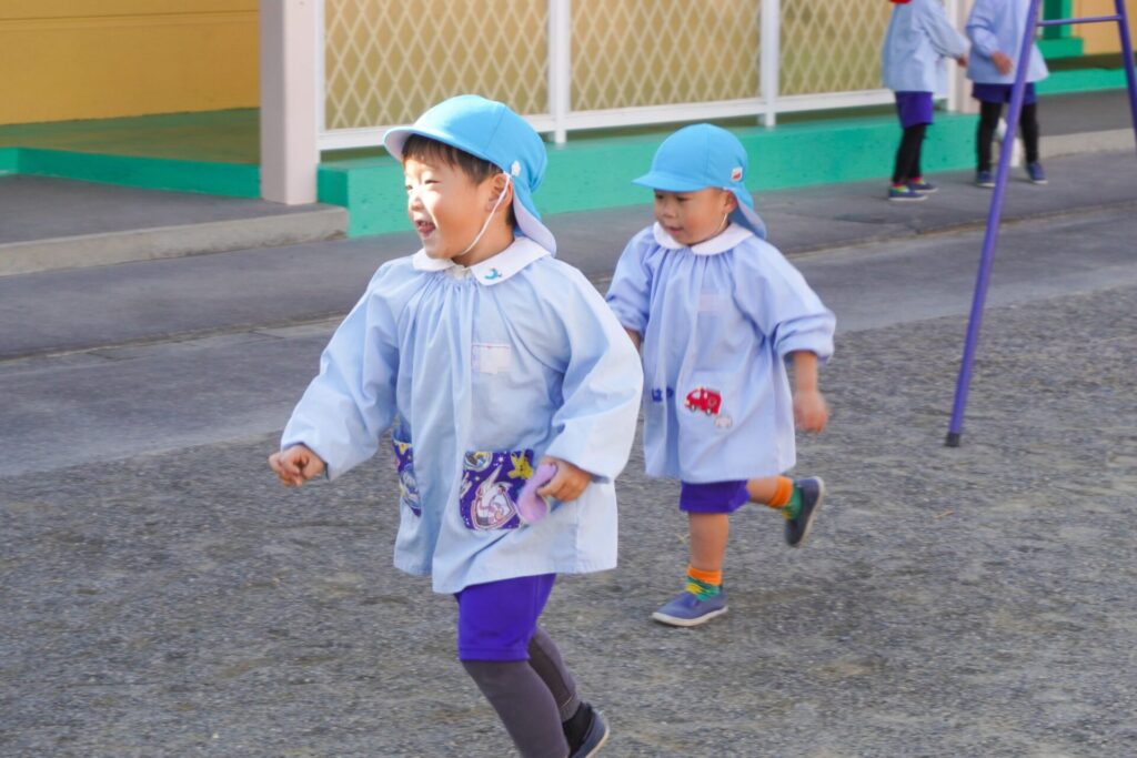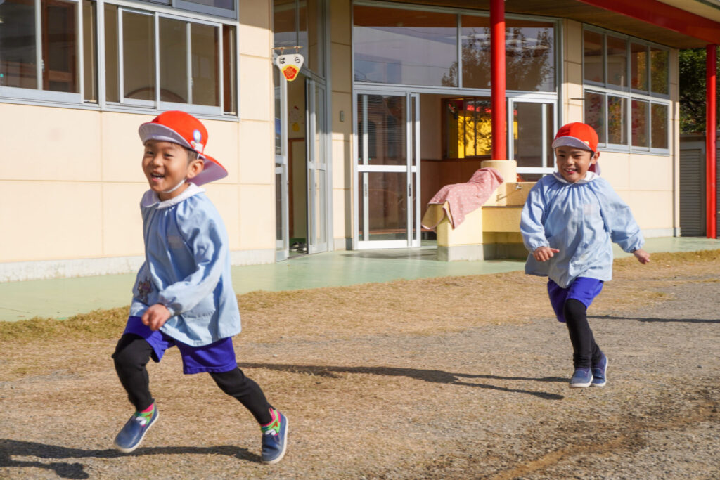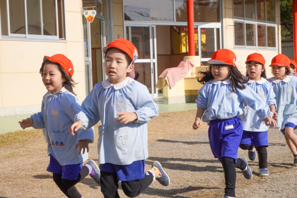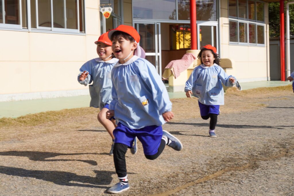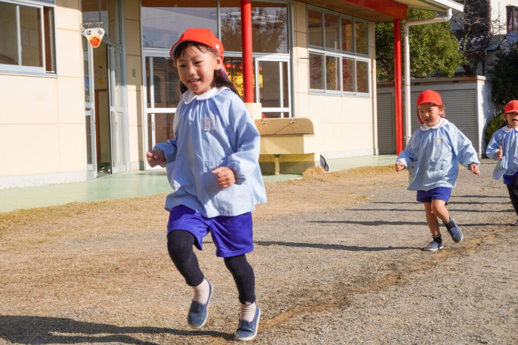 縄跳びも大好きです。年長になると自分たちで長縄で遊べるようになります。回し手を替えたり、一緒に数えたり、楽しく遊んでいます。「マラソン」では同じスピードで走ることを意識しています。少しずつ持久力がついていくといいです。