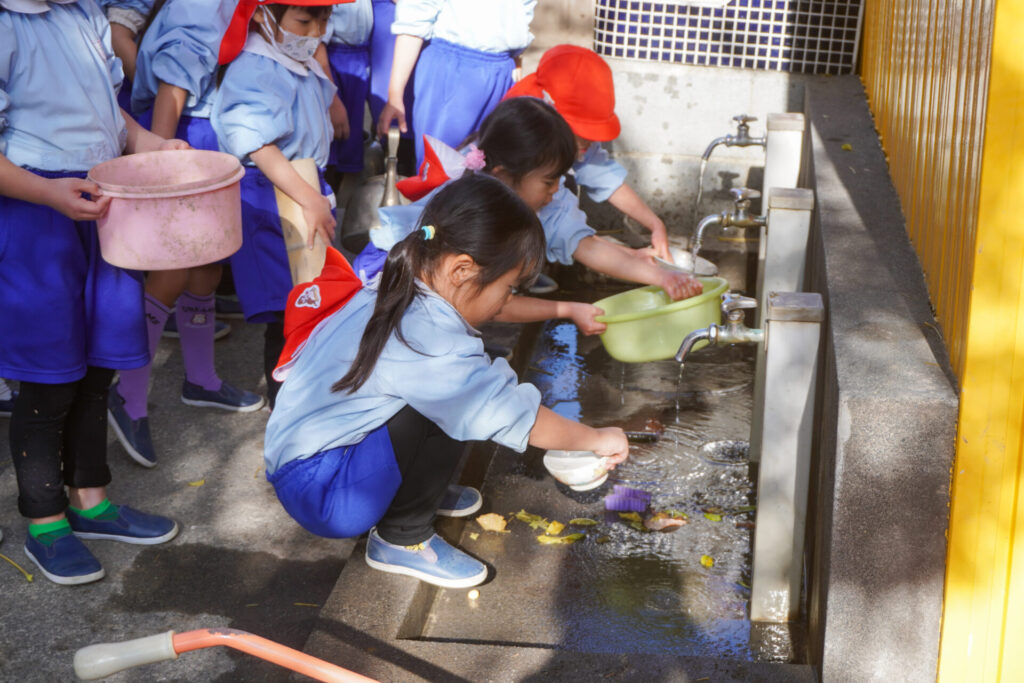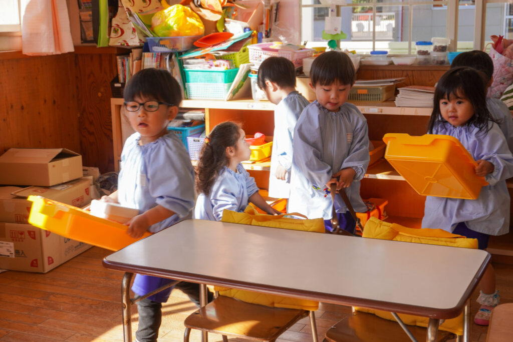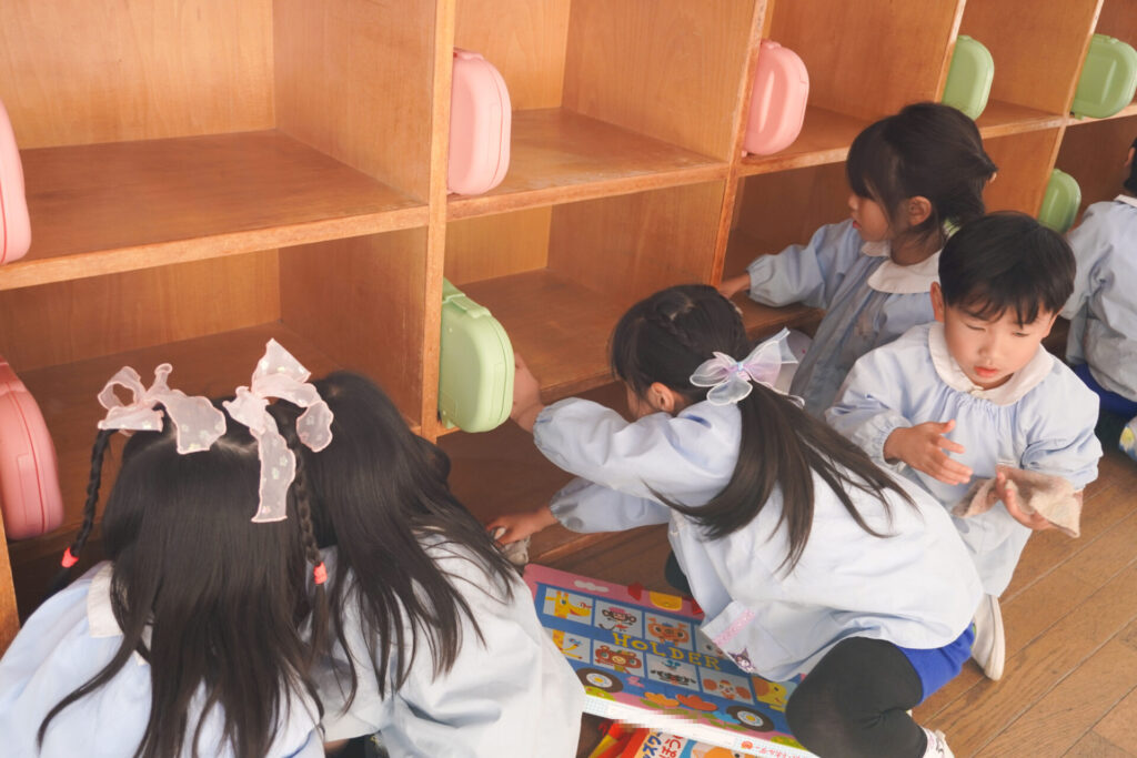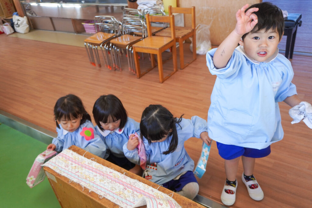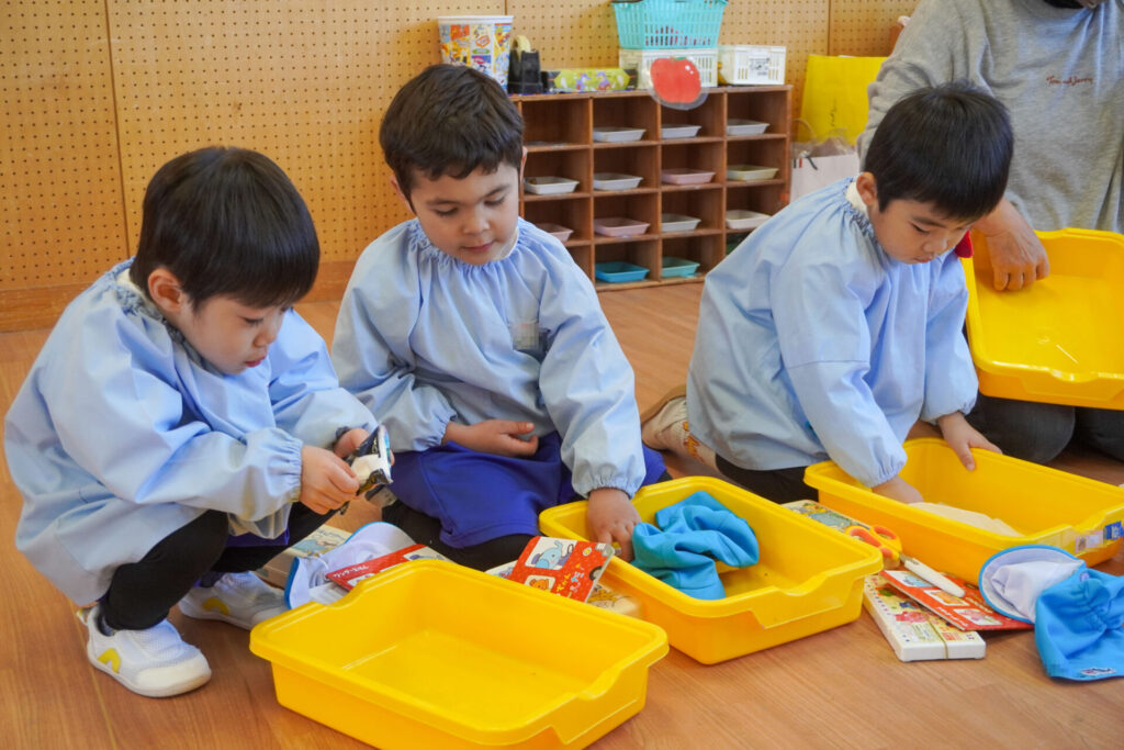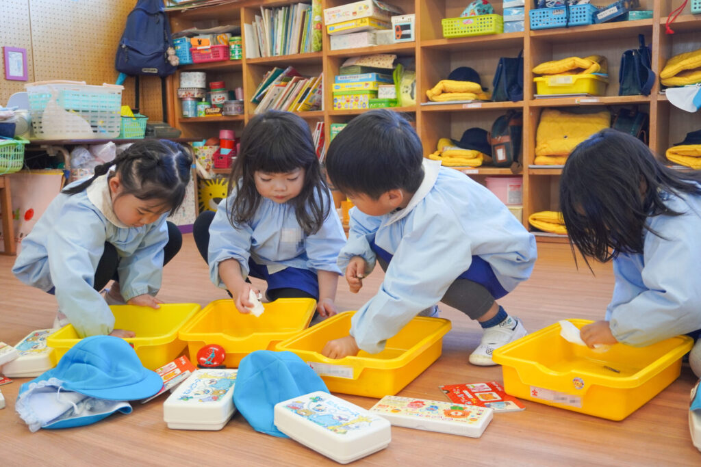 年長つき組、年少ゆり組・ばら組、満3歳バンビ組は、たくさん遊んだ保育室をピカピカ大掃除です。クレヨン、はさみなどが入っている道具ケースをからっぽにすると、ゴミがあったり、ケースが汚れていたり…「こんなに汚かったんだね」と掃除がますます進みます。