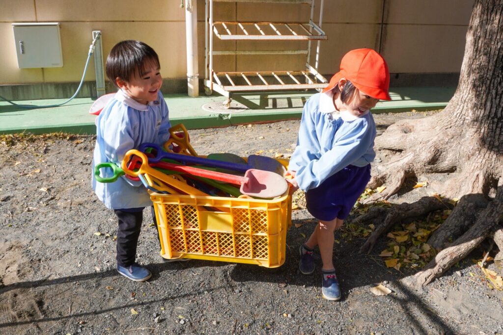 年中さくら組がバケツ、カップ、スコップ…仕分けをして遊びやすいように片付けをしました。器具庫内をきれいに整頓をして、3学期にスムーズに遊べるように揃えました。明日が2学期最終日です。元気に登園してくださいね。