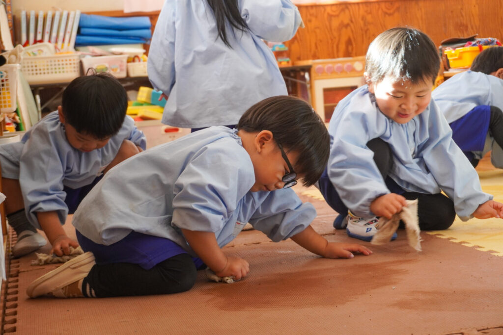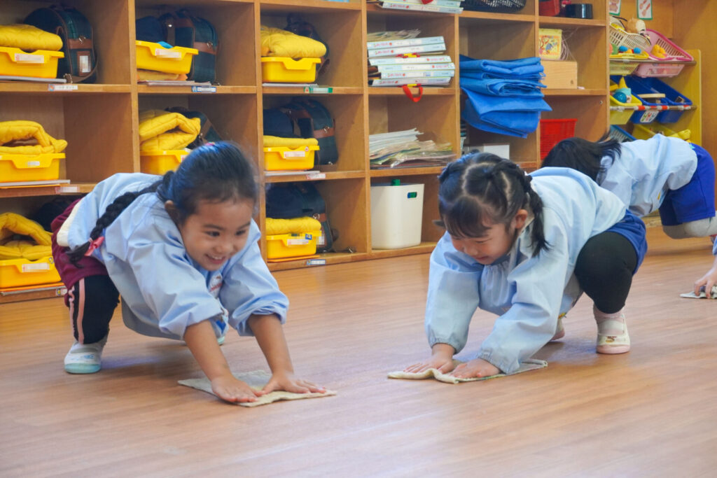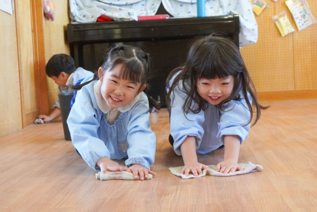1人1枚雑巾を持って、ピカピカ拭き掃除もしました。拭くのがこれまた上手!雑巾を固く絞れるようになり、友だちと「ここ汚いね」「でもきれいになったよ」と話をしながら楽しく大掃除ができました。