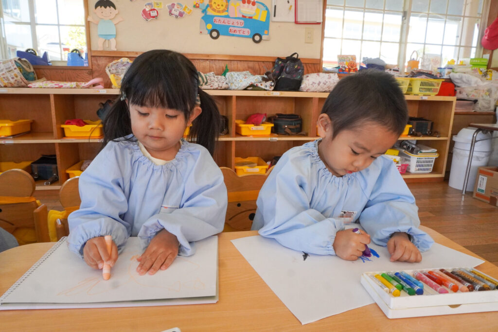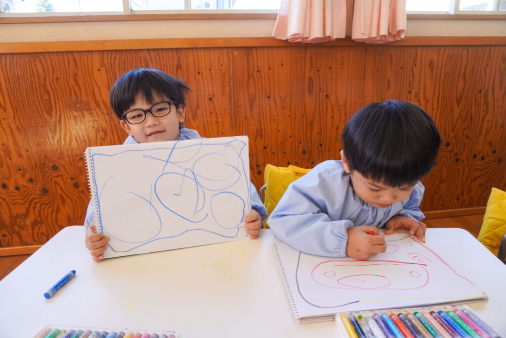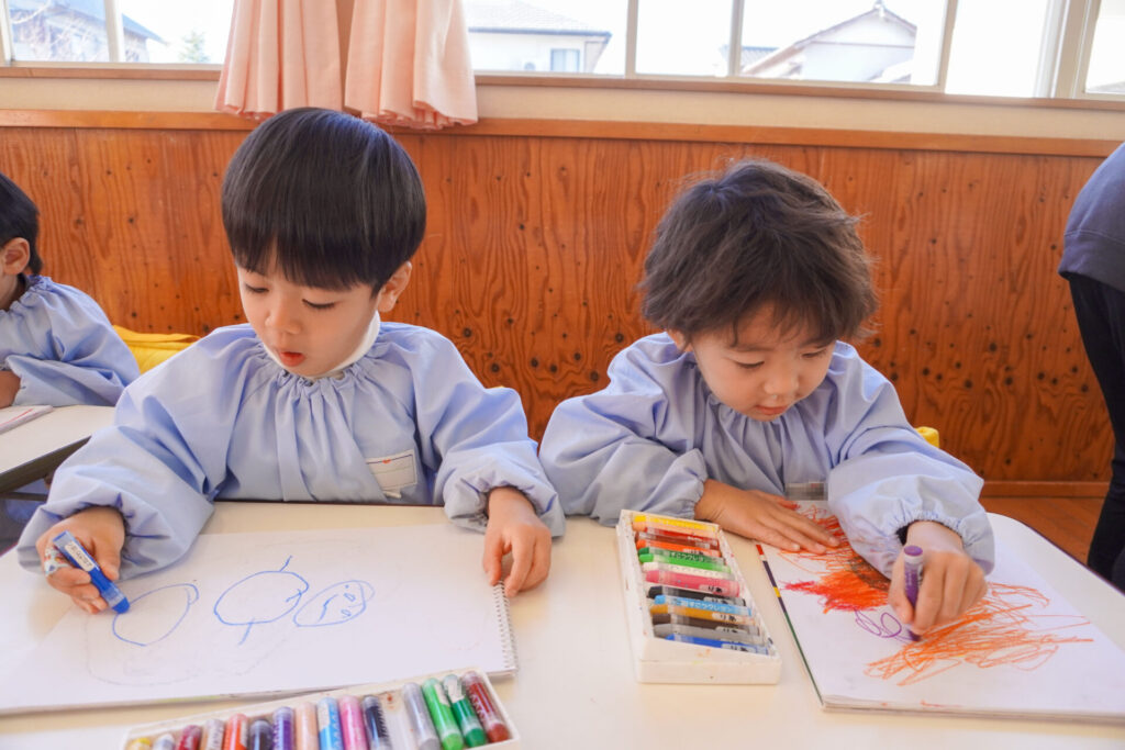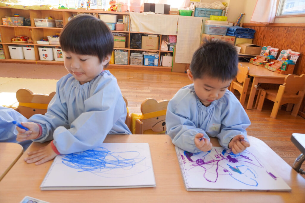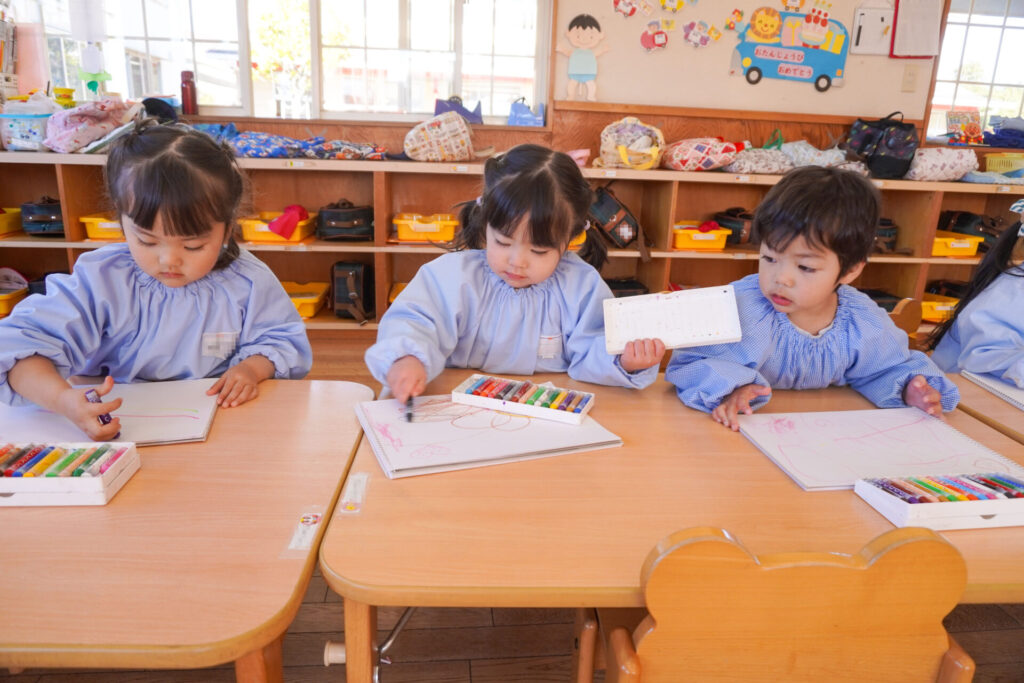 幼稚園で一番小さい満3歳児バンビ組さんは毎日元気いっぱいです!今日は、クレヨン遊びをしました。今は自由にぐるぐる描いたり、塗ったりする経験を積んでいます。そうして手首のひねりが上手になれば、筆圧も強くなり、表現力もついてきます。