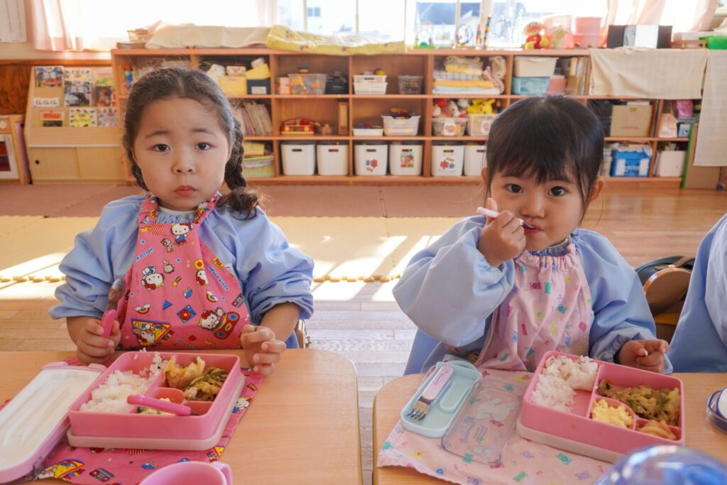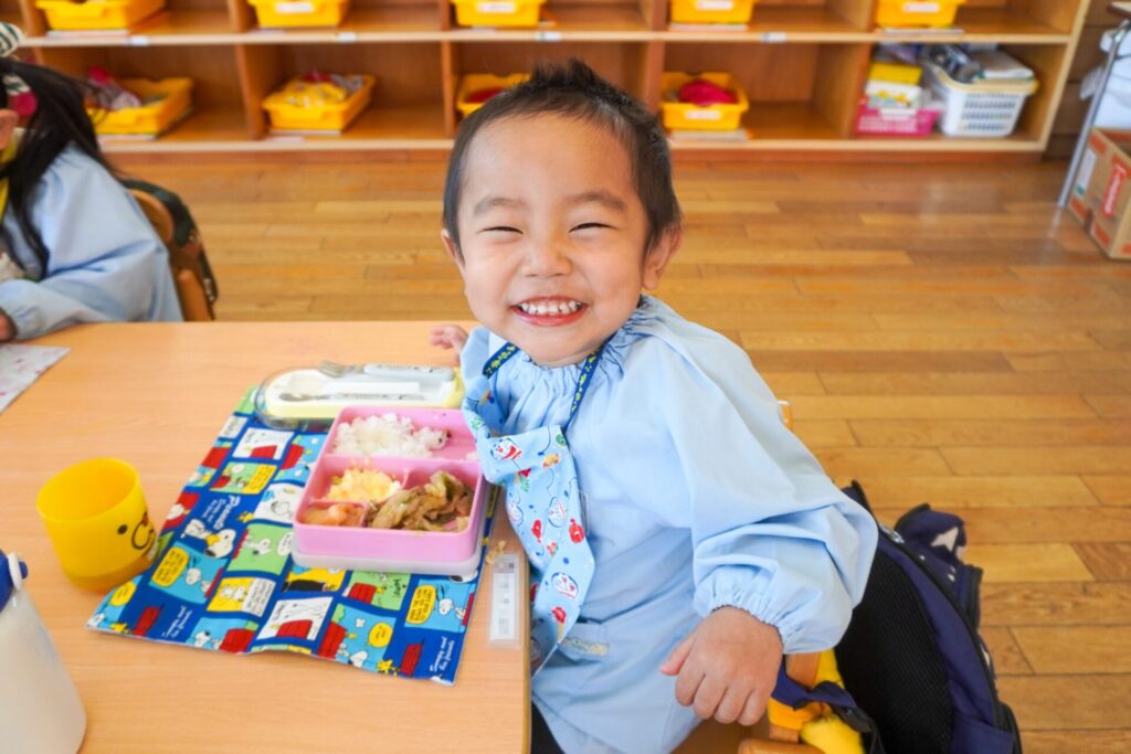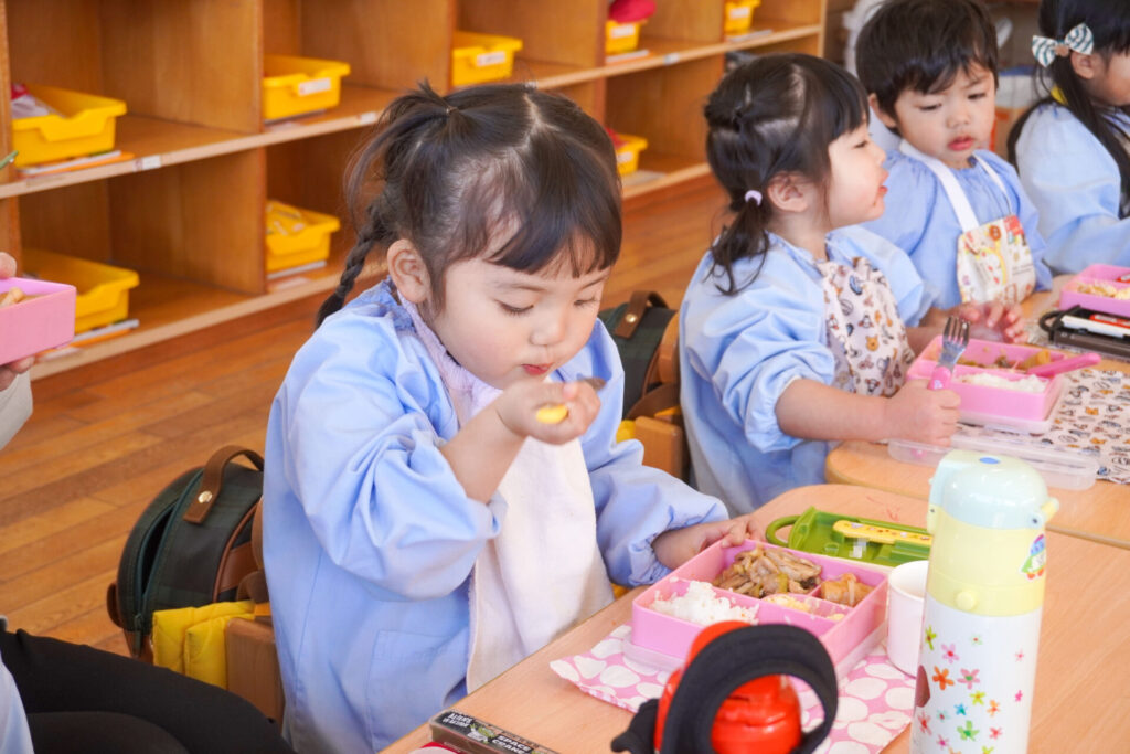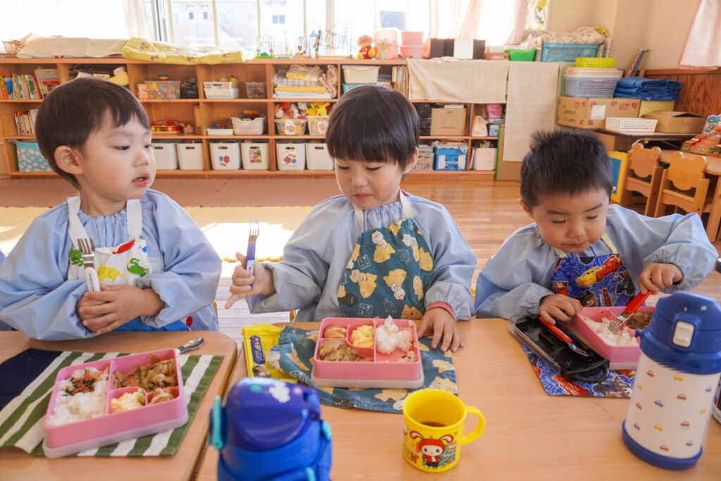 給食ももりもり食べます。今月の新入園児も少しずつ園生活に慣れ、笑顔も見られるようになりました。週末はゆっくり休んで来週も幼稚園で元気いっぱい遊びましょうね。今日も一段と寒くなりましたが、バンビ組は元気いっぱいです!