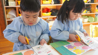 幼稚園で一番小さい満3歳児バンビ組さんは毎日元気いっぱいです!今日は、クレヨン遊びをしました。今は自由にぐるぐる描いたり、塗ったりする経験を積んでいます。そうして手首のひねりが上手になれば、筆圧も強くなり、表現力もついてきます。