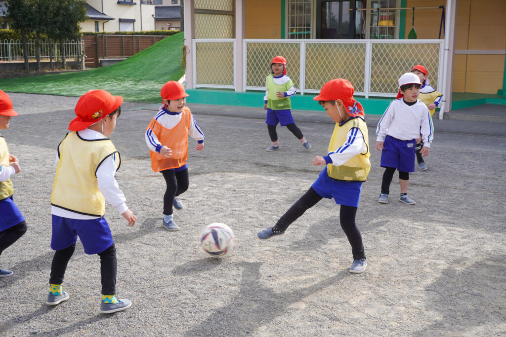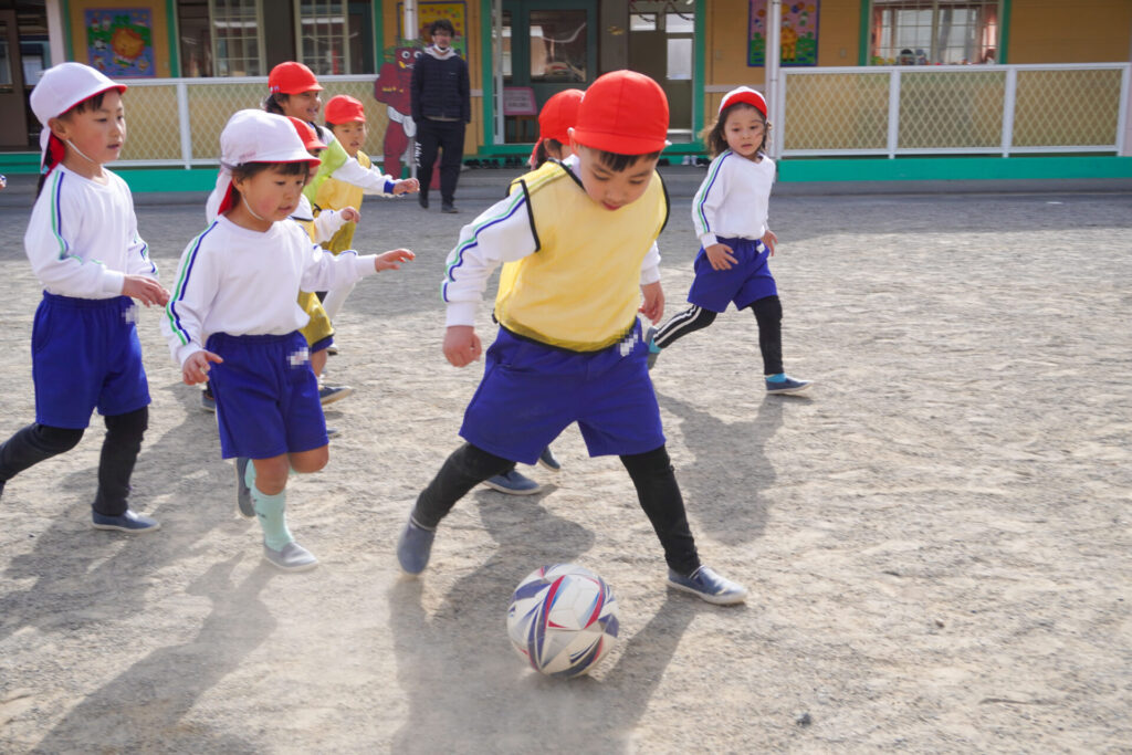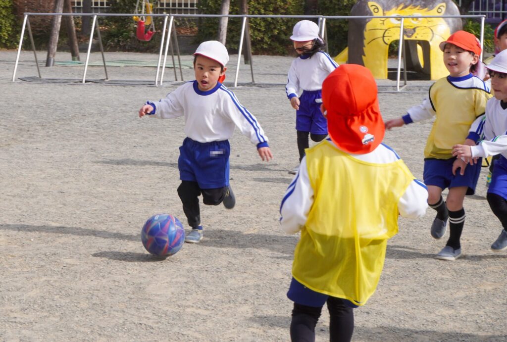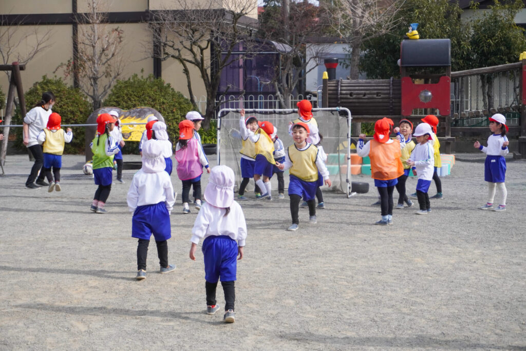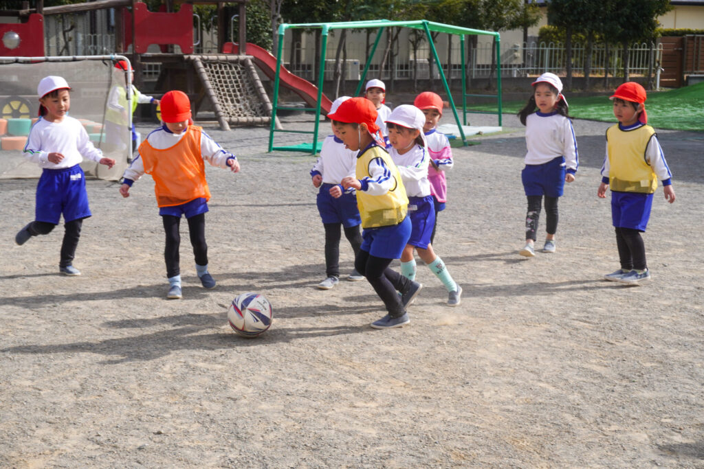 園での様子 サッカー(年中) madokahp 2026年1月20日 年中さくら組が「サッカー」で遊びました。来週、年長つき組との「サッカー大会」を計画しています。 どちらのゴールを狙うのかなど、ルールも少しずつ覚えてきました。2個のボールを使い分けて、ゴールを何とか割ろうと必死にボールを追いかけました。 園庭を所狭しと走り、めざせ、シュート!今日は転んでも泣きません。ゲーム終了のホイッスルが鳴るまで、息を切らしながらあちこちに走りました。 さくら組は、毎日元気いっぱいです!寒い日が続きますが、体調には気をつけて、明日も元気いっぱい遊びましょうね。