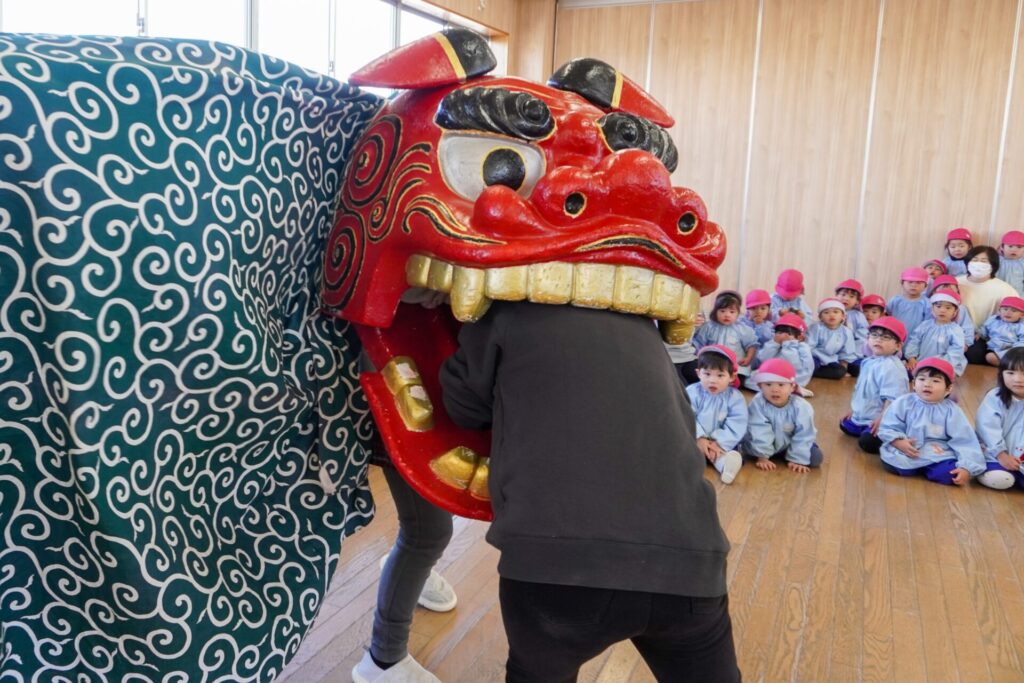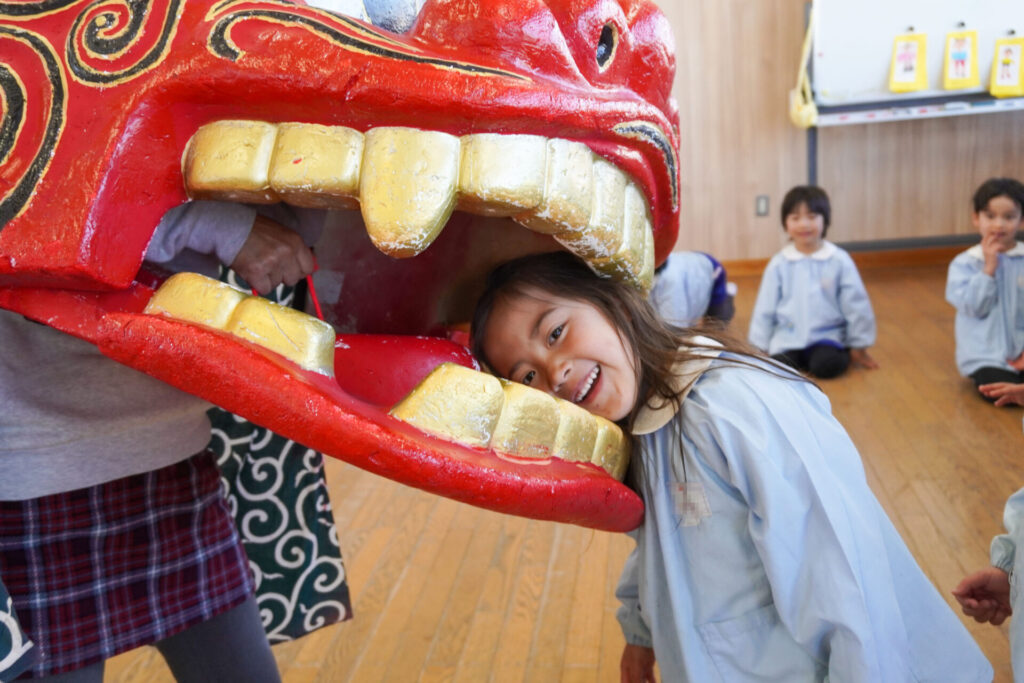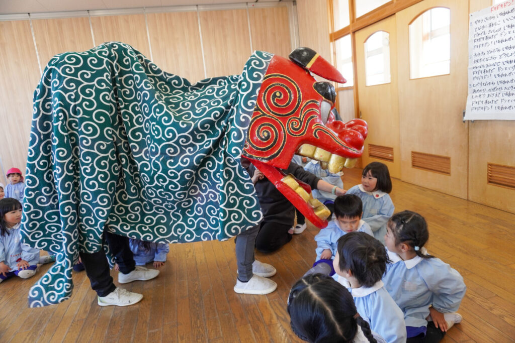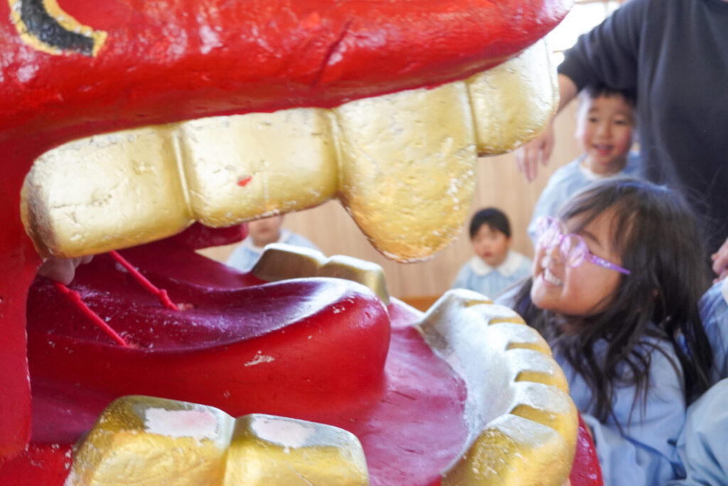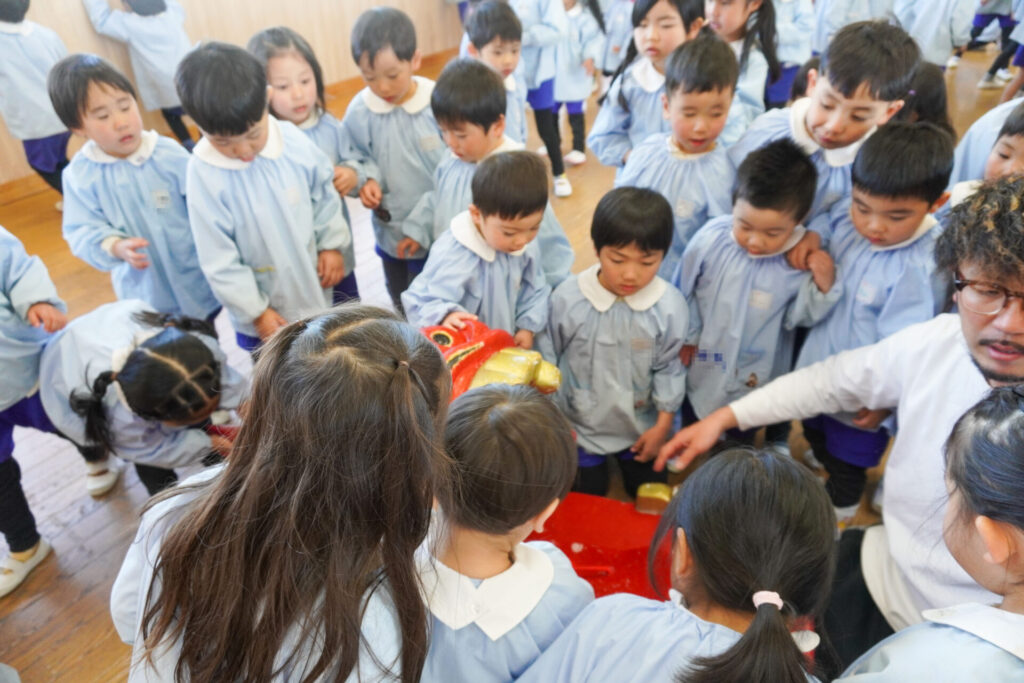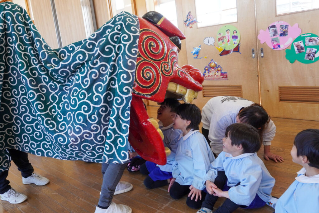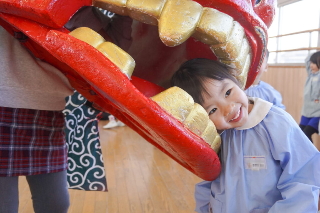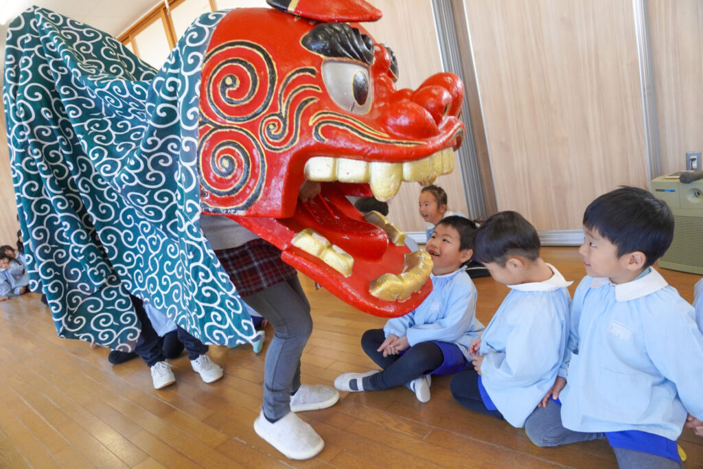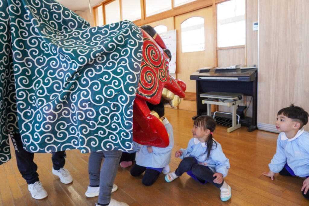 園での様子 獅子舞がやってきた! madokahp 2026年1月22日 日本では厄除けや無病息災を願う縁起物として、お正月やお祭りなどで親しまれている「獅子舞」が本日、まどか幼稚園へやってきました。 「獅子舞、いつ来る?」「ドキドキしちゃうな」と、緊張の面持ちでした。お囃子が鳴り、一瞬静まり返ると、何やら物音が…「獅子舞」の登場です!歓声があがりましたが、怖くなってしまう子もいました。 「獅子舞」が人の頭を噛むのは、邪気を払い、疫病を退治する縁起の良い行為とされています。希望者は「獅子舞」に頭を噛んでもらい、にこにこ笑顔です。 最後はまどかっこ全員で「獅子舞」と一緒に記念写真です!寒い日が続きますが、まどかっこが毎日元気に、健康に過ごせることを願っています。