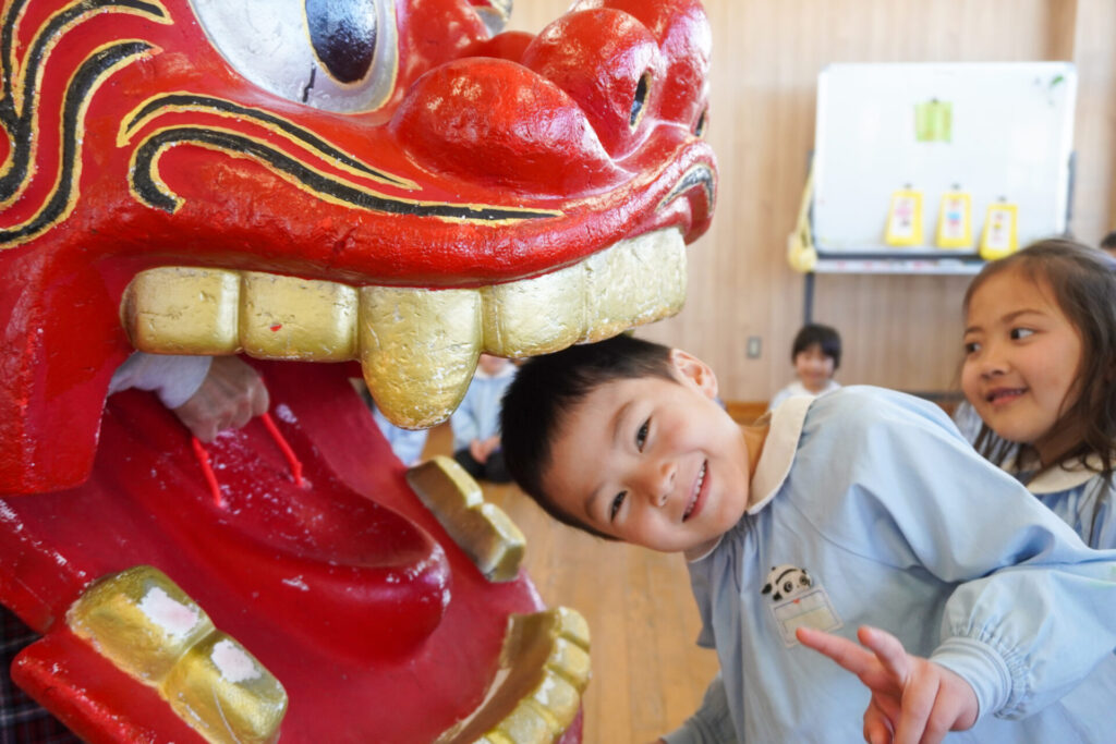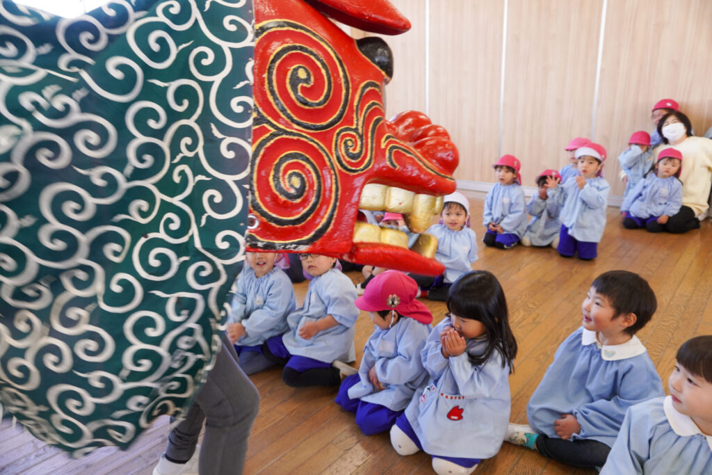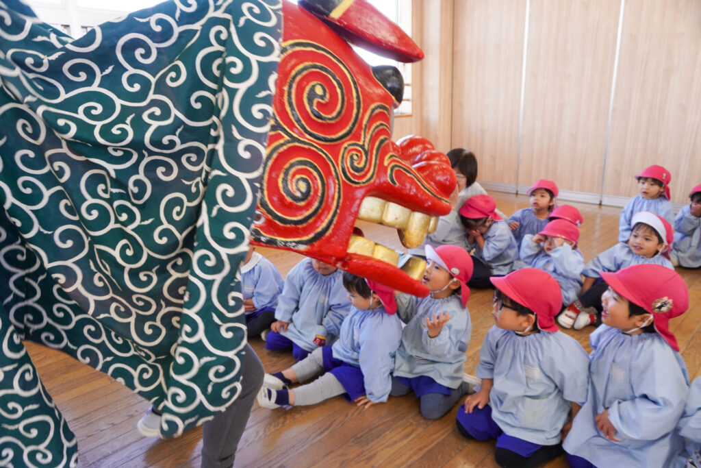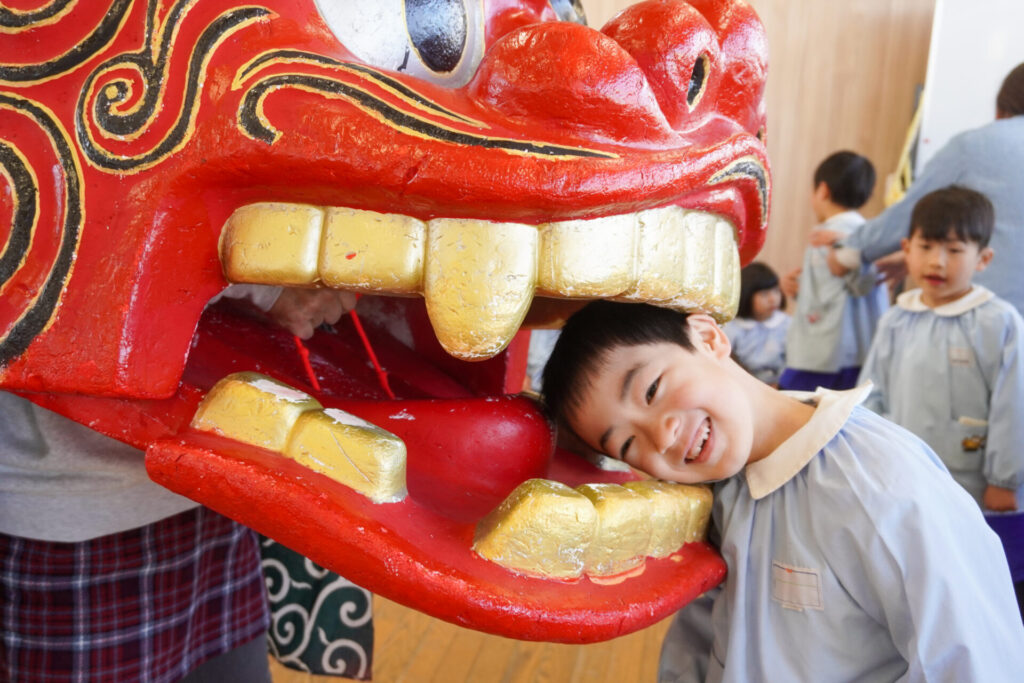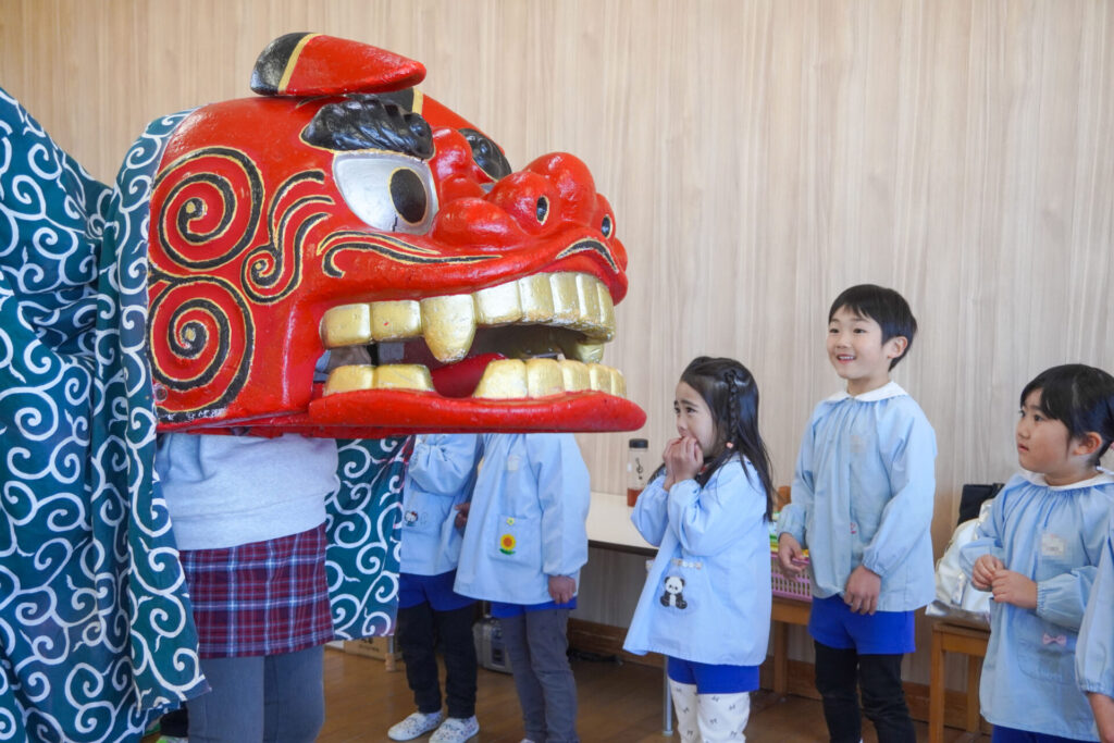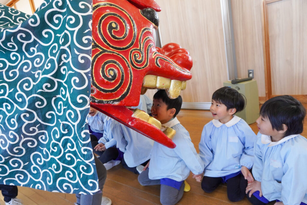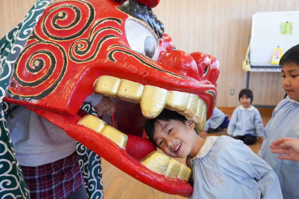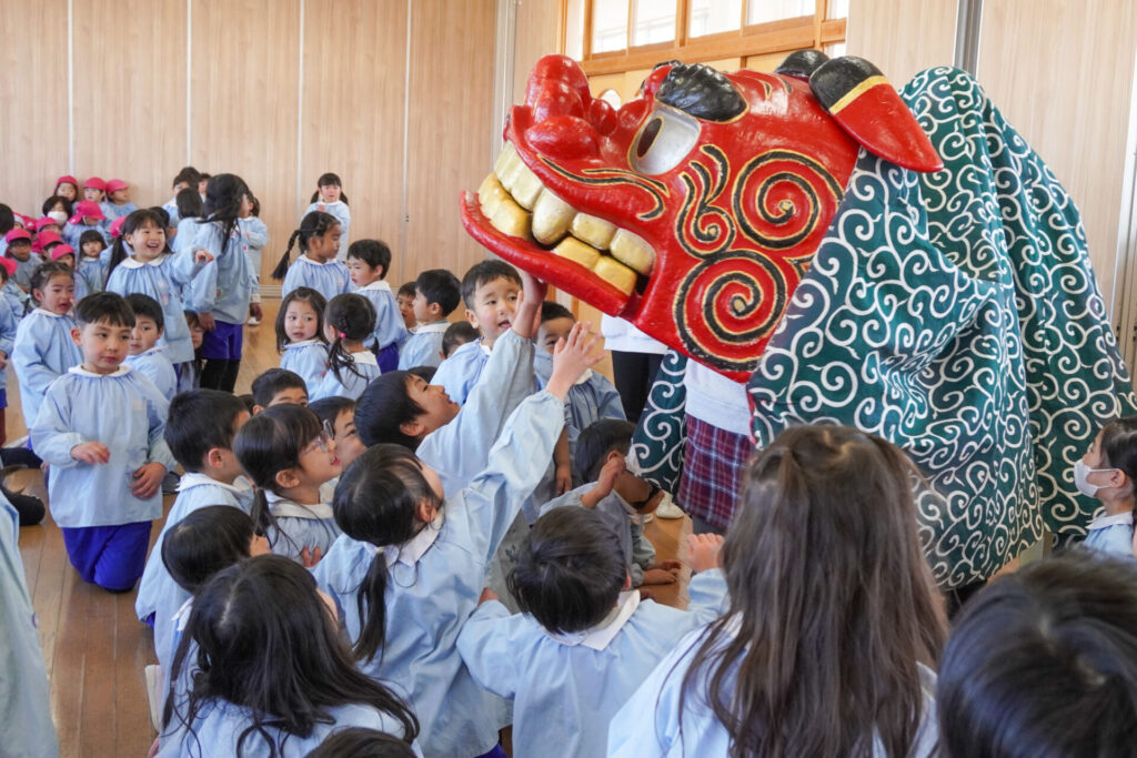 園での様子 獅子舞がやってきた! madokahp 2026年1月22日 日本では厄除けや無病息災を願う縁起物として、お正月やお祭りなどで親しまれている「獅子舞」が本日、まどか幼稚園へやってきました。 「獅子舞、いつ来る?」「ドキドキしちゃうな」と、緊張の面持ちでした。お囃子が鳴り、一瞬静まり返ると、何やら物音が…「獅子舞」の登場です!歓声があがりましたが、怖くなってしまう子もいました。 「獅子舞」が人の頭を噛むのは、邪気を払い、疫病を退治する縁起の良い行為とされています。希望者は「獅子舞」に頭を噛んでもらい、にこにこ笑顔です。 最後はまどかっこ全員で「獅子舞」と一緒に記念写真です!寒い日が続きますが、まどかっこが毎日元気に、健康に過ごせることを願っています。