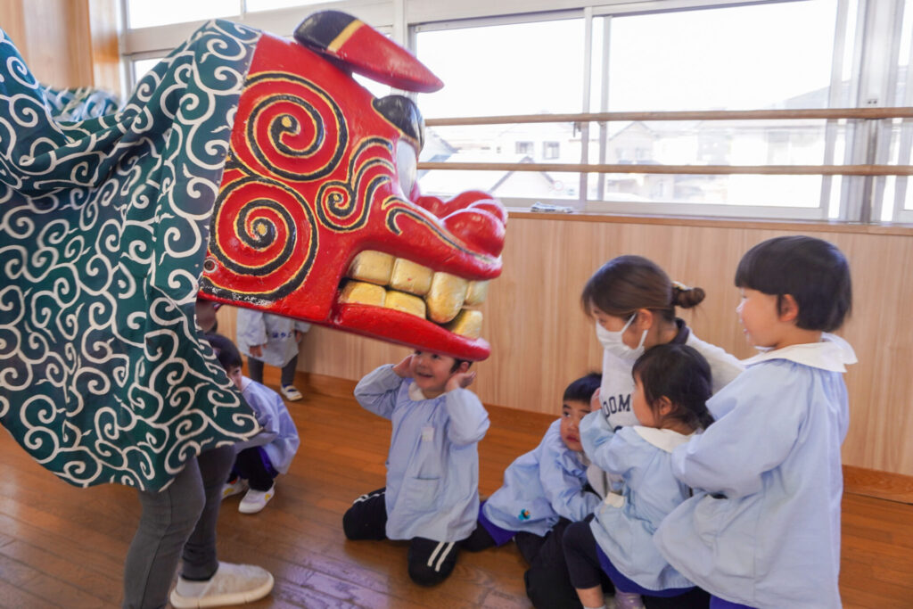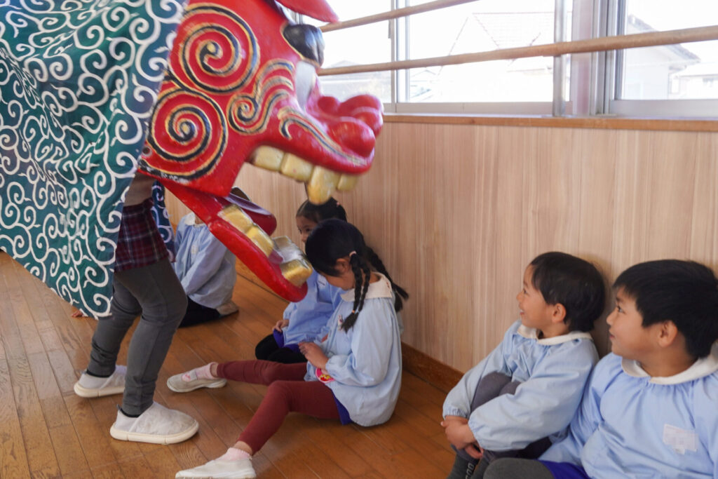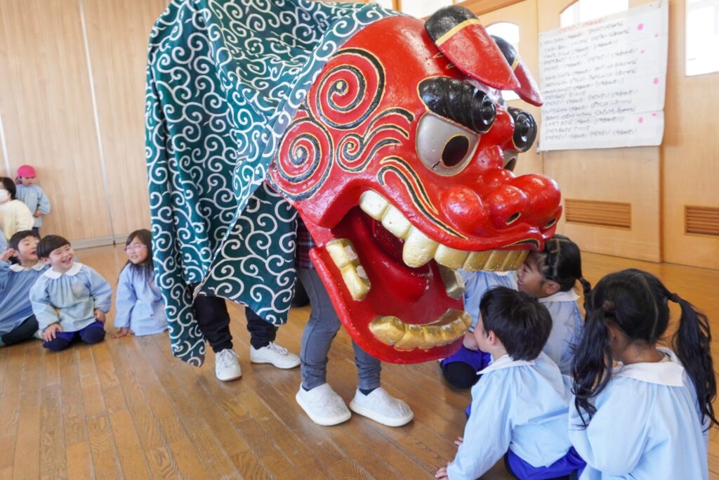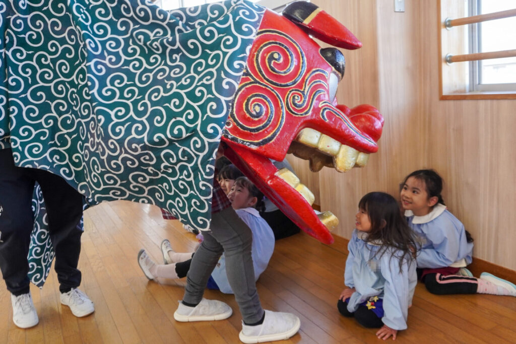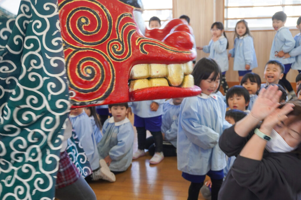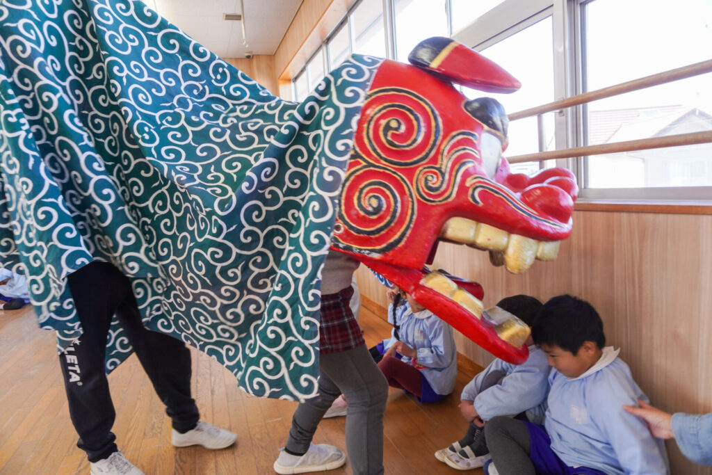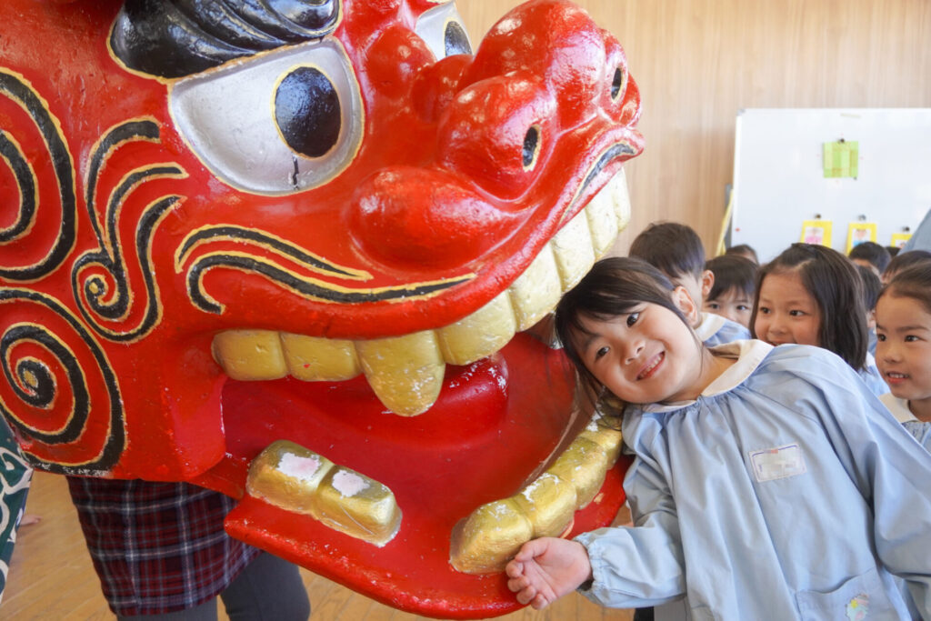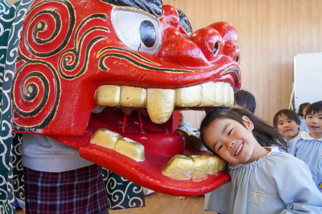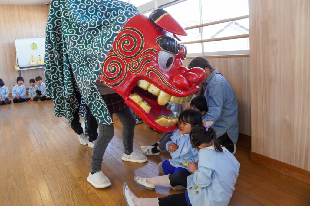 園での様子 獅子舞がやってきた! madokahp 2026年1月22日 日本では厄除けや無病息災を願う縁起物として、お正月やお祭りなどで親しまれている「獅子舞」が本日、まどか幼稚園へやってきました。 「獅子舞、いつ来る?」「ドキドキしちゃうな」と、緊張の面持ちでした。お囃子が鳴り、一瞬静まり返ると、何やら物音が…「獅子舞」の登場です!歓声があがりましたが、怖くなってしまう子もいました。 「獅子舞」が人の頭を噛むのは、邪気を払い、疫病を退治する縁起の良い行為とされています。希望者は「獅子舞」に頭を噛んでもらい、にこにこ笑顔です。 最後はまどかっこ全員で「獅子舞」と一緒に記念写真です!寒い日が続きますが、まどかっこが毎日元気に、健康に過ごせることを願っています。