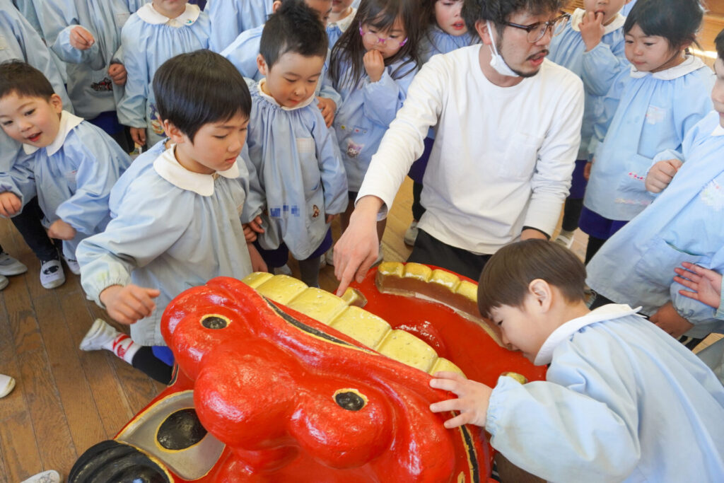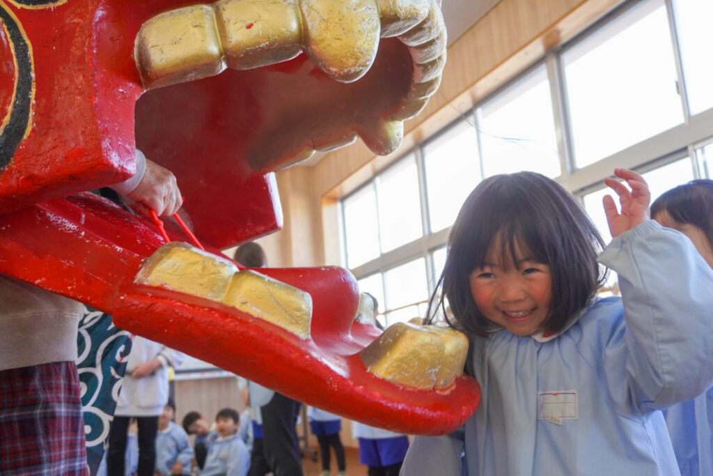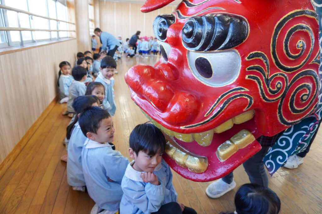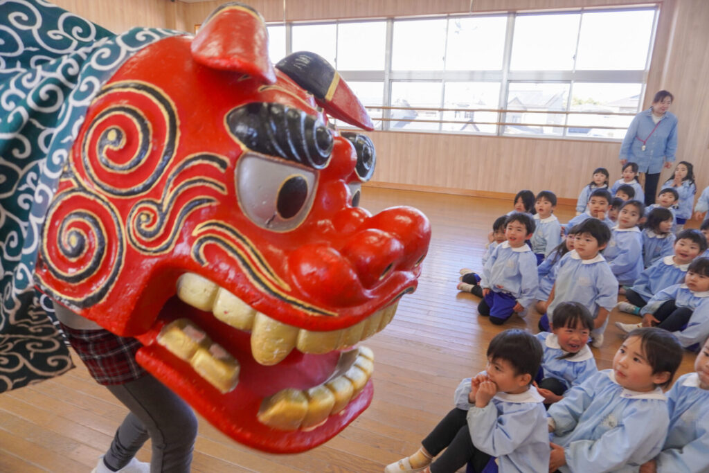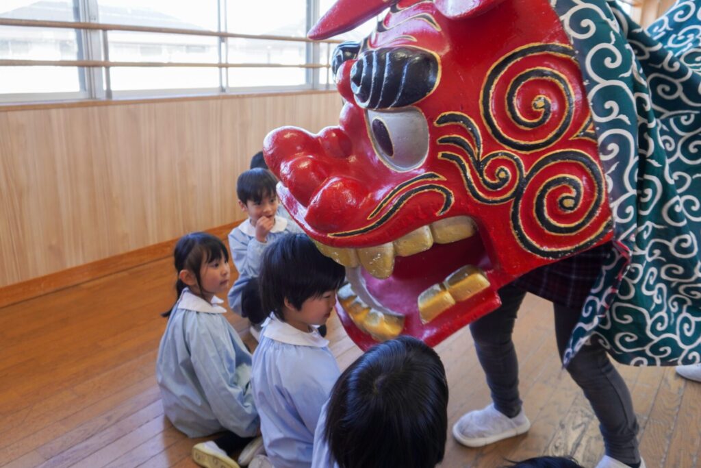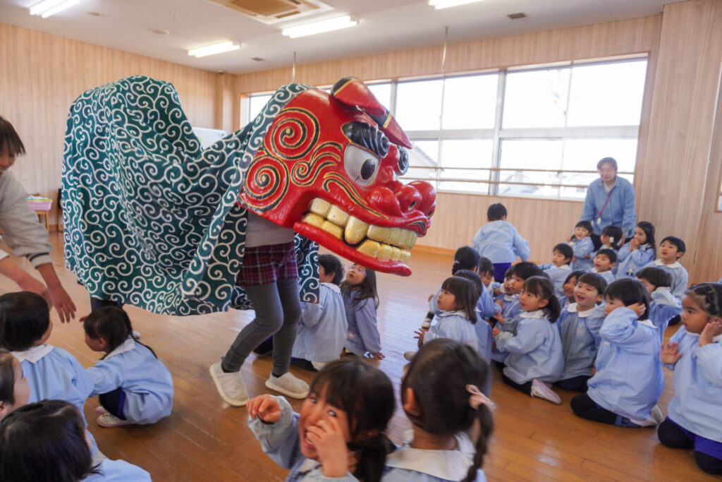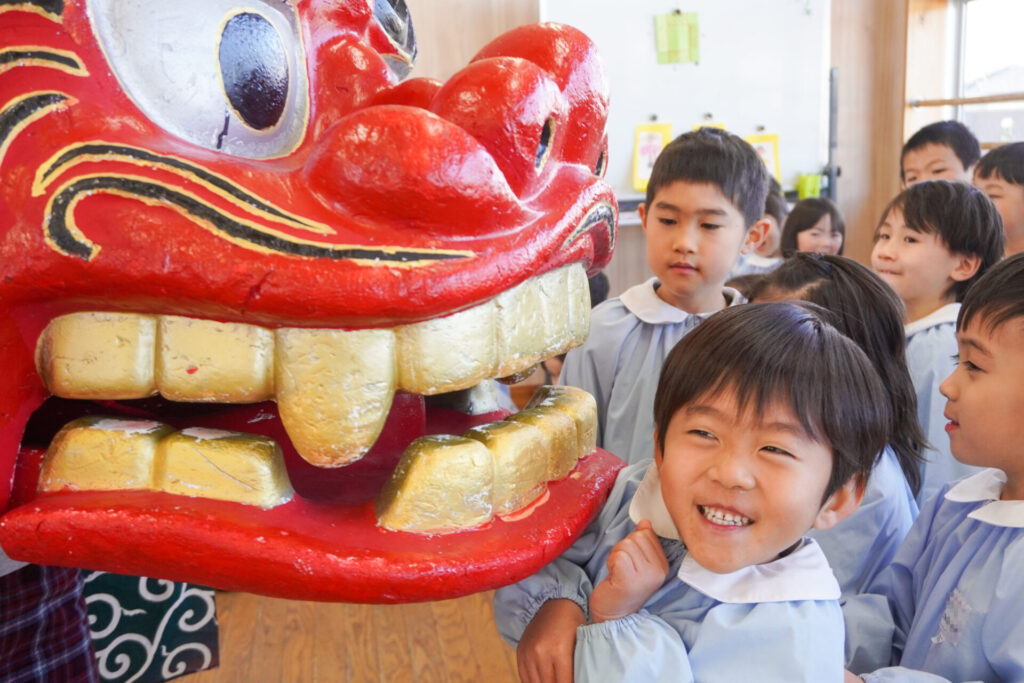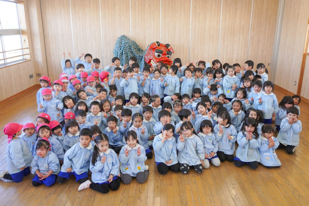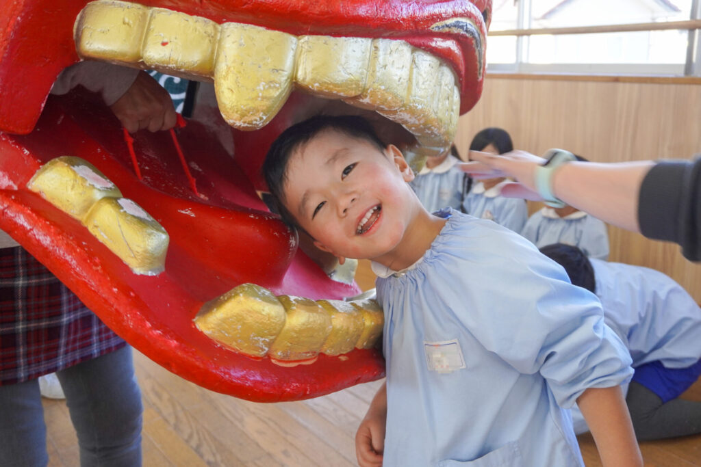 園での様子 獅子舞がやってきた! madokahp 2026年1月22日 日本では厄除けや無病息災を願う縁起物として、お正月やお祭りなどで親しまれている「獅子舞」が本日、まどか幼稚園へやってきました。 「獅子舞、いつ来る?」「ドキドキしちゃうな」と、緊張の面持ちでした。お囃子が鳴り、一瞬静まり返ると、何やら物音が…「獅子舞」の登場です!歓声があがりましたが、怖くなってしまう子もいました。 「獅子舞」が人の頭を噛むのは、邪気を払い、疫病を退治する縁起の良い行為とされています。希望者は「獅子舞」に頭を噛んでもらい、にこにこ笑顔です。 最後はまどかっこ全員で「獅子舞」と一緒に記念写真です!寒い日が続きますが、まどかっこが毎日元気に、健康に過ごせることを願っています。
