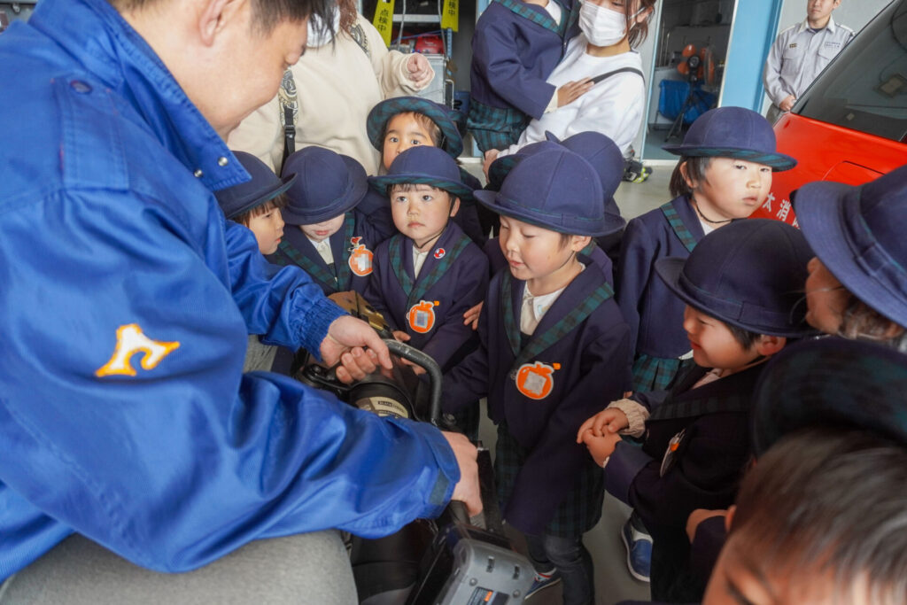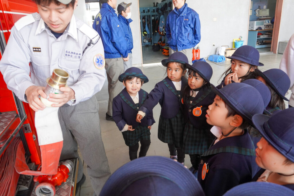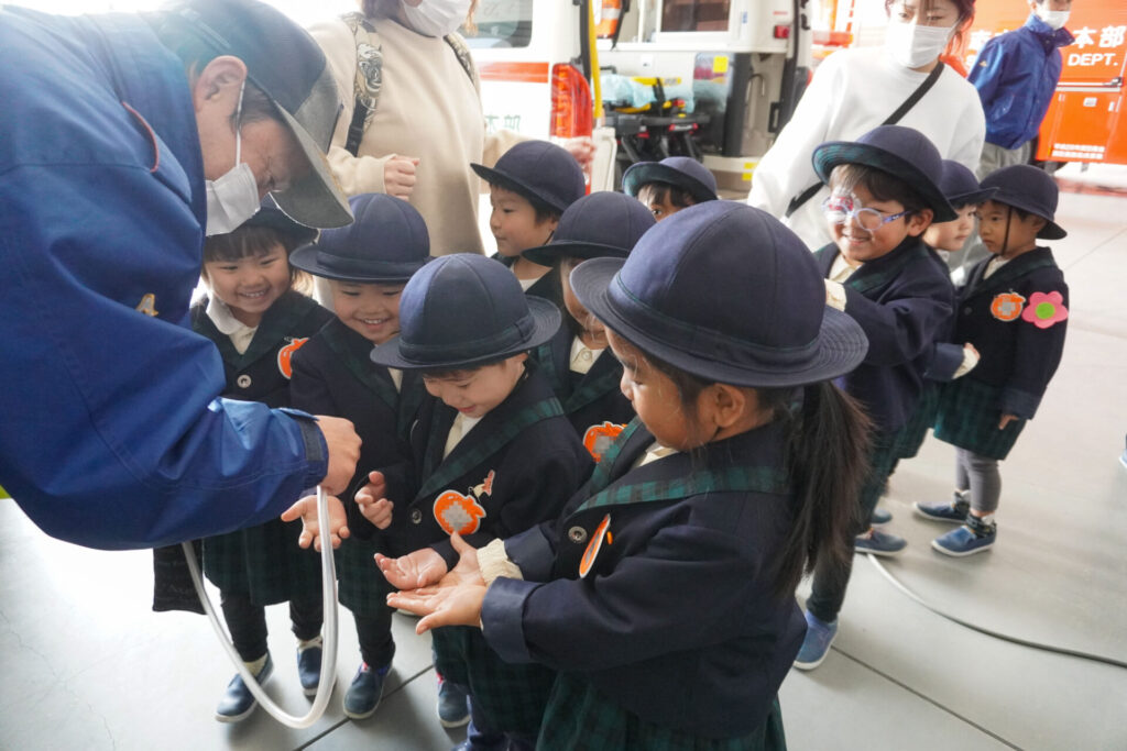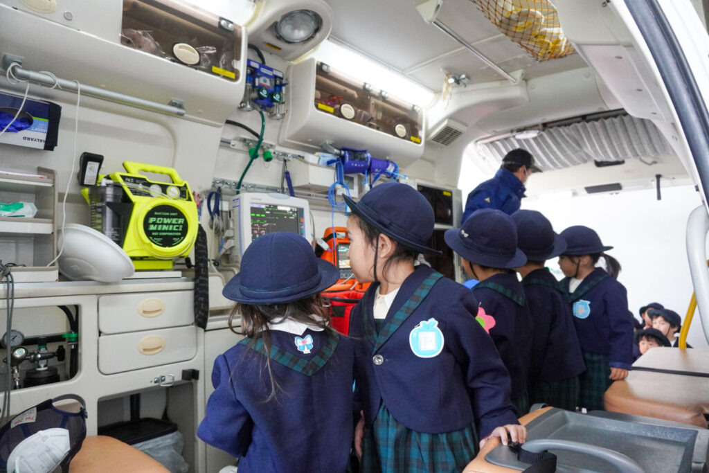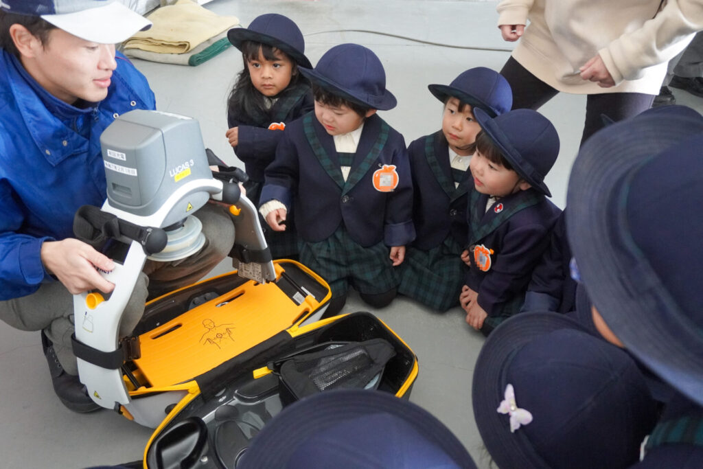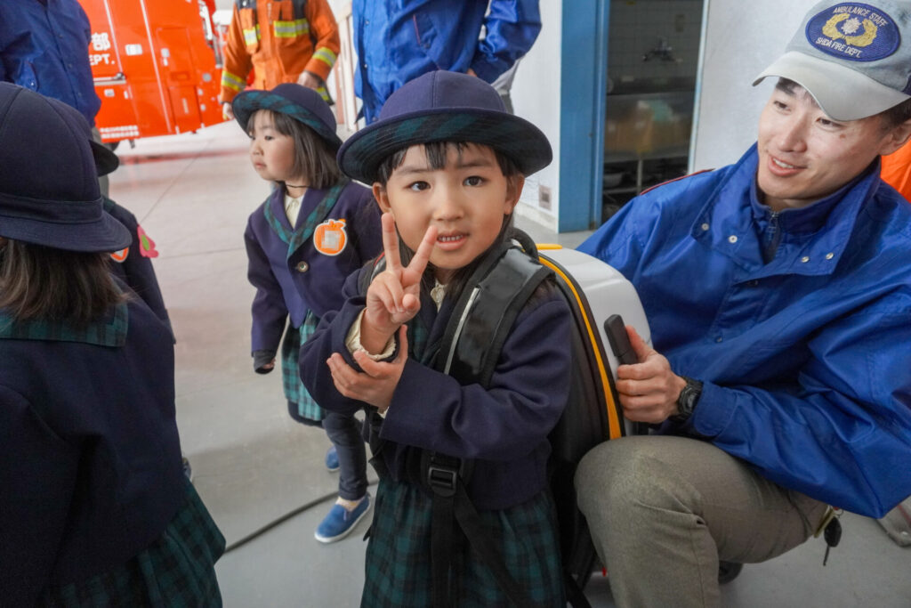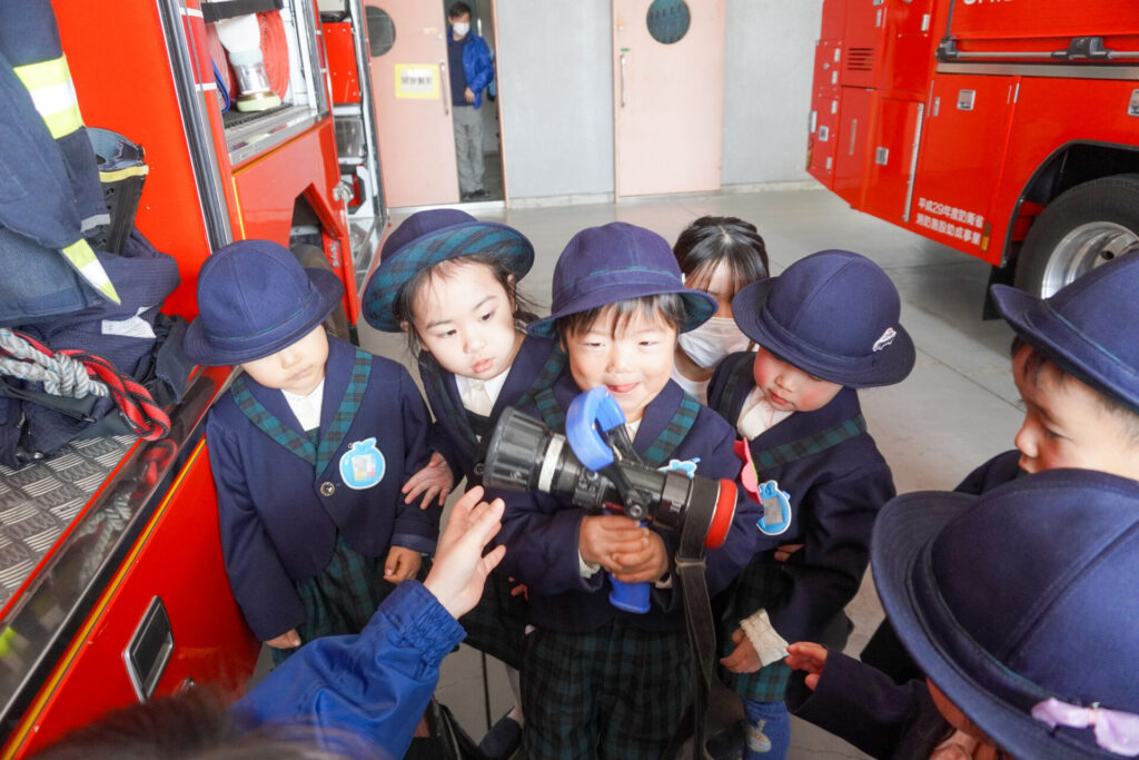 園での様子 防災体験(年少) madokahp 2026年1月26日 年少ゆり組・ばら組がスクールバスに乗って「消防防災センター」へ防災体験へ出かけました。 最初の「地震体験」では、少しずつ震度が大きくなっていく体験をしました「風水害体験(映像)」ではバケツや自転車が飛んできたり、建物の看板が強風ではがれたり、道路のあちこちで冠水が起きたり…実際に風を受けながら、リアルな体験をすることができました。 「防災シアター」では防災アニメ映像を鑑賞しました。見て、聞いて、考えて、またひとつ、大切な知識が増えました。 車両見学では「救急車」の中に実際に乗せていただき、車内に積載されているたくさんの医療器具・道具を見せていただきました。志太地区で導入した最新の救急車はストレッチャーが自動で作動するそうです。救助率の高さに期待がもてます。 次は「消防車」です。火事発生時、高い建物や消防車が入りにくい場所でも対応できるように、水は約4,500リットルを積載、またホースは約20メートル伸びるそうです。 今日は戸外での訓練の様子も見せていただきました。万が一の際はロープを伝って建物から建物へ…いかに速く確実に渡れるか、緊張感の中、訓練に励まれていました。 今日の体験を通して、またひとつ、危機意識が高まり、興味も広がったことと思います「消防防災センター」の皆さん、ありがとうございました。