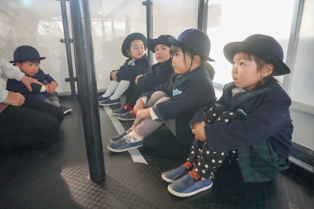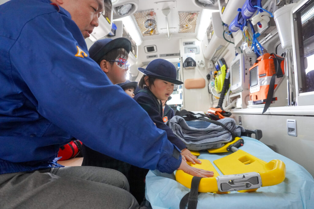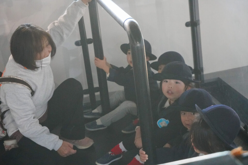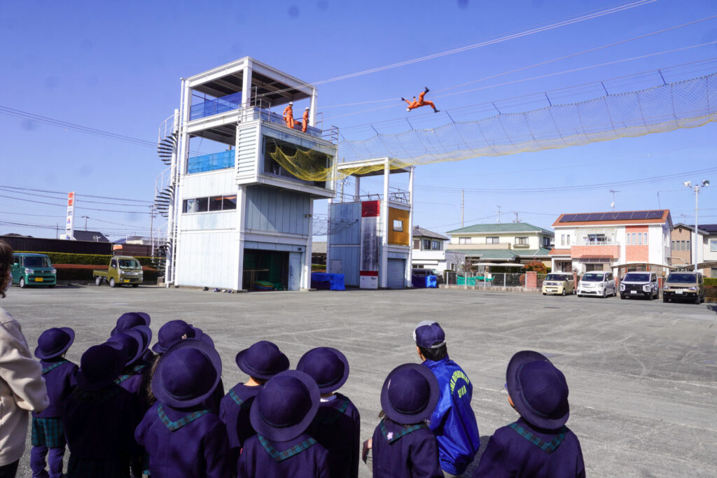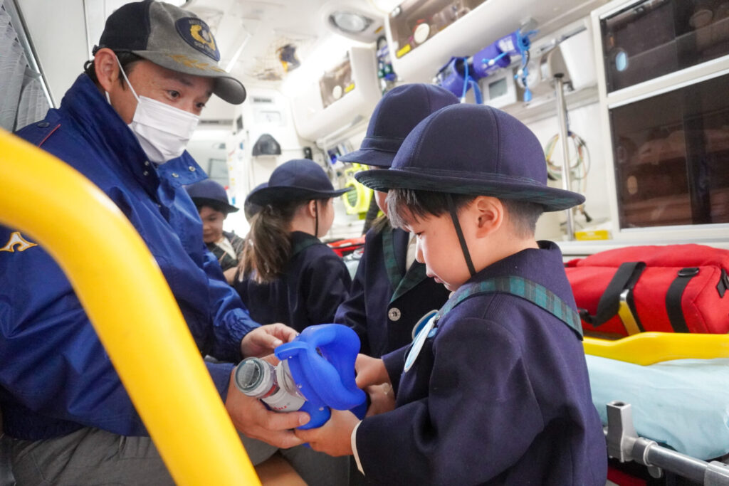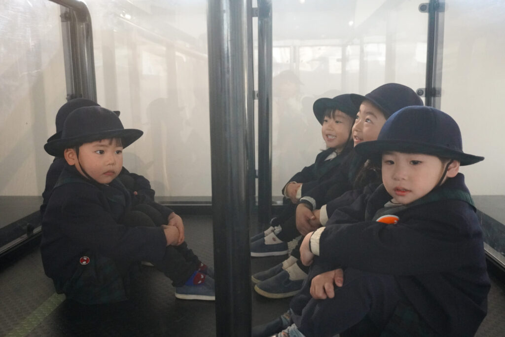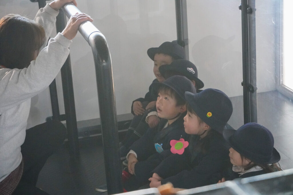 園での様子 防災体験(年少) madokahp 2026年1月26日 年少ゆり組・ばら組がスクールバスに乗って「消防防災センター」へ防災体験へ出かけました。 最初の「地震体験」では、少しずつ震度が大きくなっていく体験をしました「風水害体験(映像)」ではバケツや自転車が飛んできたり、建物の看板が強風ではがれたり、道路のあちこちで冠水が起きたり…実際に風を受けながら、リアルな体験をすることができました。 「防災シアター」では防災アニメ映像を鑑賞しました。見て、聞いて、考えて、またひとつ、大切な知識が増えました。 車両見学では「救急車」の中に実際に乗せていただき、車内に積載されているたくさんの医療器具・道具を見せていただきました。志太地区で導入した最新の救急車はストレッチャーが自動で作動するそうです。救助率の高さに期待がもてます。 次は「消防車」です。火事発生時、高い建物や消防車が入りにくい場所でも対応できるように、水は約4,500リットルを積載、またホースは約20メートル伸びるそうです。 今日は戸外での訓練の様子も見せていただきました。万が一の際はロープを伝って建物から建物へ…いかに速く確実に渡れるか、緊張感の中、訓練に励まれていました。 今日の体験を通して、またひとつ、危機意識が高まり、興味も広がったことと思います「消防防災センター」の皆さん、ありがとうございました。