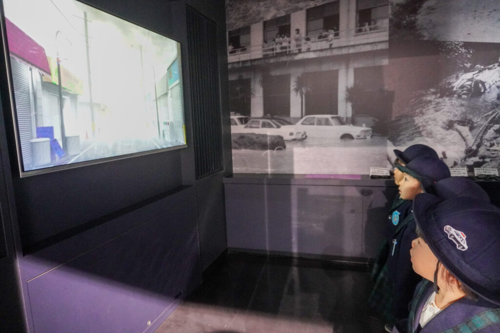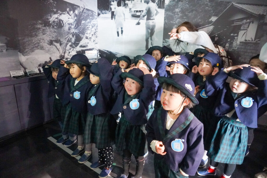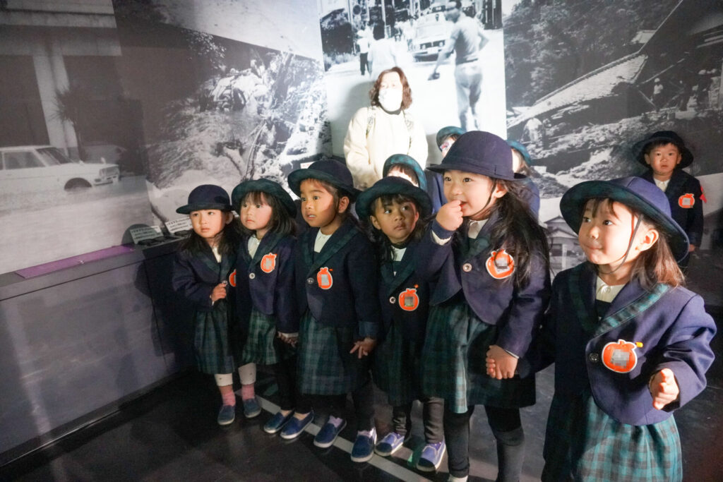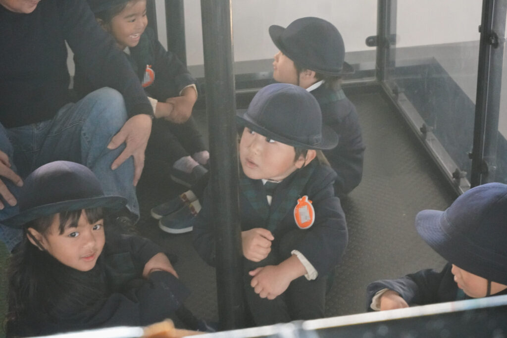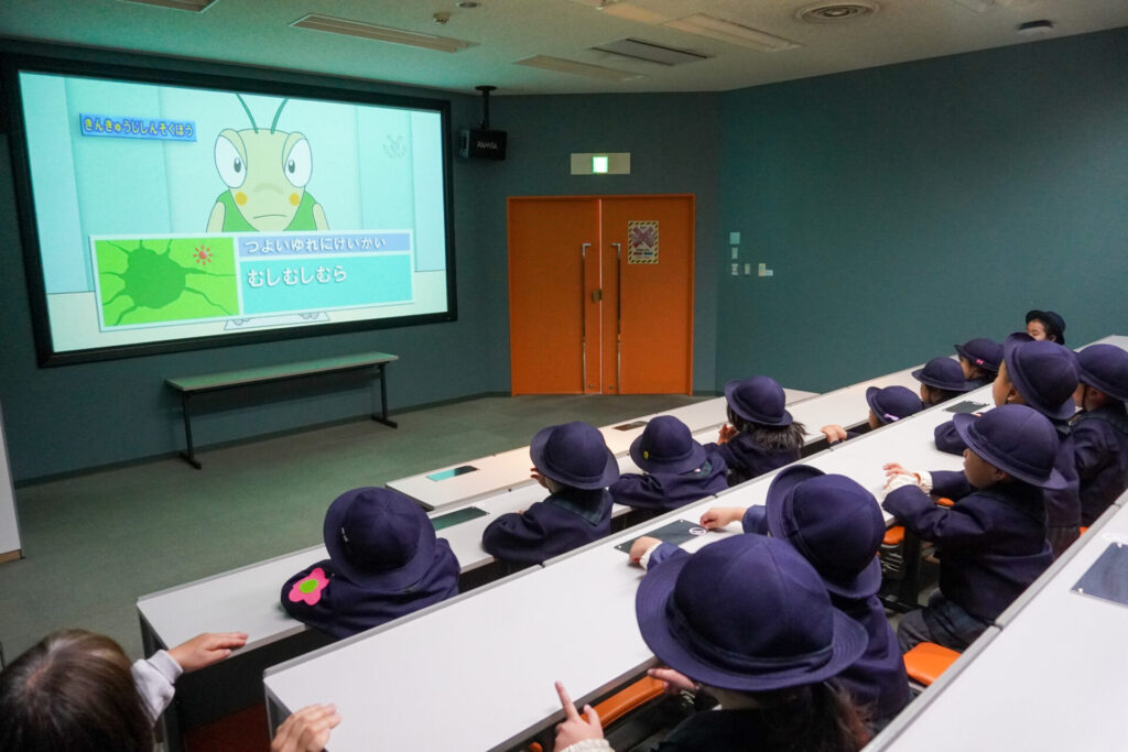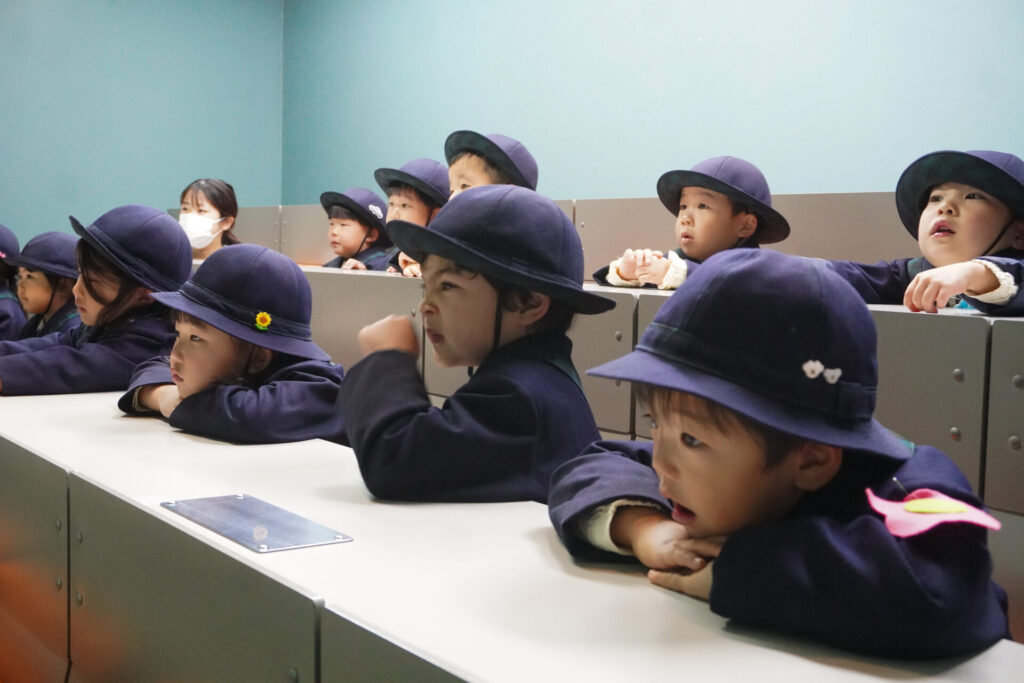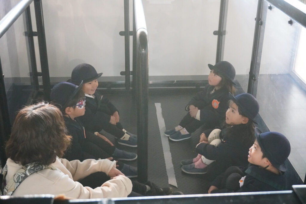 園での様子 防災体験(年少) madokahp 2026年1月26日 年少ゆり組・ばら組がスクールバスに乗って「消防防災センター」へ防災体験へ出かけました。 最初の「地震体験」では、少しずつ震度が大きくなっていく体験をしました「風水害体験(映像)」ではバケツや自転車が飛んできたり、建物の看板が強風ではがれたり、道路のあちこちで冠水が起きたり…実際に風を受けながら、リアルな体験をすることができました。 「防災シアター」では防災アニメ映像を鑑賞しました。見て、聞いて、考えて、またひとつ、大切な知識が増えました。 車両見学では「救急車」の中に実際に乗せていただき、車内に積載されているたくさんの医療器具・道具を見せていただきました。志太地区で導入した最新の救急車はストレッチャーが自動で作動するそうです。救助率の高さに期待がもてます。 次は「消防車」です。火事発生時、高い建物や消防車が入りにくい場所でも対応できるように、水は約4,500リットルを積載、またホースは約20メートル伸びるそうです。 今日は戸外での訓練の様子も見せていただきました。万が一の際はロープを伝って建物から建物へ…いかに速く確実に渡れるか、緊張感の中、訓練に励まれていました。 今日の体験を通して、またひとつ、危機意識が高まり、興味も広がったことと思います「消防防災センター」の皆さん、ありがとうございました。
