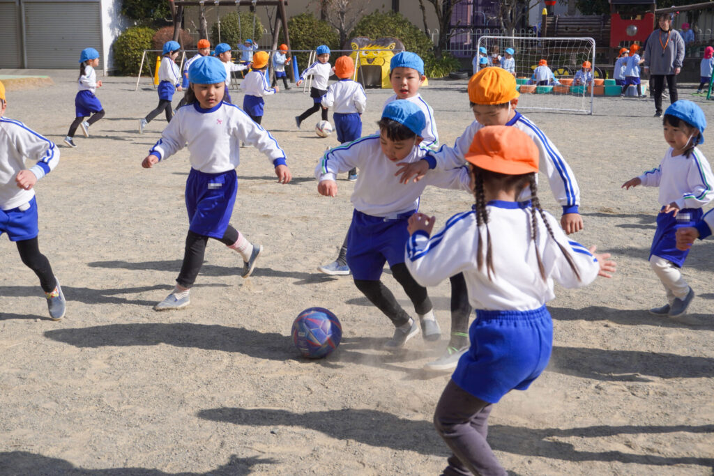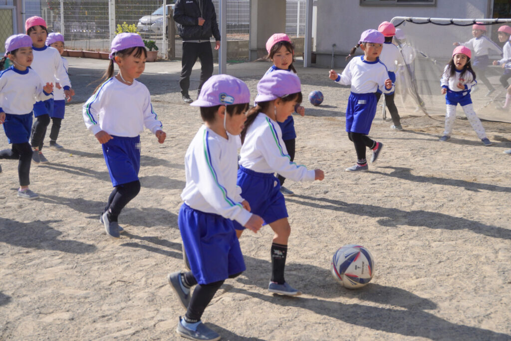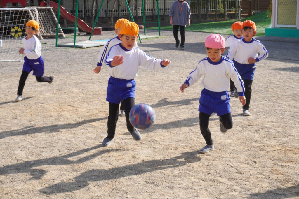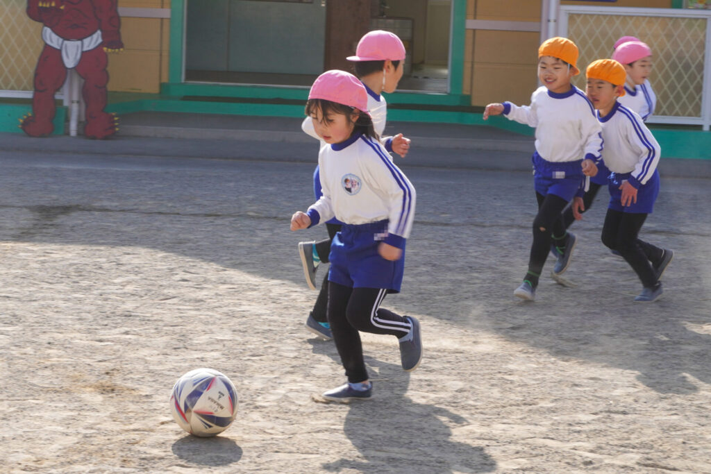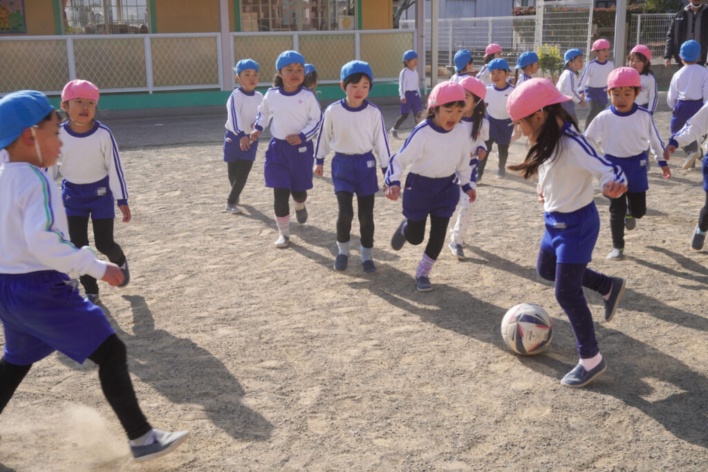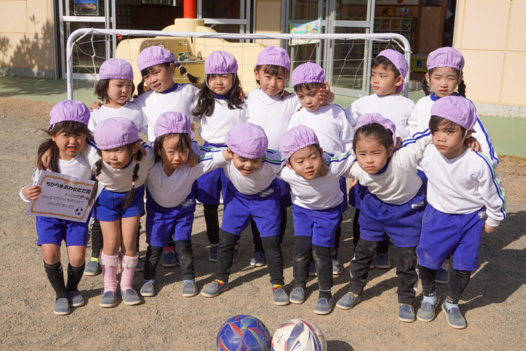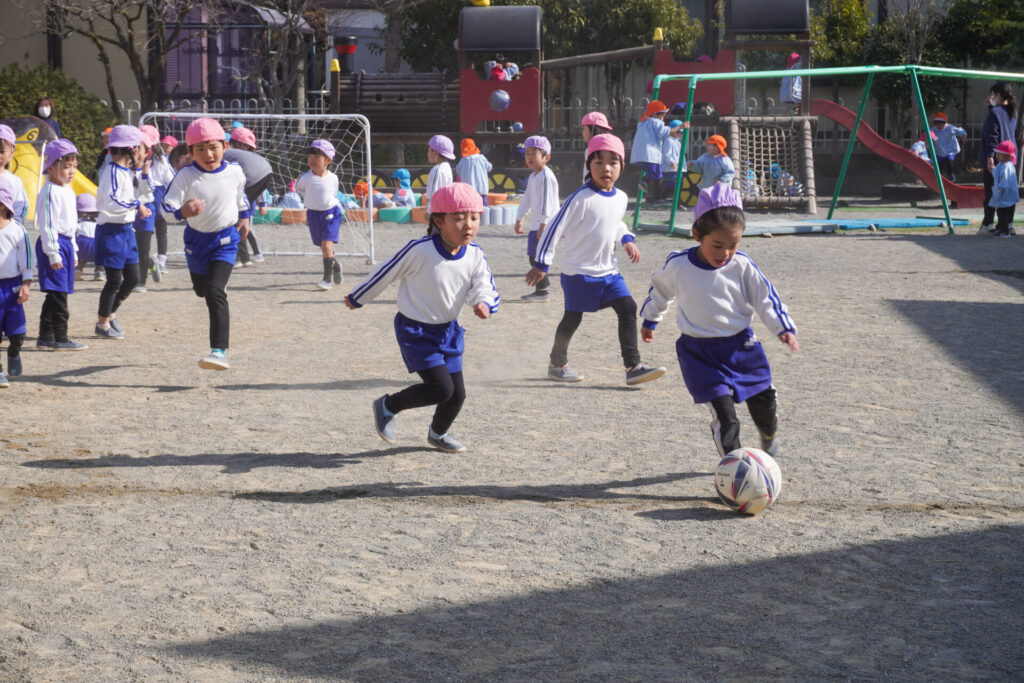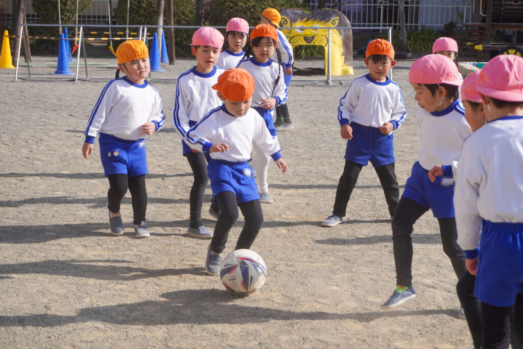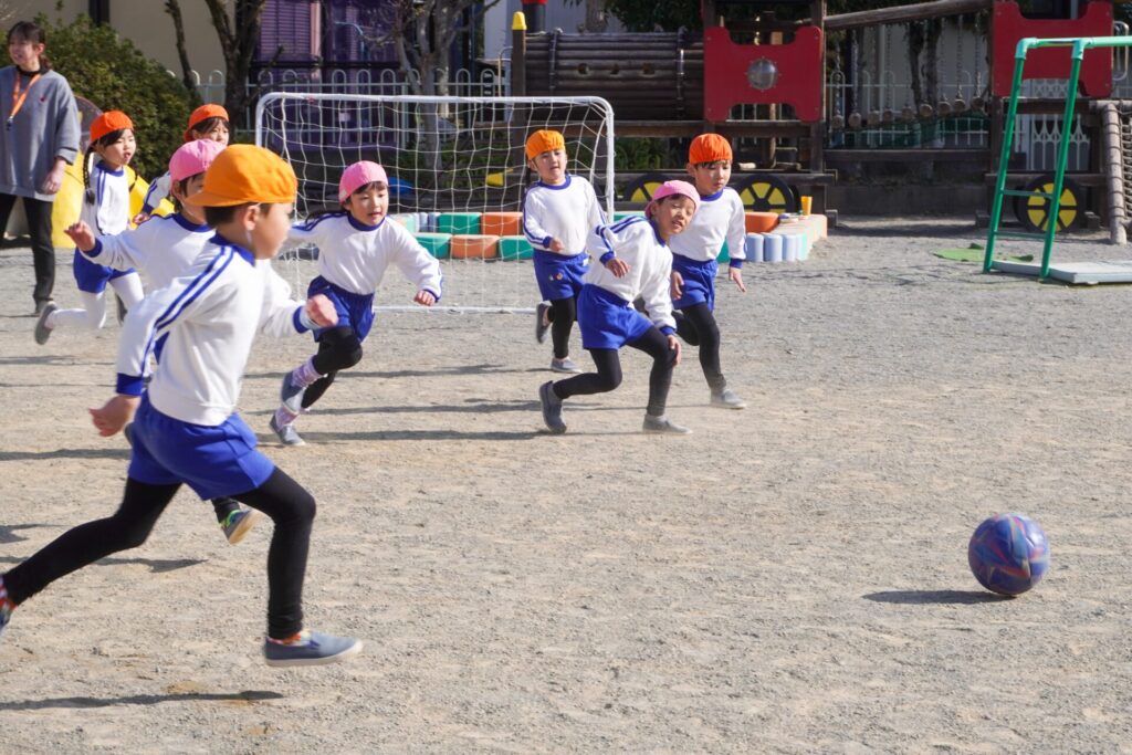 園での様子 サッカー大会(年長・年中) madokahp 2026年1月27日 今日は、年長つき組・年中さくら組の「サッカー大会」でした。気温が上がり、きれいな青空の下、堂々の選手入場です!年少ゆり組・ばら組、満3歳バンビ組の応援を受けて、さぁ、試合開始のホイッスルが鳴りました。 遊び始めの頃はボールを取れないとすぐに諦めてしまいましたが、取られたら取り返す気持ちが大きくなり、ボールを追いかけようと姿が見られるようになりました。 ドリブルもできるようになり、シュートのチャンスも巡ってきます。でもそこを上手くカットして点が入るのを阻止したり、試合ごとに各チームの見せ場があり、最後の最後まで走りっぱなしの「サッカー大会」でした。 勝って喜ぶチーム、負けて悔しがるチーム…次の試合につながる「サッカー大会」になりました。 2月は「相撲大会~まどか場所~」を予定しています。次回も最後までがんばる力を大いに発揮してほしいと願っています。