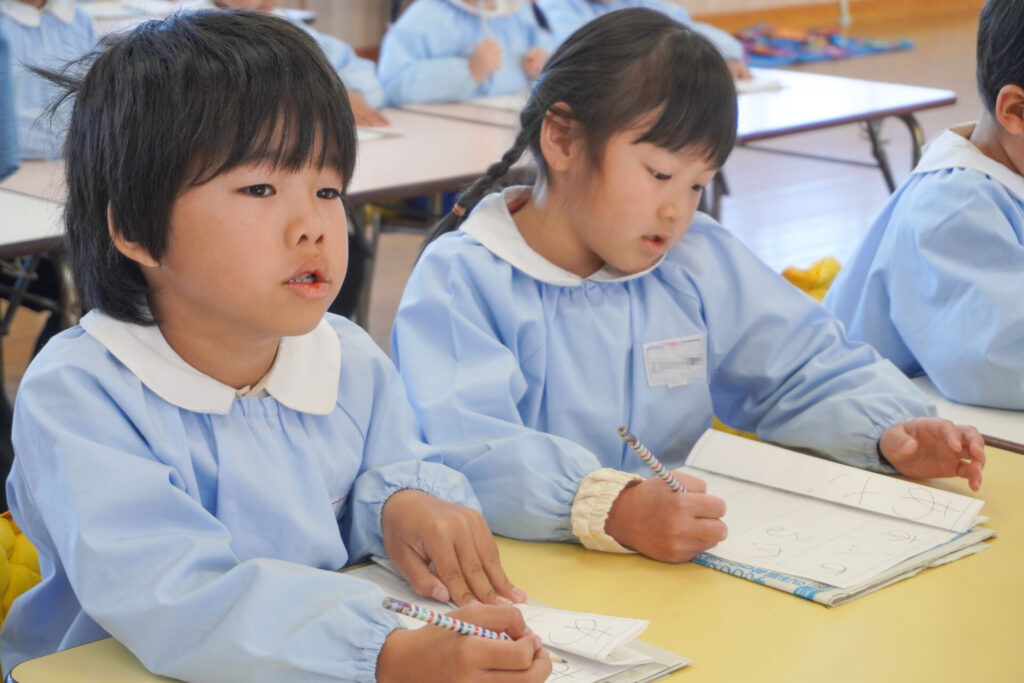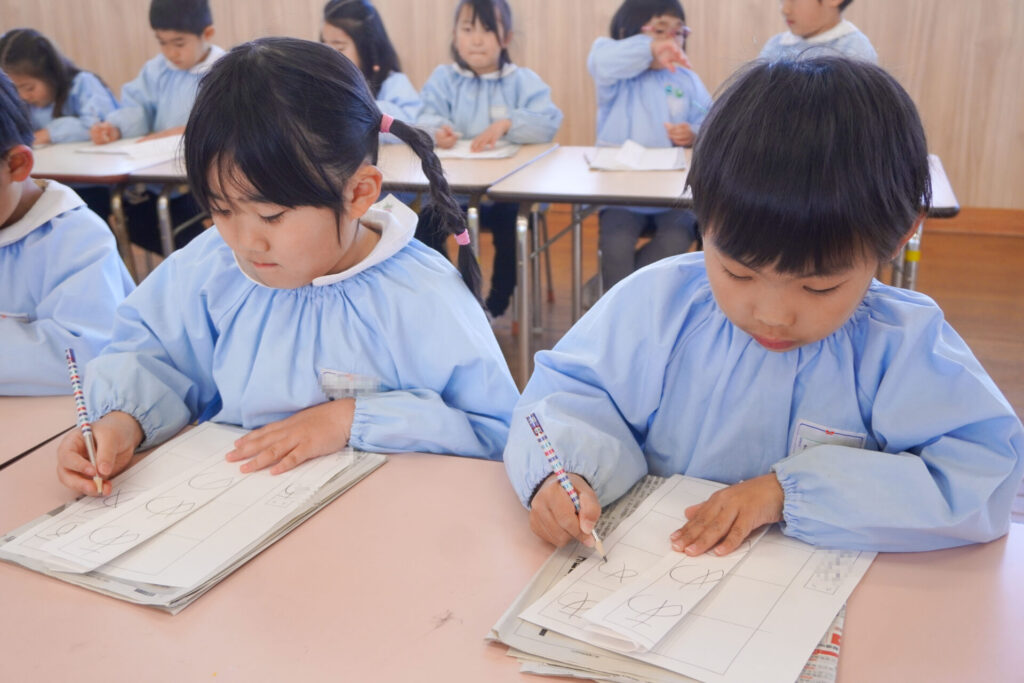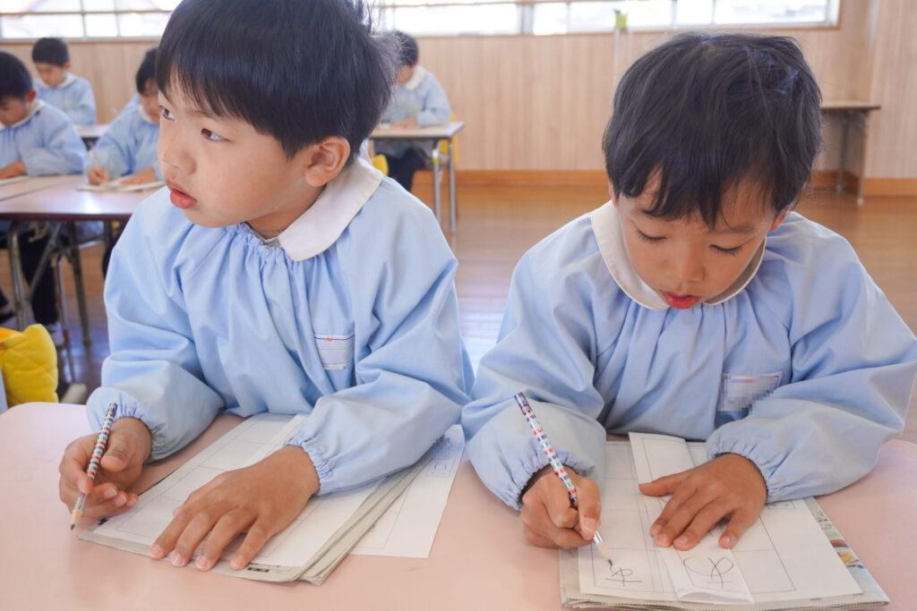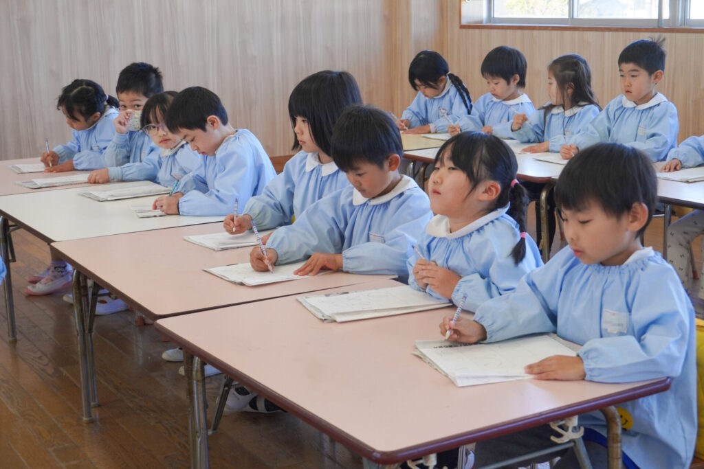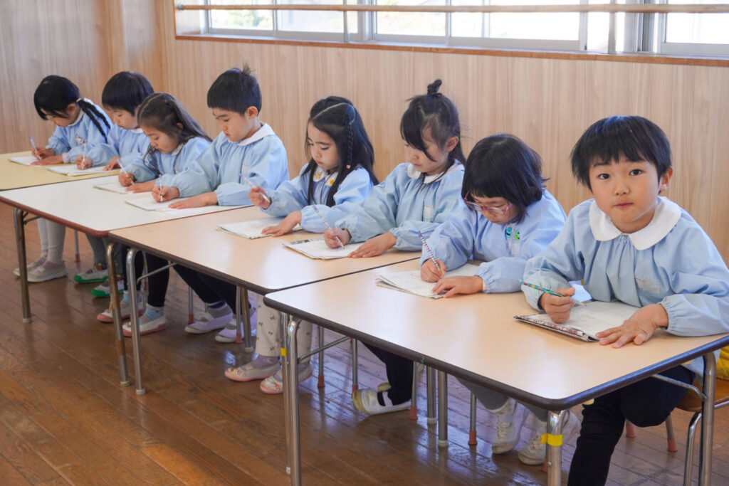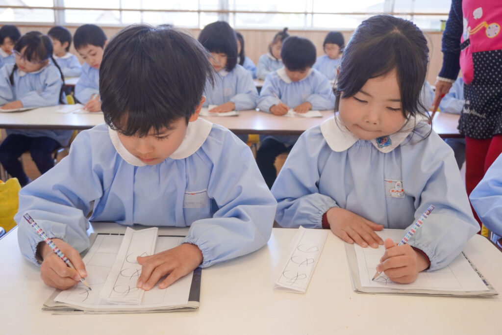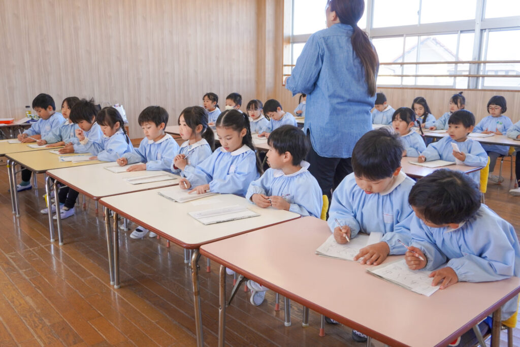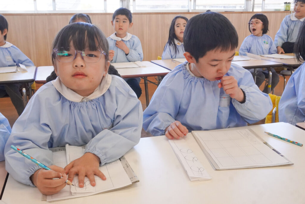 園での様子 書き方(年長) madokahp 2026年1月29日 今日は年長つき組の「書き方」です。年長になり、毎月、講師のよる書き方の指導を受け、平仮名50音のワークを元に、1文字1文字正しく覚えてきました。足を床につけ、お腹と背中は机・椅子それぞれから拳1つ分離す…これがベストな姿勢です。正しい姿勢を意識できるようになったことで、字に力強さが見られるようになりました。 今日はこれまでの集大成です。「あめのふるあさ」の文字を清書しました。平仮名の基本、とめ・はね・はらいがすべて詰まっている文字です。お手本を見ながら、1文字1文字、丁寧に力強く書きました。 枠いっぱいに平仮名を書けるようになり、講師の滝口先生にもたくさん誉めていただきました。 今日は3枚清書を書き、その中から「一番上手に書けた清書」を自分で選びました。その作品を来月の参観会で掲示予定です。保護者の皆さまに見てもらえるのを今から楽しみにしています。 園生活も残り少なくなりました。明日も幼稚園で元気いっぱい遊びましょうね。