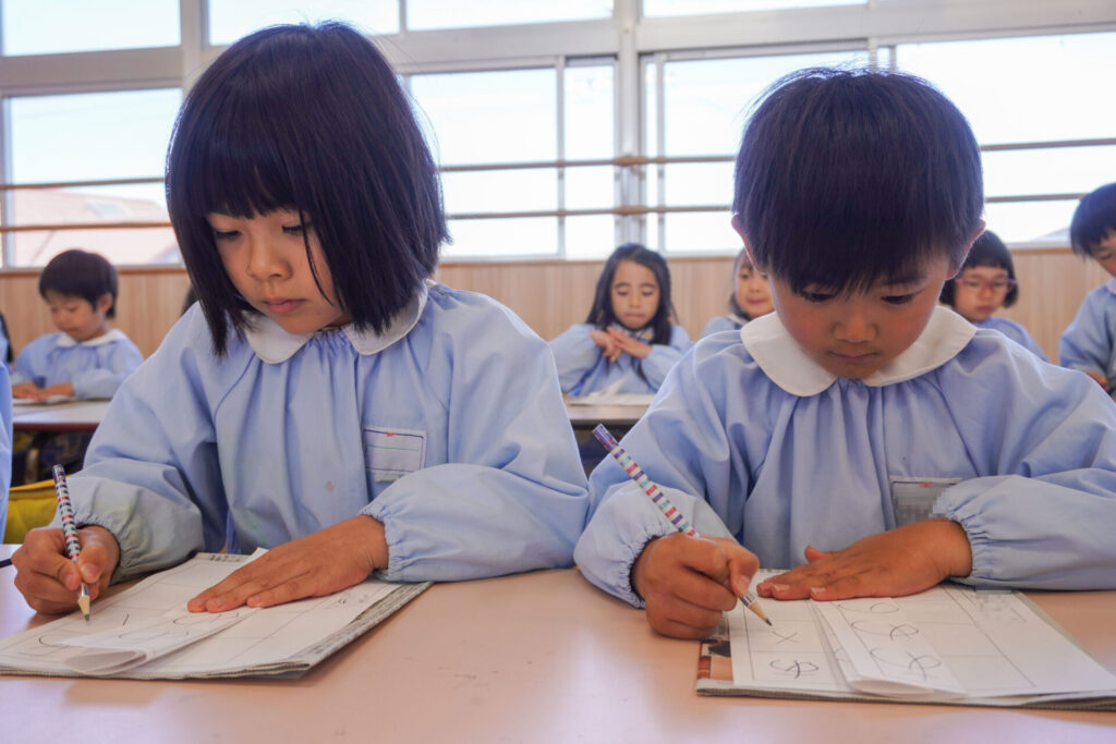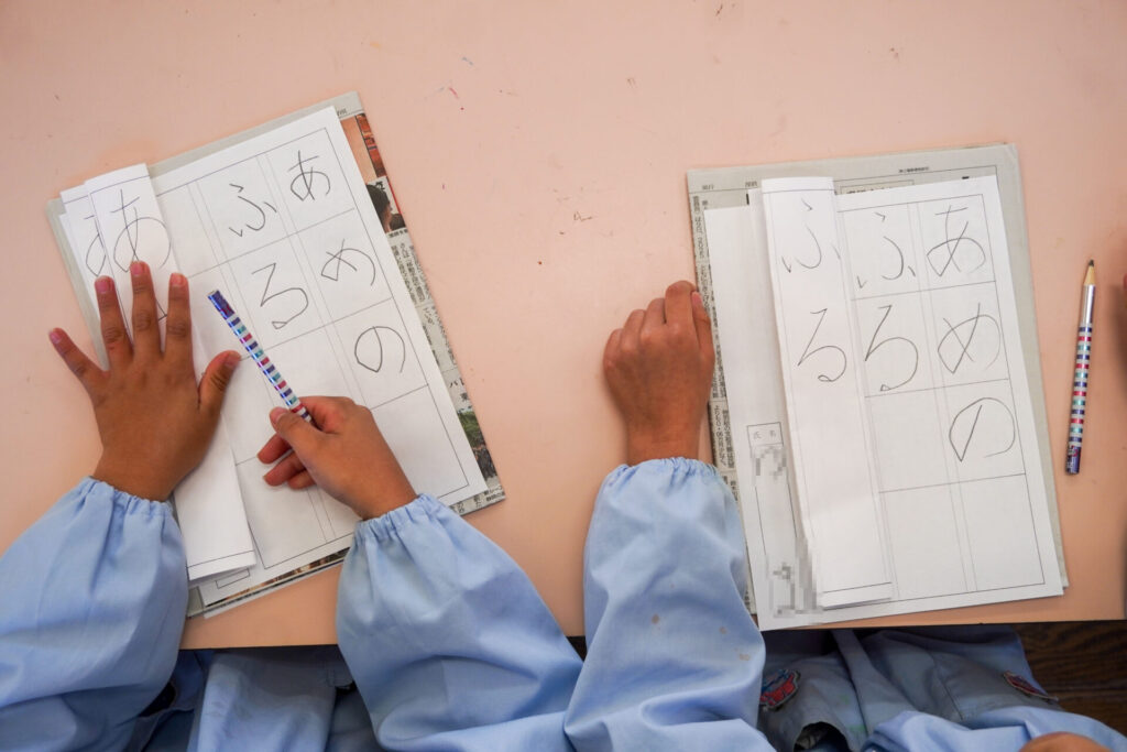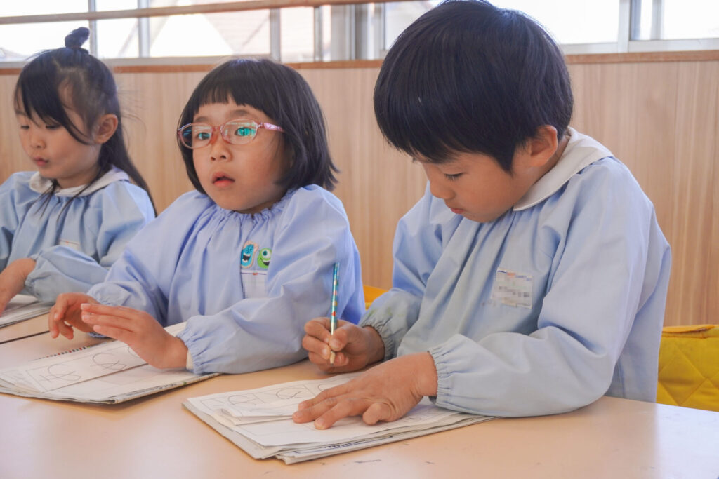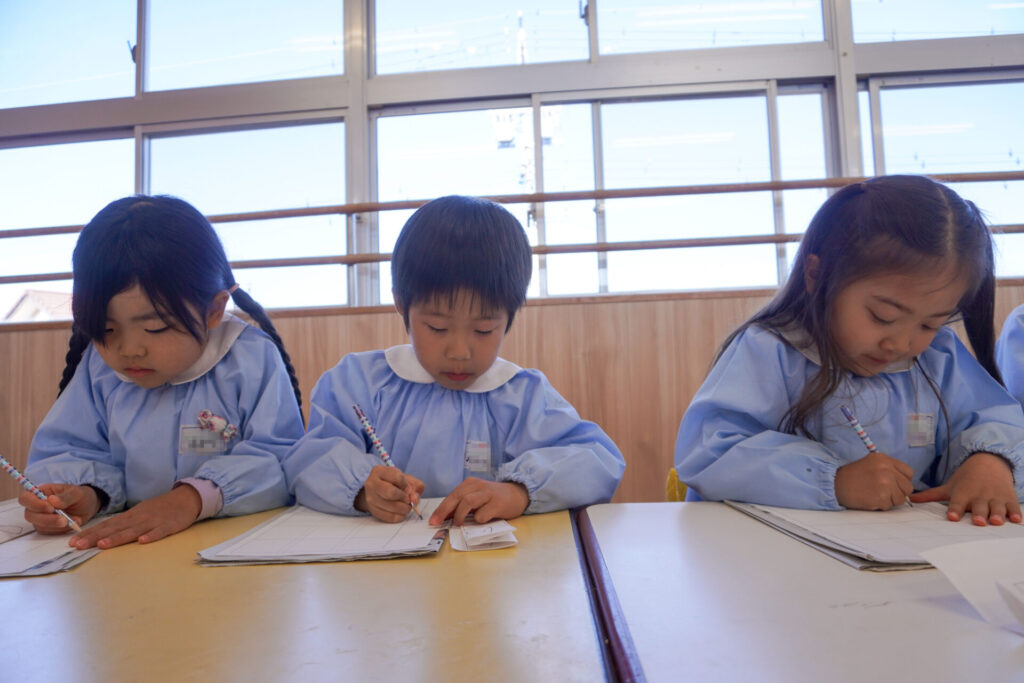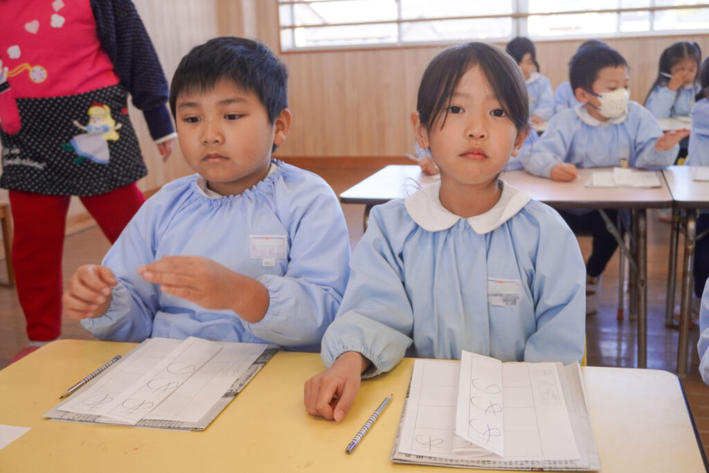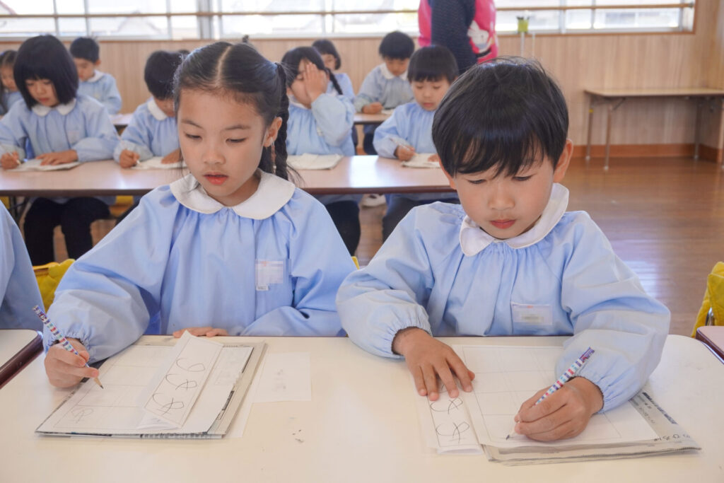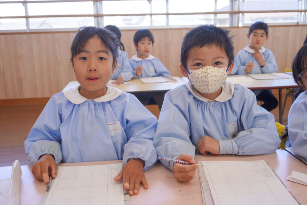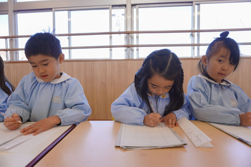 園での様子 書き方(年長) madokahp 2026年1月29日 今日は年長つき組の「書き方」です。年長になり、毎月、講師のよる書き方の指導を受け、平仮名50音のワークを元に、1文字1文字正しく覚えてきました。足を床につけ、お腹と背中は机・椅子それぞれから拳1つ分離す…これがベストな姿勢です。正しい姿勢を意識できるようになったことで、字に力強さが見られるようになりました。 今日はこれまでの集大成です。「あめのふるあさ」の文字を清書しました。平仮名の基本、とめ・はね・はらいがすべて詰まっている文字です。お手本を見ながら、1文字1文字、丁寧に力強く書きました。 枠いっぱいに平仮名を書けるようになり、講師の滝口先生にもたくさん誉めていただきました。 今日は3枚清書を書き、その中から「一番上手に書けた清書」を自分で選びました。その作品を来月の参観会で掲示予定です。保護者の皆さまに見てもらえるのを今から楽しみにしています。 園生活も残り少なくなりました。明日も幼稚園で元気いっぱい遊びましょうね。