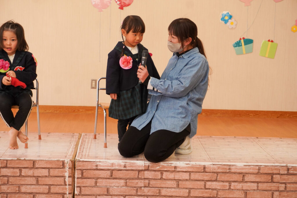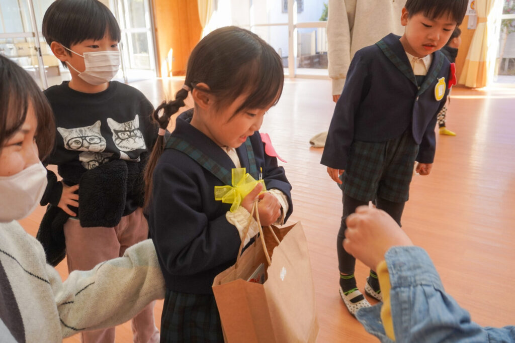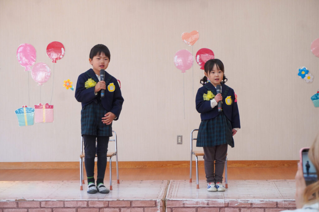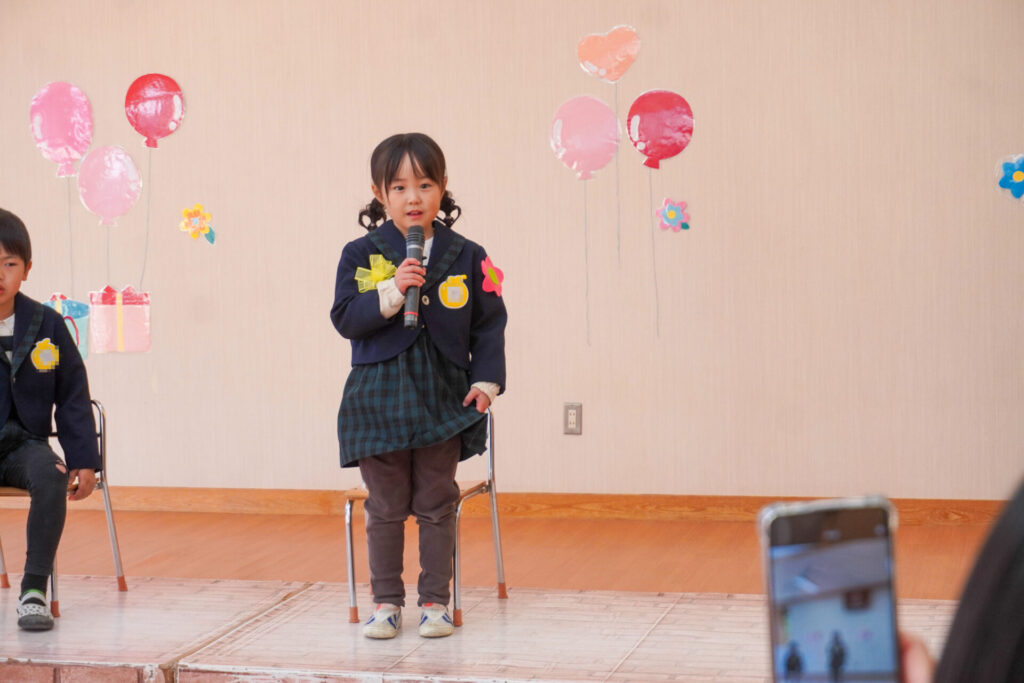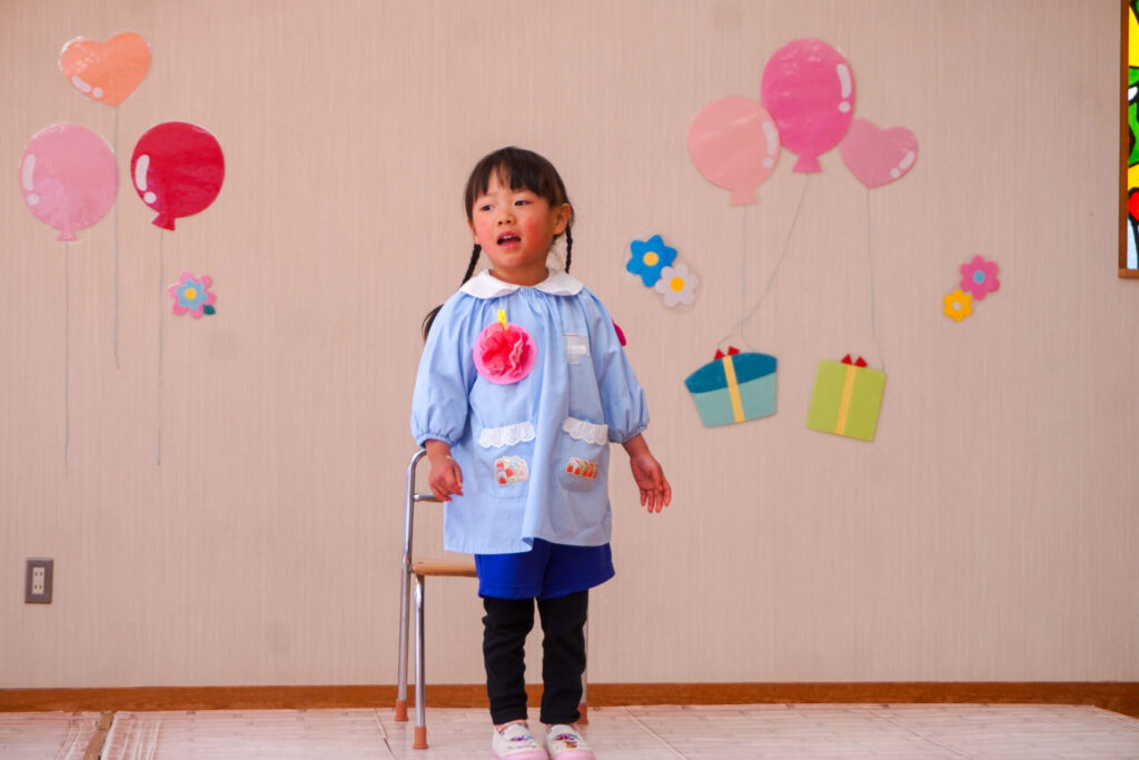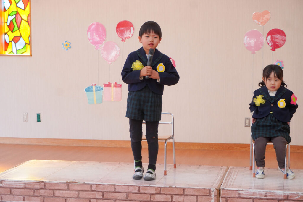 園での様子 誕生会(2月) madokahp 2026年2月4日 2月生まれの誕生会を行いました。主役の誕生児は、目印である花形の「ハッピーワッペン」を付けてもらい、誕生会を楽しみにしていました。 自己紹介ではマイクを持って堂々と、自分の名前や年齢が言えました。拍手をたくさんもらい、「おめでとう!」と言ってもらえて、嬉しそうでした。 おうちの方からの温かいメッセージも嬉しかったですね。「おめでとう」「ありがとう」のやり取りが温かく、微笑ましかったです。今日の日をこうして元気に迎えられ、そしてお祝いしてもらえて本当によかったですね。親子でのふれあい遊びでは、「くすぐったい!」と言いながらも笑顔いっぱいです。 恒例の今年の職員劇は「こぶとりじいさん」です!誕生児は夢中で見ていて、演じる側もより、力が入りました。時折、笑顔も見られましたね。 2月生まれの皆さん、お誕生日おめでとうございます!今日が「立春」、暦の上ではもう春ですが、まだまだ寒い日が続きそうです。これからもよく食べて、よく遊んで、よく寝て、すくすく大きくなってくださいね。保護者の皆さま、誕生会にご参加いただき、ありがとうございました。