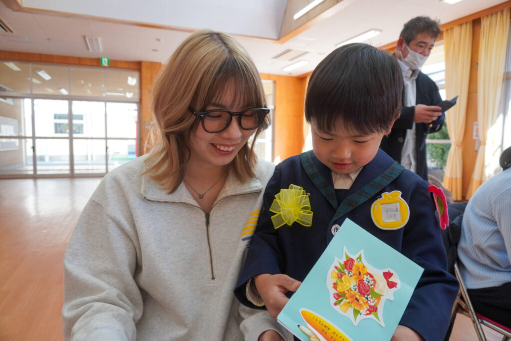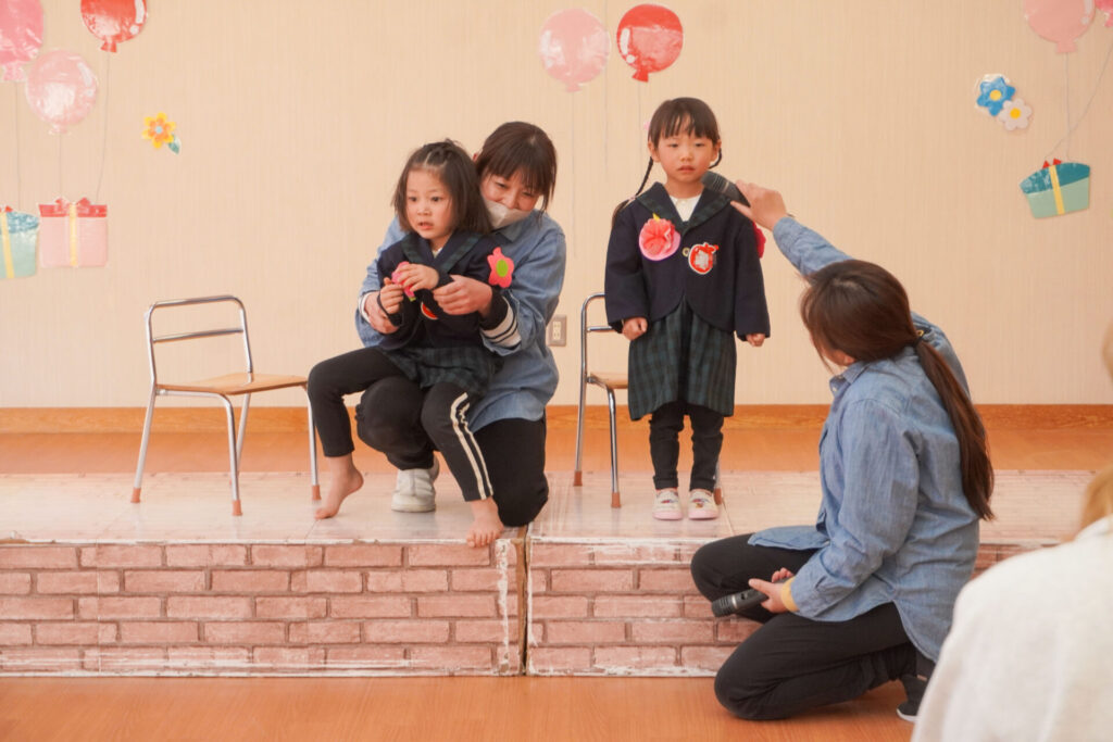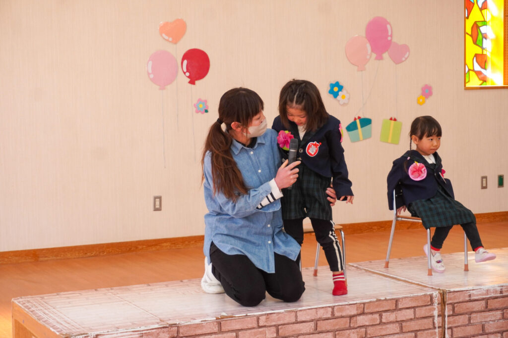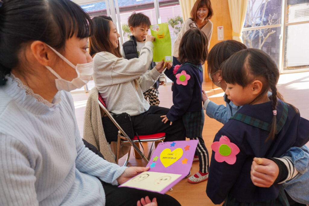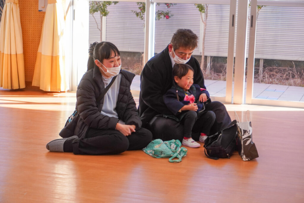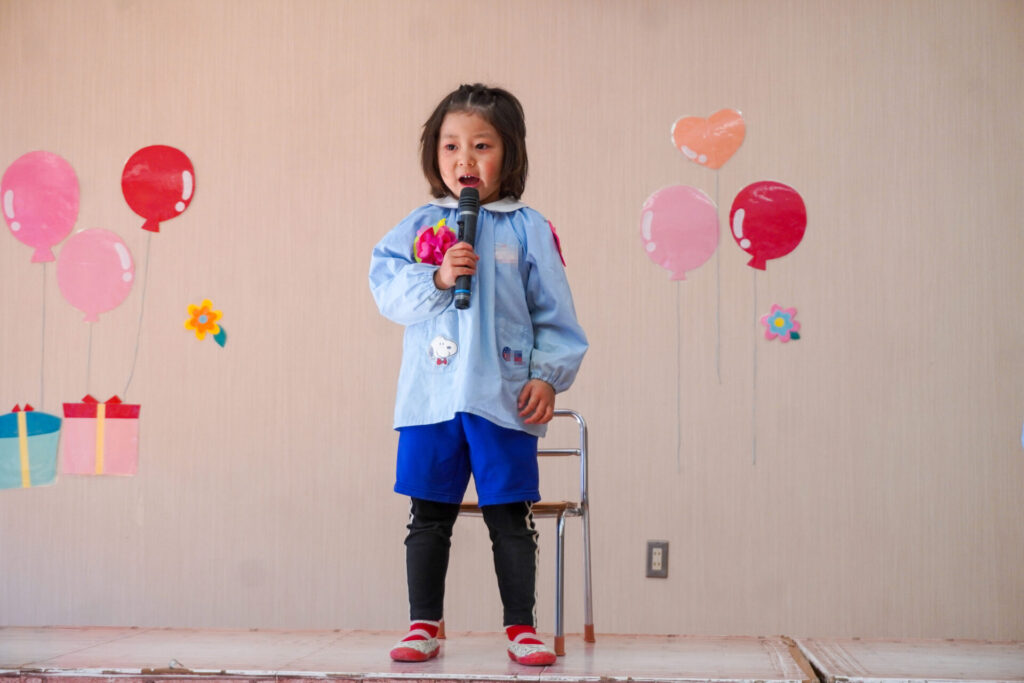 園での様子 誕生会(2月) madokahp 2026年2月4日 2月生まれの誕生会を行いました。主役の誕生児は、目印である花形の「ハッピーワッペン」を付けてもらい、誕生会を楽しみにしていました。 自己紹介ではマイクを持って堂々と、自分の名前や年齢が言えました。拍手をたくさんもらい、「おめでとう!」と言ってもらえて、嬉しそうでした。 おうちの方からの温かいメッセージも嬉しかったですね。「おめでとう」「ありがとう」のやり取りが温かく、微笑ましかったです。今日の日をこうして元気に迎えられ、そしてお祝いしてもらえて本当によかったですね。親子でのふれあい遊びでは、「くすぐったい!」と言いながらも笑顔いっぱいです。 恒例の今年の職員劇は「こぶとりじいさん」です!誕生児は夢中で見ていて、演じる側もより、力が入りました。時折、笑顔も見られましたね。 2月生まれの皆さん、お誕生日おめでとうございます!今日が「立春」、暦の上ではもう春ですが、まだまだ寒い日が続きそうです。これからもよく食べて、よく遊んで、よく寝て、すくすく大きくなってくださいね。保護者の皆さま、誕生会にご参加いただき、ありがとうございました。